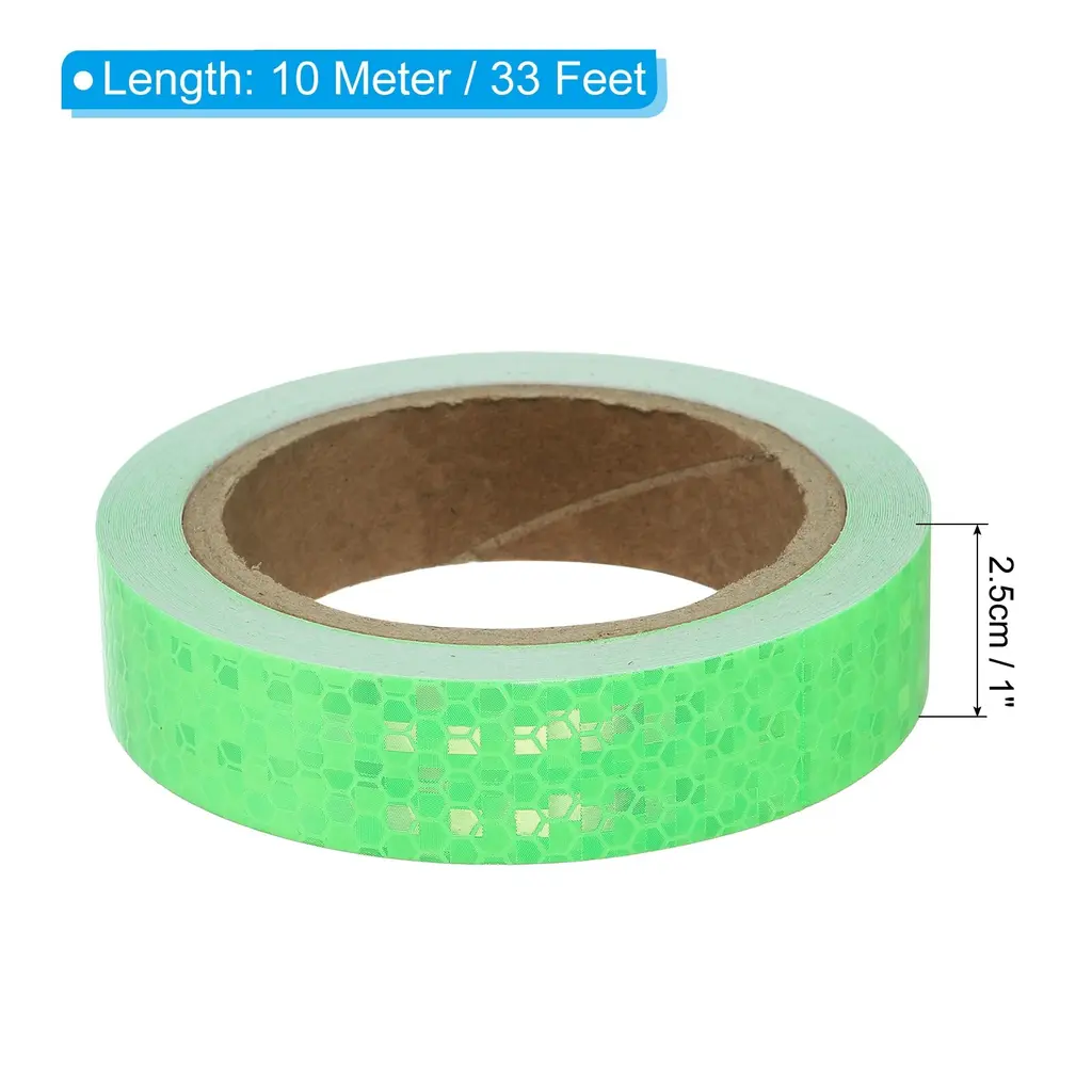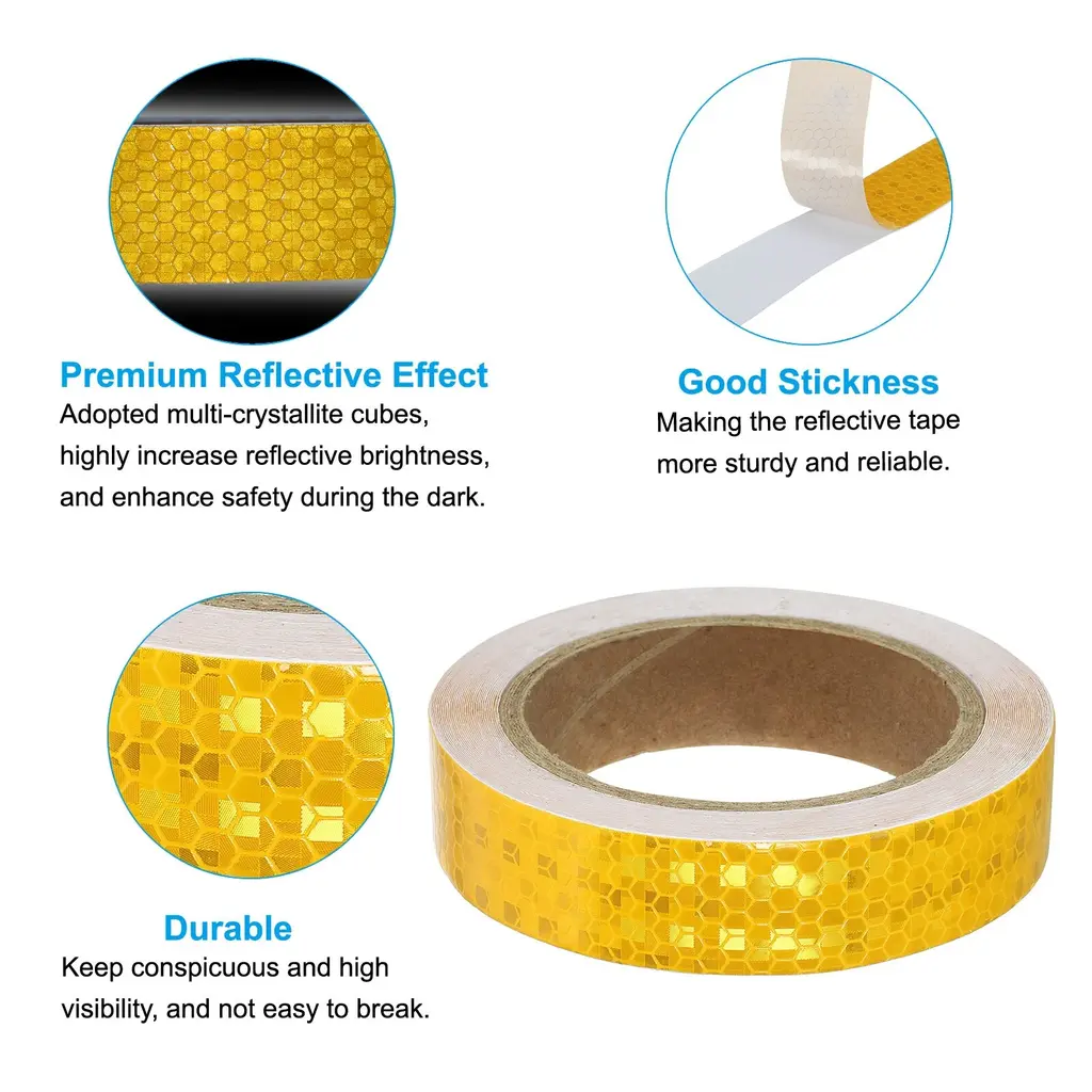 Reflective Tape is suitable for cars, trucks, trailers, bicycles, outdoors, offices, classrooms, hotels, shopping centers, garages, roads, factories, workshops, restaurants, machinery, car parks, warehouses, storage units, construction, boats, mailboxes, helmets, backpacks, railing, hiking, biking, cycling, jogging, etc.SpecificationColor: YellowMaterial: PVCSize: 10 Meter x 2.5 cm / 33 Feet x 1 Inch (L*W)Packing List: 1 Roll x Reflector TapeAdvantageMade of PVC material, lightweight and portable, high visibility, tough, durable, waterproof, resistant to dirt, grease, rain, and sun-fading, and easy to apply.Industrial strength adhesive withstands extreme temperatures and will not damage the elements. The tape reflects light to enhance your visibility and ensure your safety in the dark, which will significantly increase visibility day and night.InstructionSelf-adhesive, easy to use, high visibility, can also be used for people who need to be outside at night, especially suitable for the runner, pedestrian, cyclist, etc., making you be seen even in bad weather conditions like dark/rain/fog all the time.NOTE: 1. Please clean the dust and occlusion on the surface of the object before use. 2. The product itself does not emit light, it only reflects the light source. The stronger the light, the better the reflective effect.
