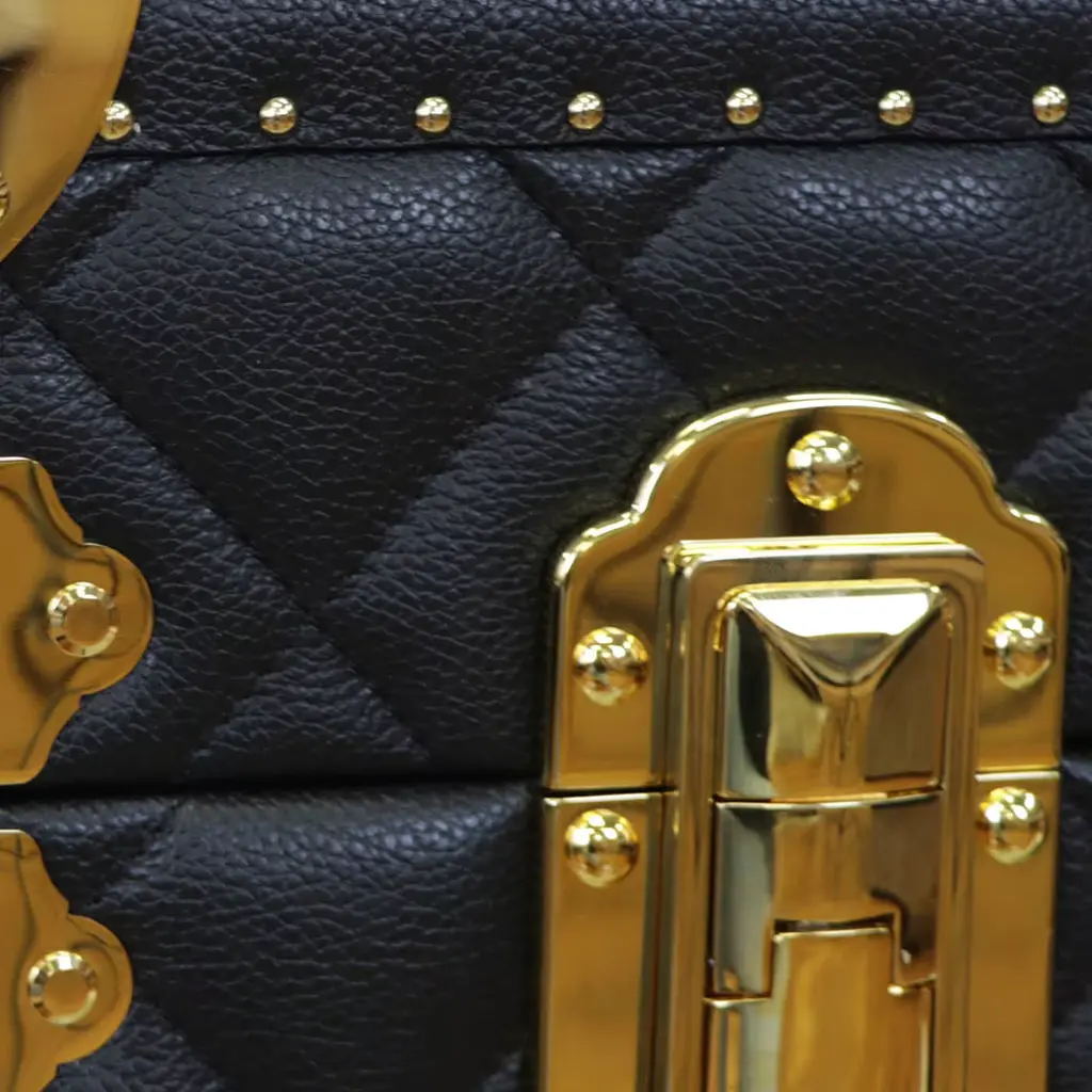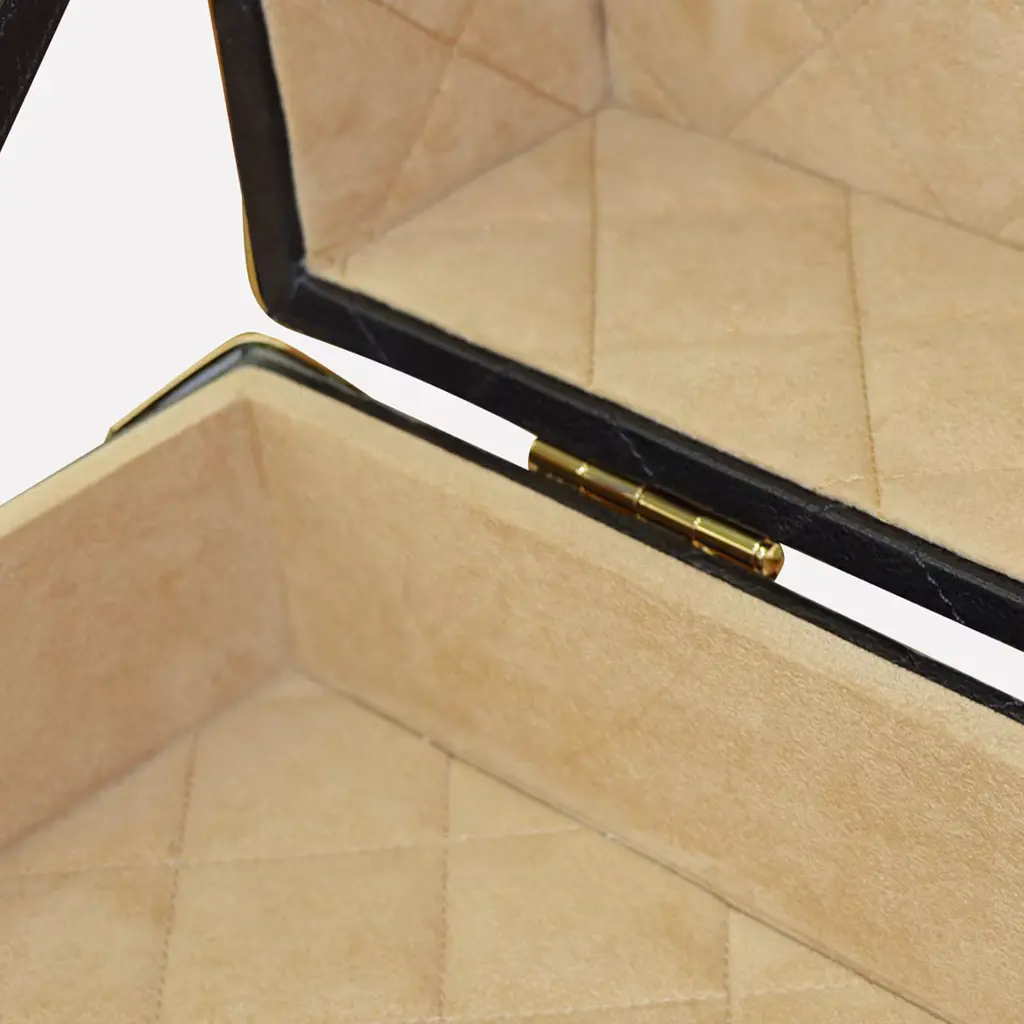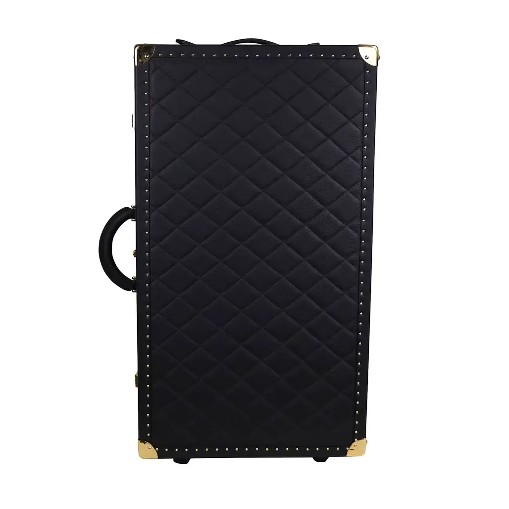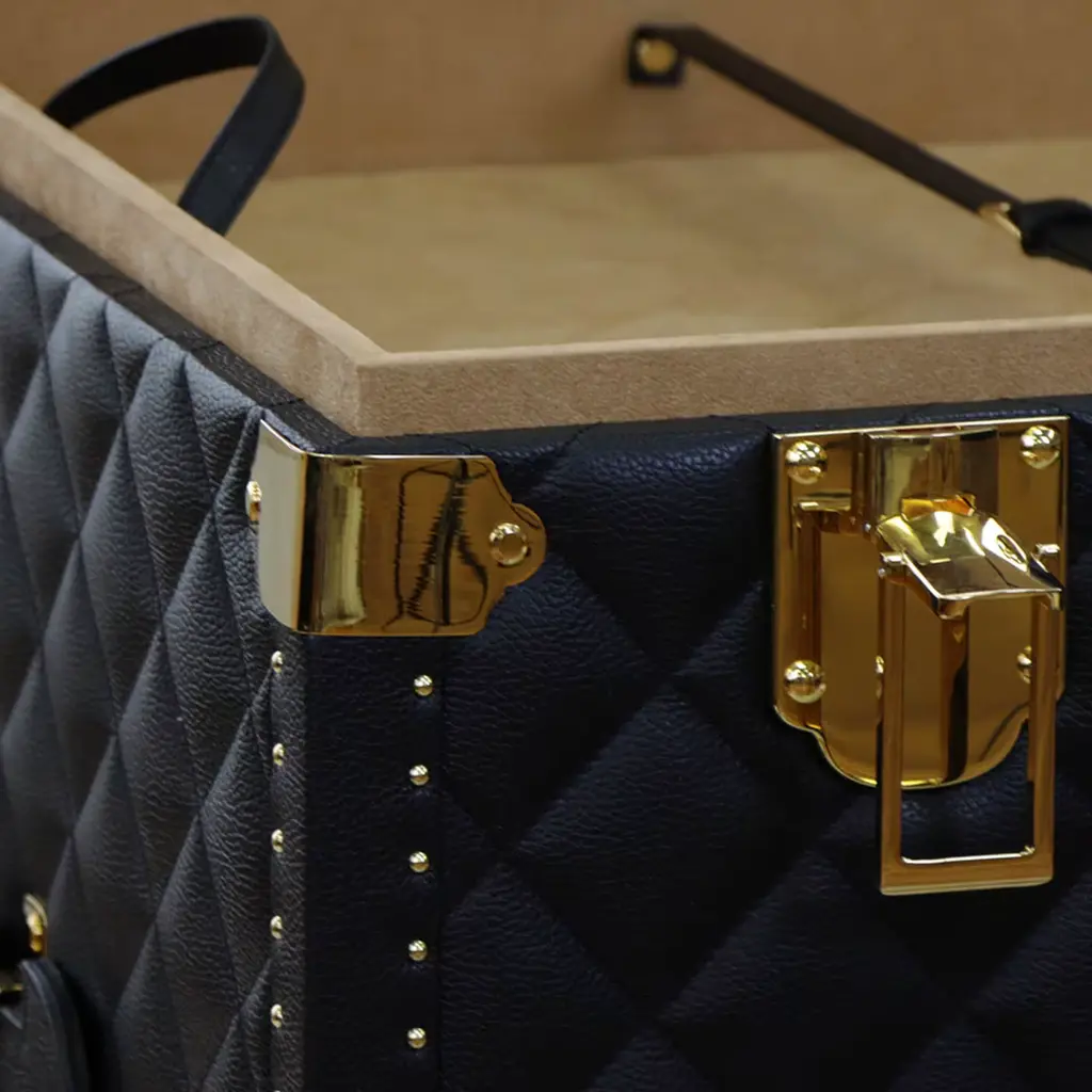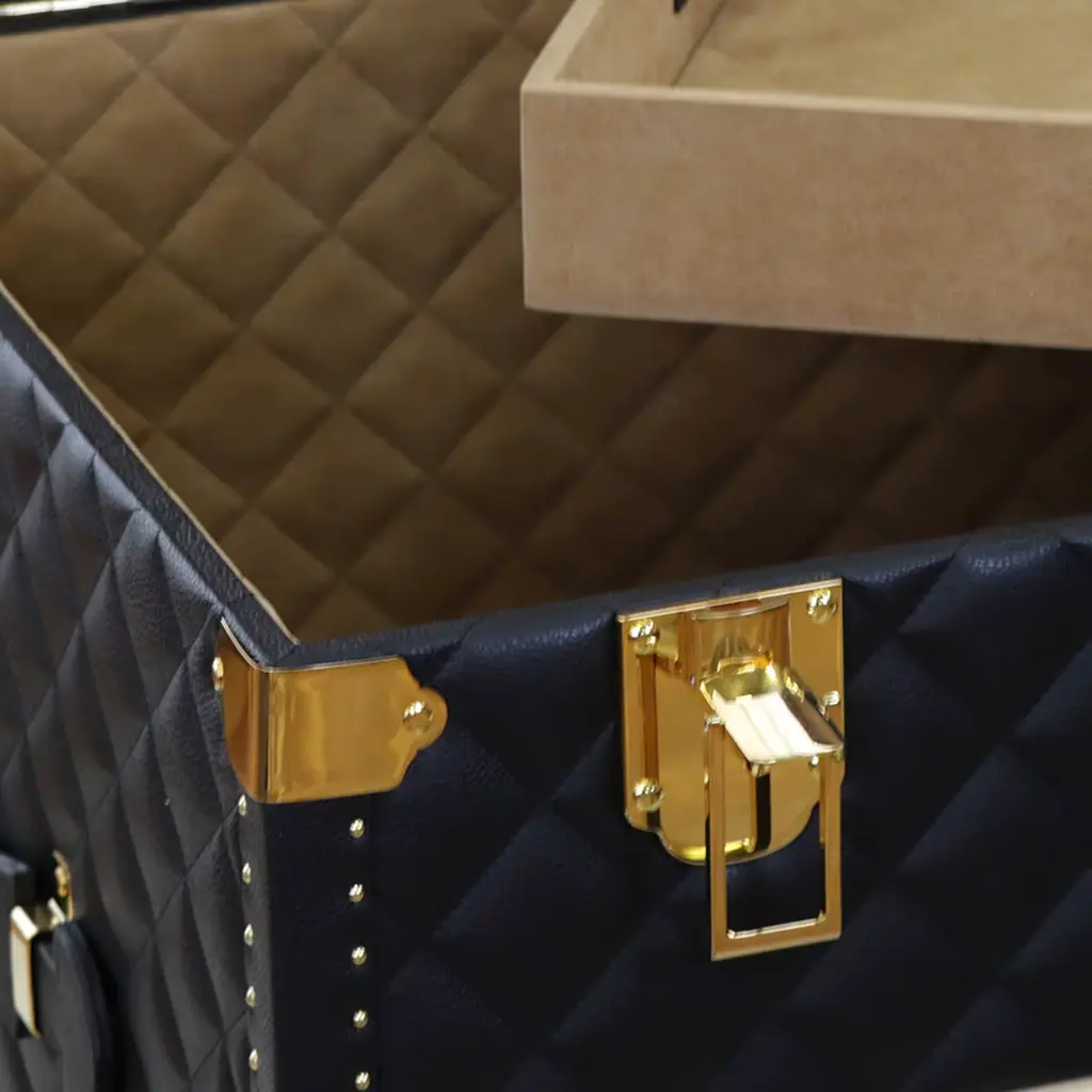 A plush addition to any bedroom decor and a trusted companion for travels, this regal artisan trunk boasts a design of utmost sartorial value. Wrapped in quilted blue leather and adorned with golden corner caps, studs, and other small details, it opens to reveal a wide storage unit with a false bottom where to store clothes, shoes, accessories, and other personal belongings. Equipped with side handles and key lock.