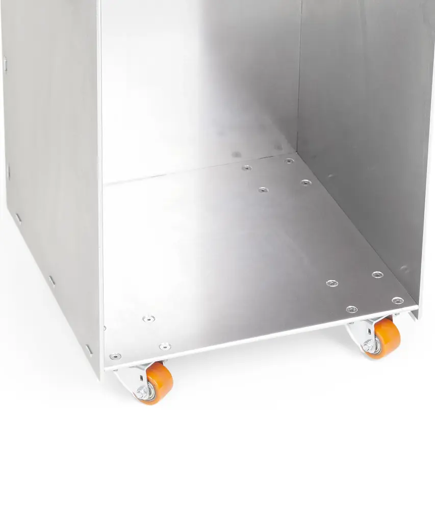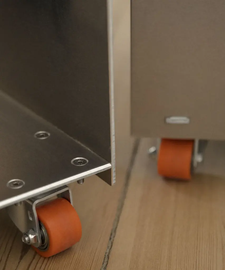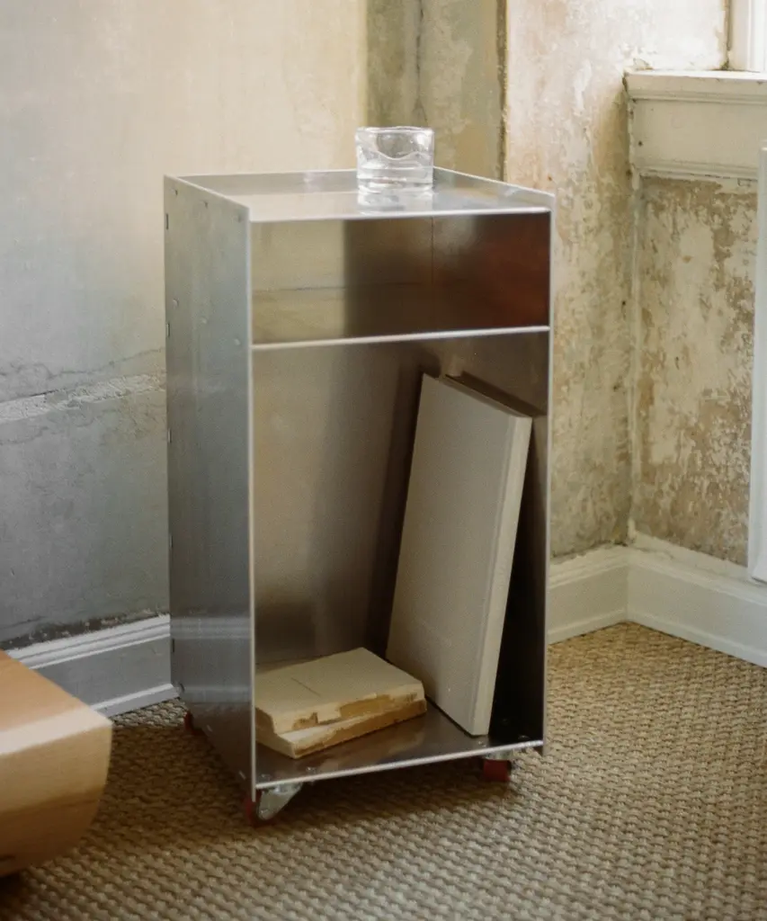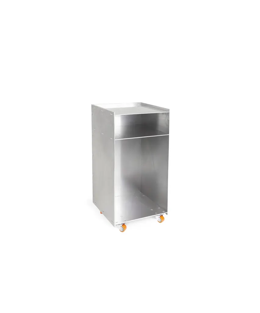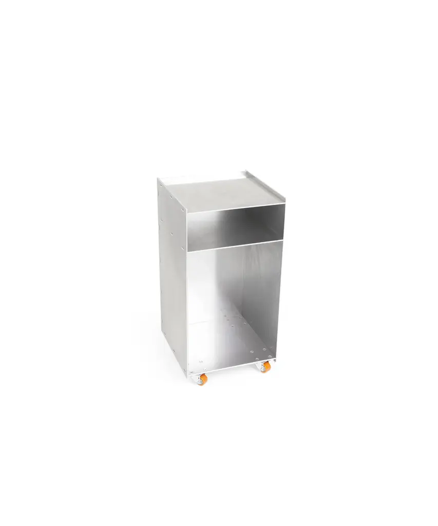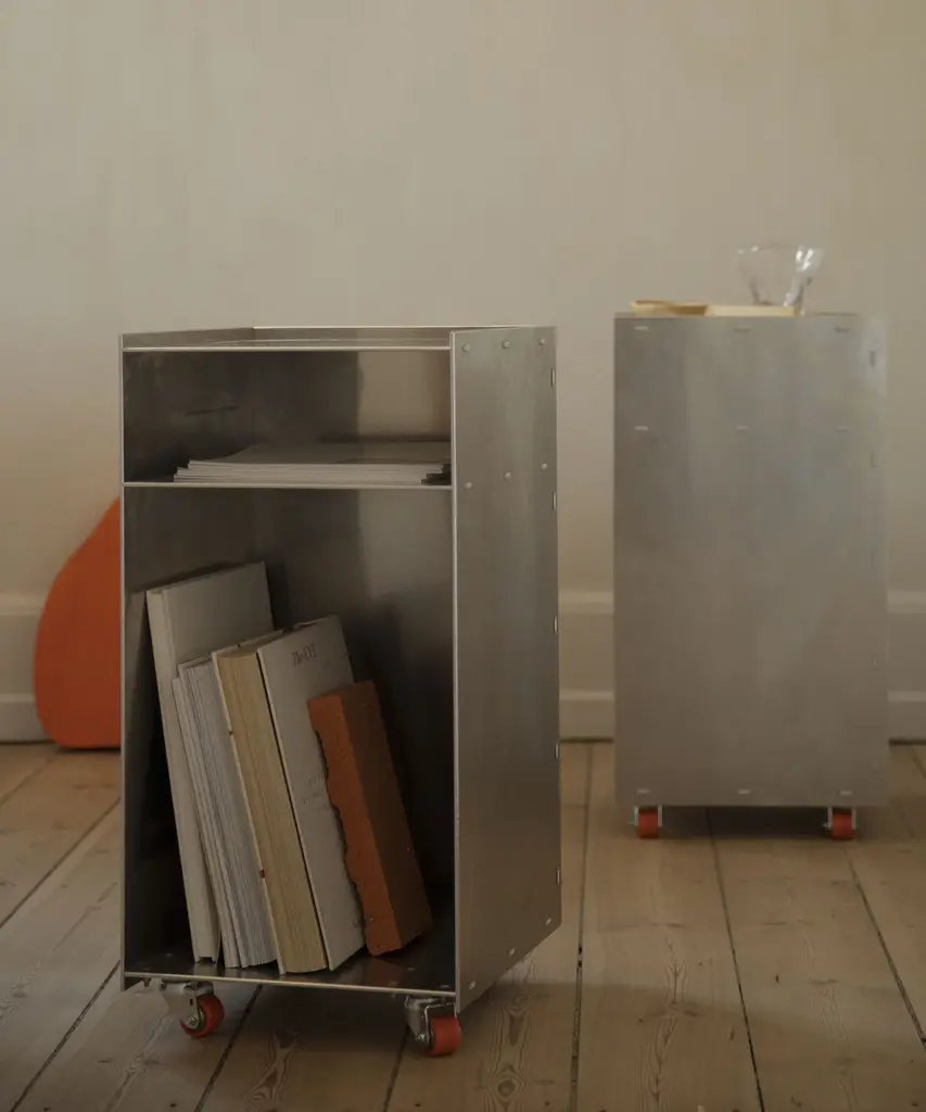 Rivet Cart is a raw aluminum storage piece with hand-hammered rivets on bright orange wheels - an elegant and versatile addition to FRAMAs Rivet Series. The easy-to-transport mobile cart features a tray-top with two open shelves below, combining traditional furniture craftsmanship and modern industrial production. Thanks to its sturdy construction, this timeless piece can be used as a table, storage unit, pedestal for display, or a combination of all three. Designed by Jonas Trampedach for Frama - an interior and product design studio based in Copenhagen. The studio is a dynamic testing ground for new designs and projects, embodying their classical, yet boundary-pushing approach.