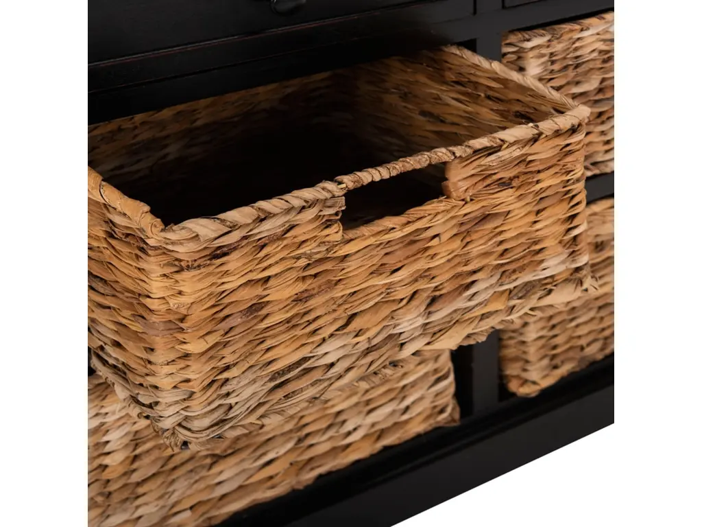 Country charm with an easygoing twist characterizes this storage unit. With its four removable woven baskets and pine construction, storing or finding what you need has never been easier.