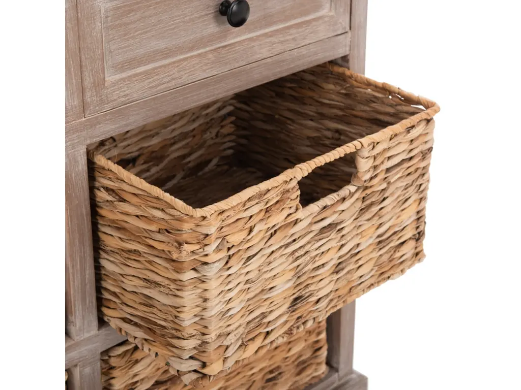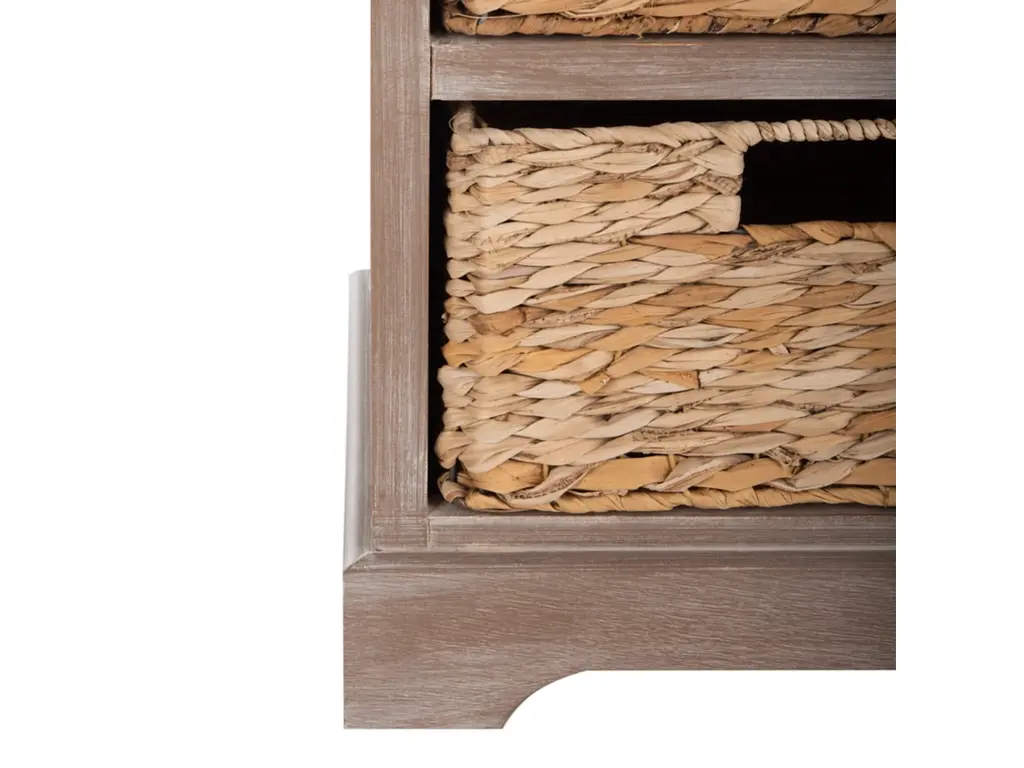 Country charm with an easygoing twist characterizes this storage unit. With its four removable woven baskets and pine construction, storing or finding what you need has never been easier.