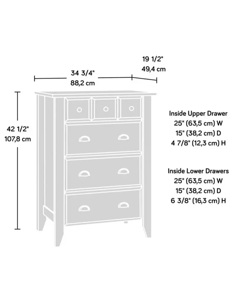 Lots of clothes and nowhere to put them? Add some stylish storage to your home with this chest of drawers from the Shoal Creek® collection. With four deep drawers that open and close on smooth metal runners with safety stop features, this dresser will hold a ton of clothes and accessories. Well, not literally a ton, but it will hold a lot! Finished in a charming Oiled Oak®, this chest is sure to charm and keep your bedroom tidy.Features:Finish: Oiled OakSafety tested for stability to help reduce tip-over accidents.Drawers feature metal runners and safety stops to keep you and your family safe.Quick and easy assembly with patented T-lock drawer systemThis chest has been thoroughly tested in an ISO 17025 accredited lab that is Underwriters Laboratories certified.Interlocking safety mechanism allows only one drawer open at a time.This chest complies with ASTM F2057-23 Standard Safety Specifications for Clothing Storage Units as required by the STURDY Act. (Applies to items purchased with a manufactured date of 09/2023 or later printed on the carton.)Material: Engineered WoodSpecifications:Product Weight: 120.946Number of Drawers: 4Dresser Type: Vertical DressersProduct Dimensions: 42.5 in. H x 19.5 in. D x 34.75 in.Weight Capacity: 40 lbs