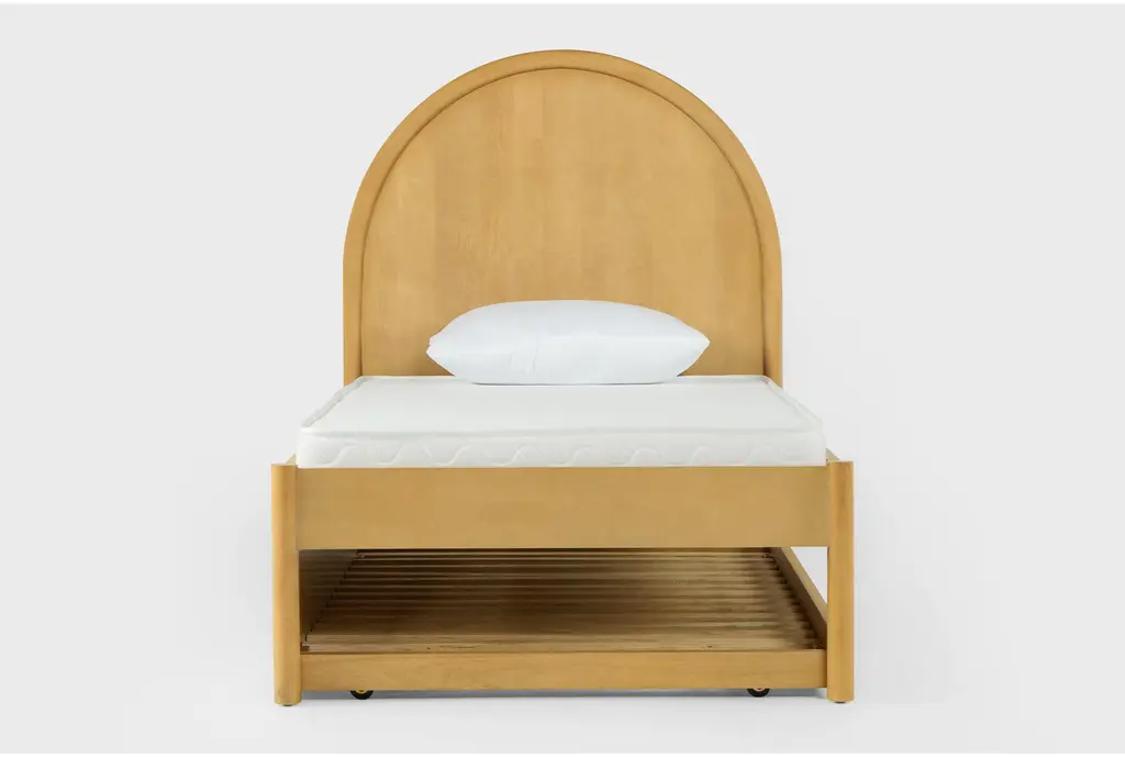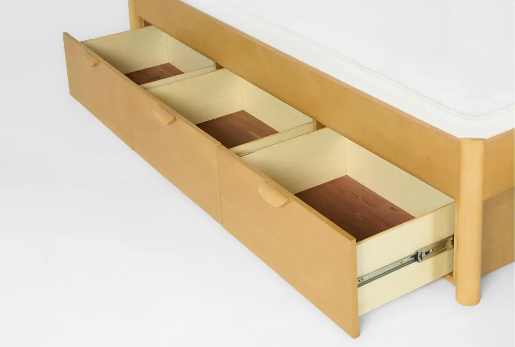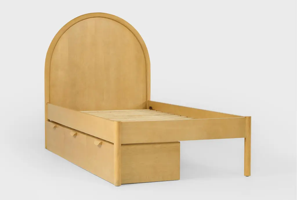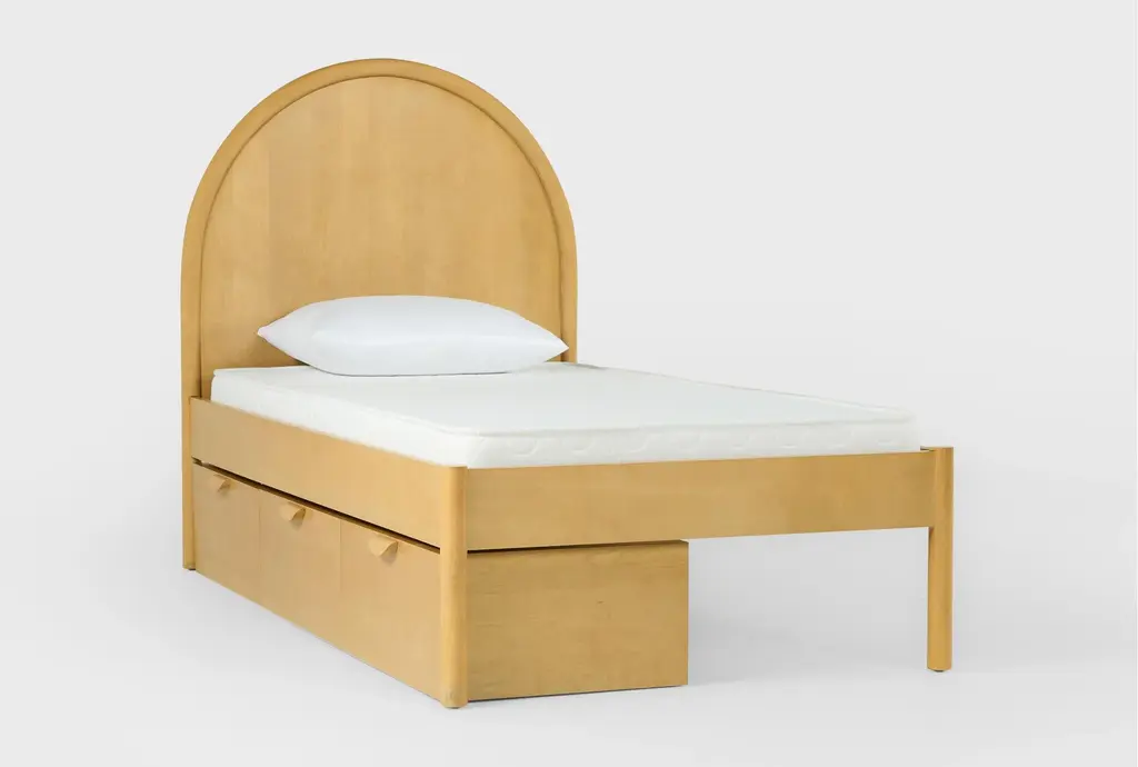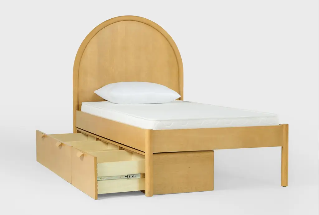 The Seren Twin Wood Platform Bed with Single 3-Drawer Underbed Storage Unit is perfect for any kid's room. Designed with a Scandinavian aesthetic, this bed combines functionality and style. It is made with birch veneer and solid rubberwood, ensuring durability and a natural look.