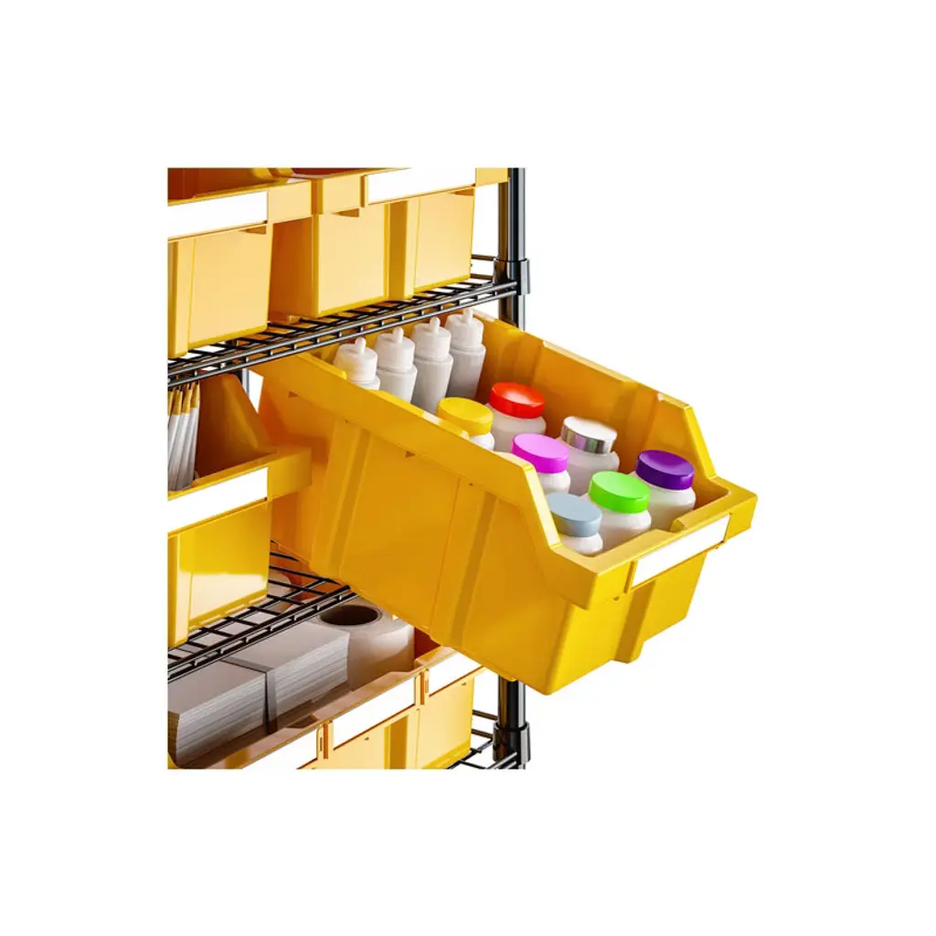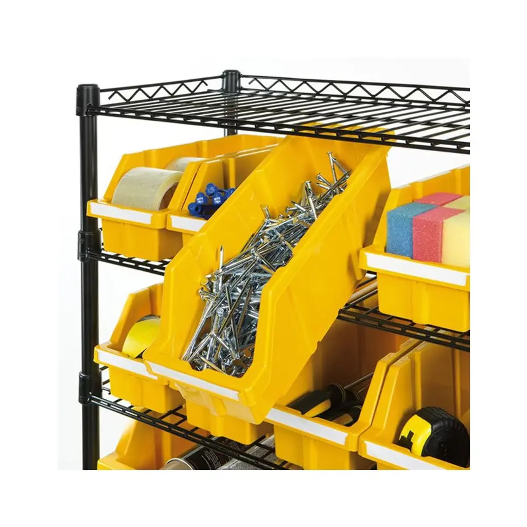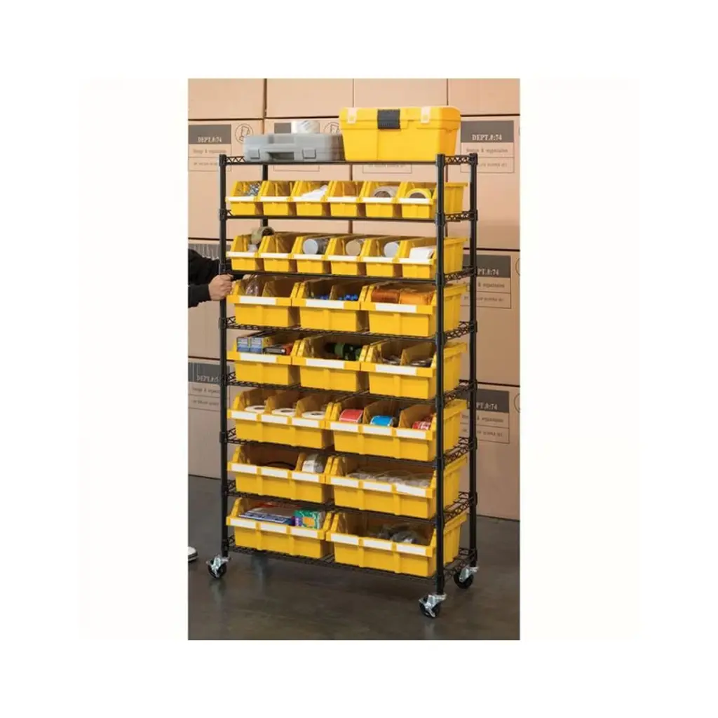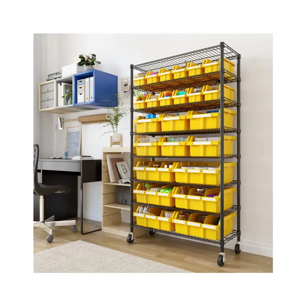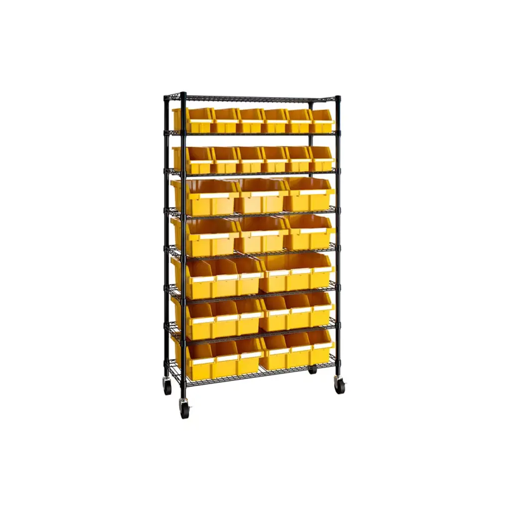 Organize your space with the Seville Classics 8-Tier NSF 24-Bin Rack. This heavy-duty bin rack organizer is constructed from commercial-grade steel and measures 36" W x 14.25" D x 63.5" H. The seven steel wire shelves and four steel poles/posts (1" diameter) are coated in a durable epoxy finish for protection against corrosion in dry environments. This patented design features 24 high-impact polypropylene (HIPP) bins (6 X-Large, 6 Large, and 12 Medium) that allow for easy accessibility to your items. Featuring four 3" heavy-duty rubber wheels (two locking). This bin rack system is versatile ranging from home offices, laundry rooms, living rooms, garages, art studios, craft rooms, warehouses, businesses, offices, kitchens, restaurants, mail rooms, and schools.