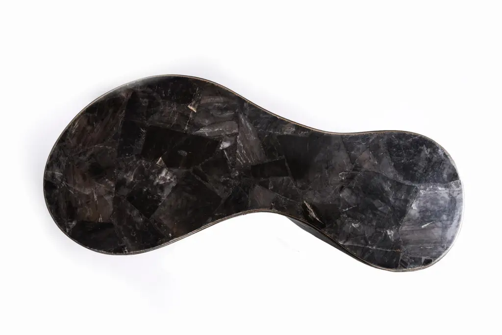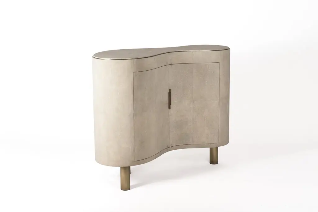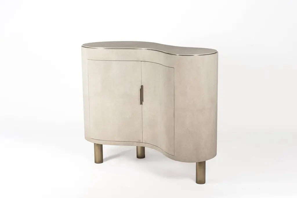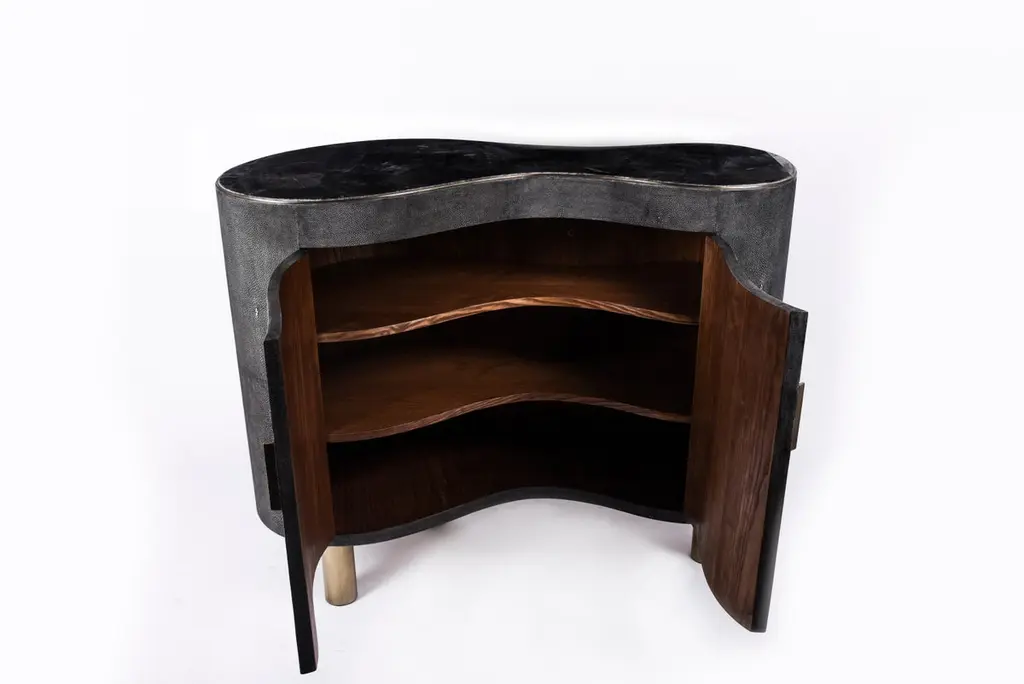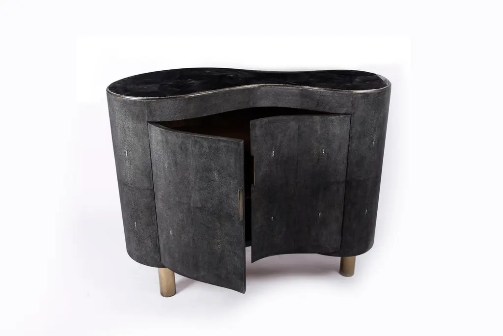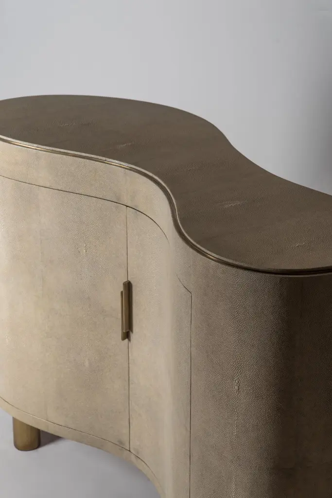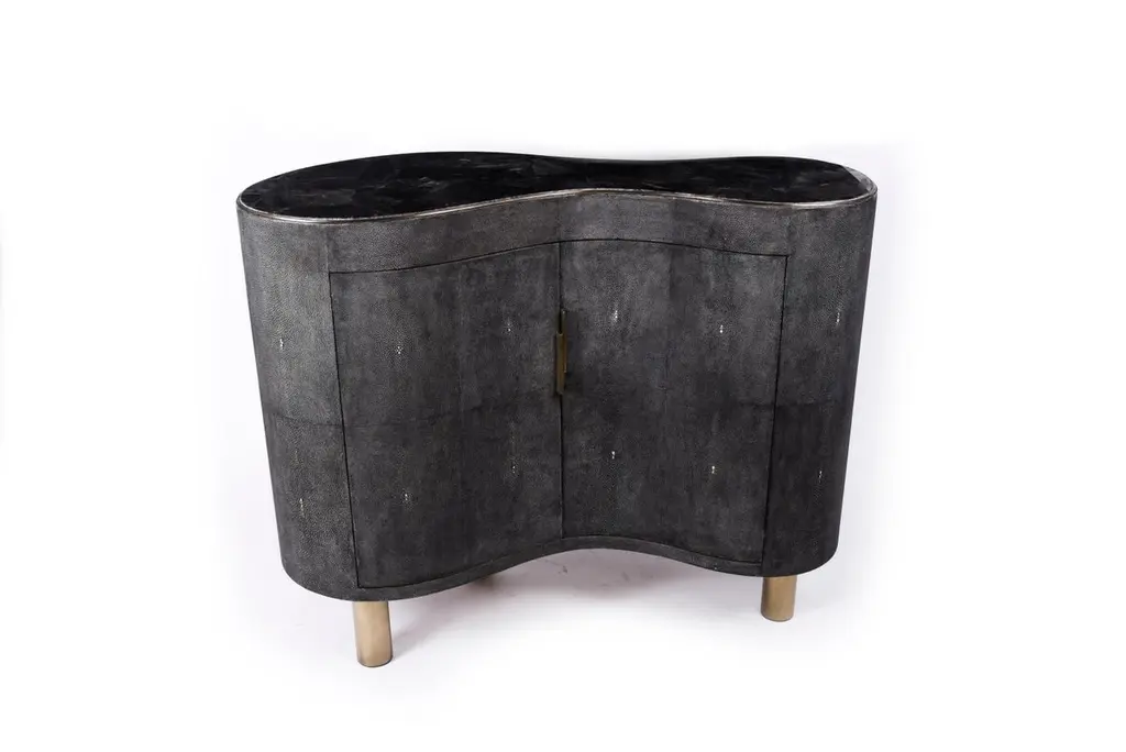 The Paris based label has distinguished themselves since their launch, with their iconic use of shagreen mixed with brass and other exotic materials. All furniture is handcrafted by skilled artisans, ultimately making each piece unique, designed in Paris and produced in the Philippines.The constellation commode is the perfect storage unit or bar unit for a living room or dining area. The amorphous shaped piece is completely inlaid in cream shagreen. The piece sits on a pair of tubular bronze-patina brass legs. The interior is inlaid in gemelina wood and features two adjustable/removable shelves shaped like the piece. The piece is accented by discreet flat bronze-patina brass handles to open and close the commode. Available in black shagreen with a Smokey black quartz top, see images at end of slide.The dimensions of this piece are 109 x 47 x 90 cm / 43 x 18 x 36”All Kifu Paris pieces are handmade by artisans, ultimately making each piece unique. Custom color/sizing available on request. Wipe clean with soft dry cloth.Although inspired by her parents, her collection of home accessories and furniture is a distinct identity of its own. Kifu uses handmade techniques of elaborate inlay patterns of shagreen, shells, semi-precious stones, materials she experienced as a child growing up in her parent’s studio, but interpreted in a younger quirkier way reflecting her youth. From her "jewelry inspired knobs" on decorative boxes, gold bar boxes and an extravagant inlay pattern mix of shagreen and shell inspired by galactic constellations, as seen on her enormous round mirror, is refreshing to see. Kifu embodies whimsical elements throughout her collection and is not afraid to be daring and unexpected in her approach to design.All shagreen-covered items should be kept out of direct sunlight, color variants may occur on the stingray and other exotic finishes, but this showcases the Parisian label's commitment to creating authentic luxurious products using natural components.