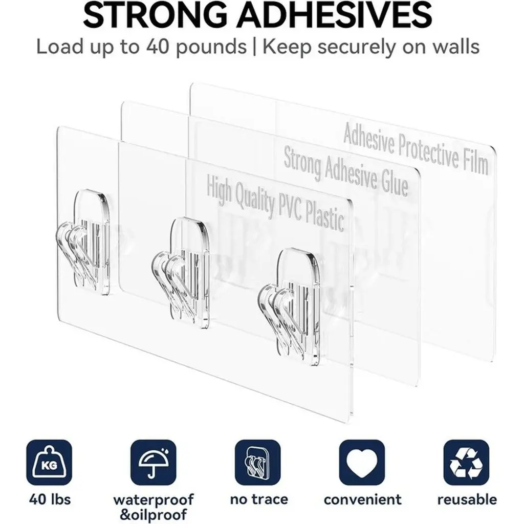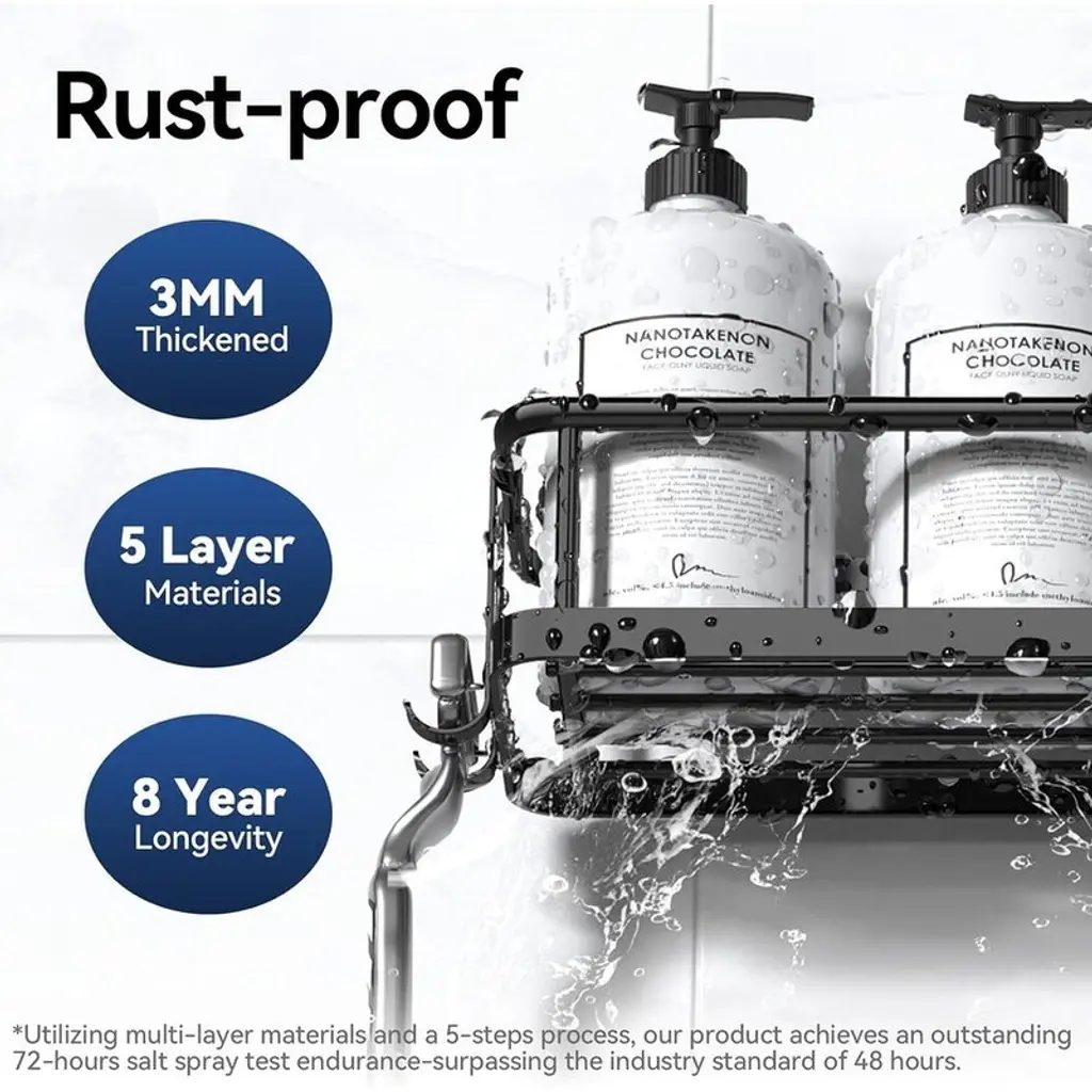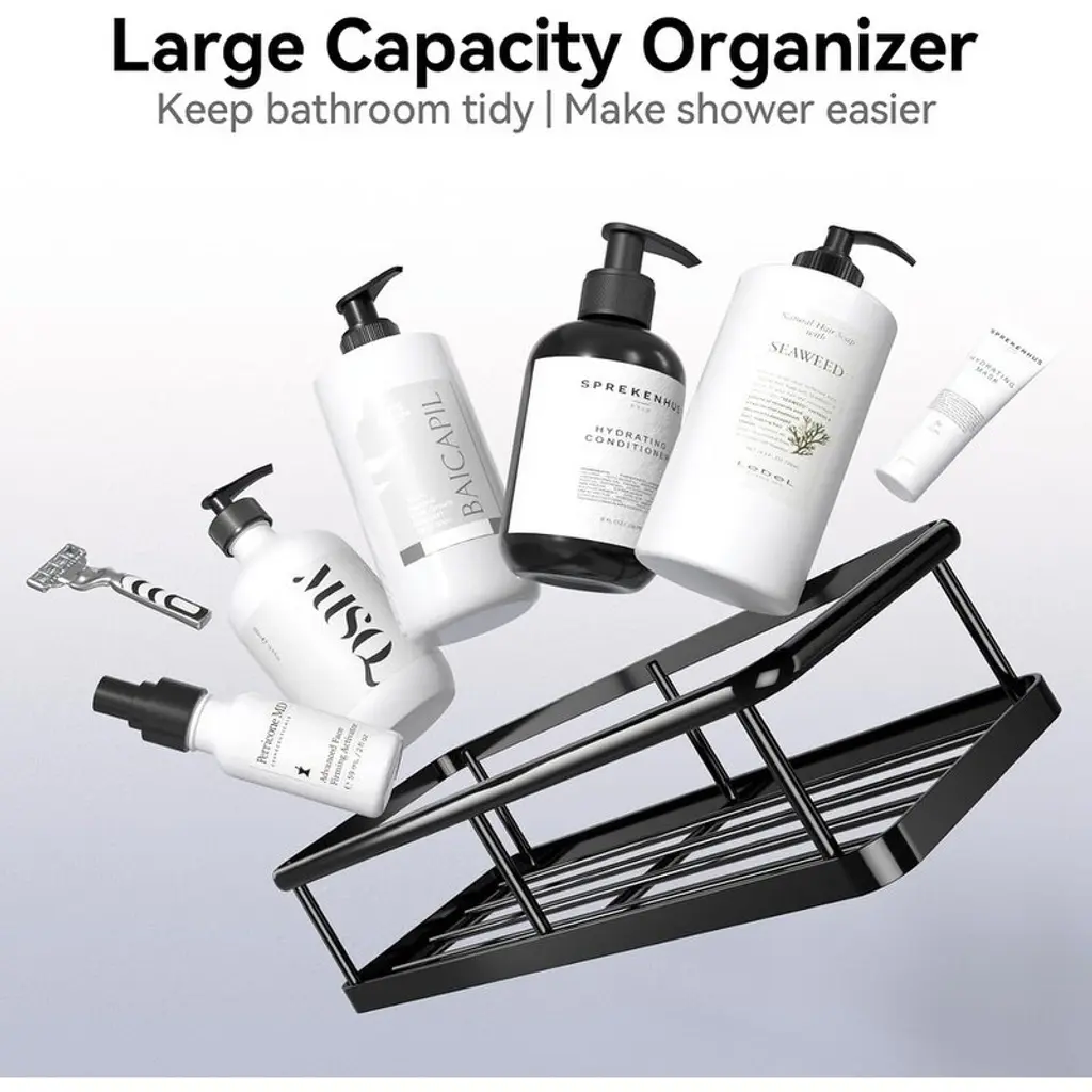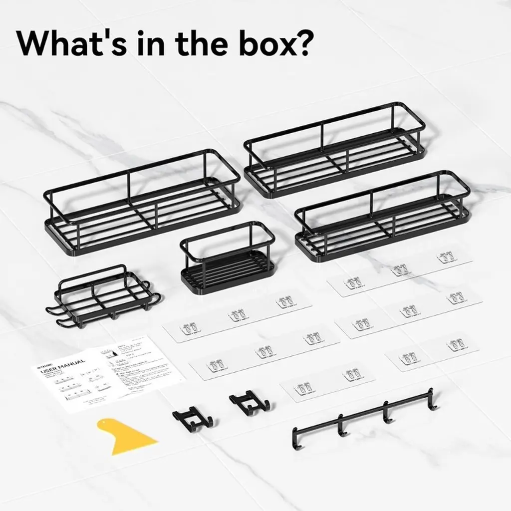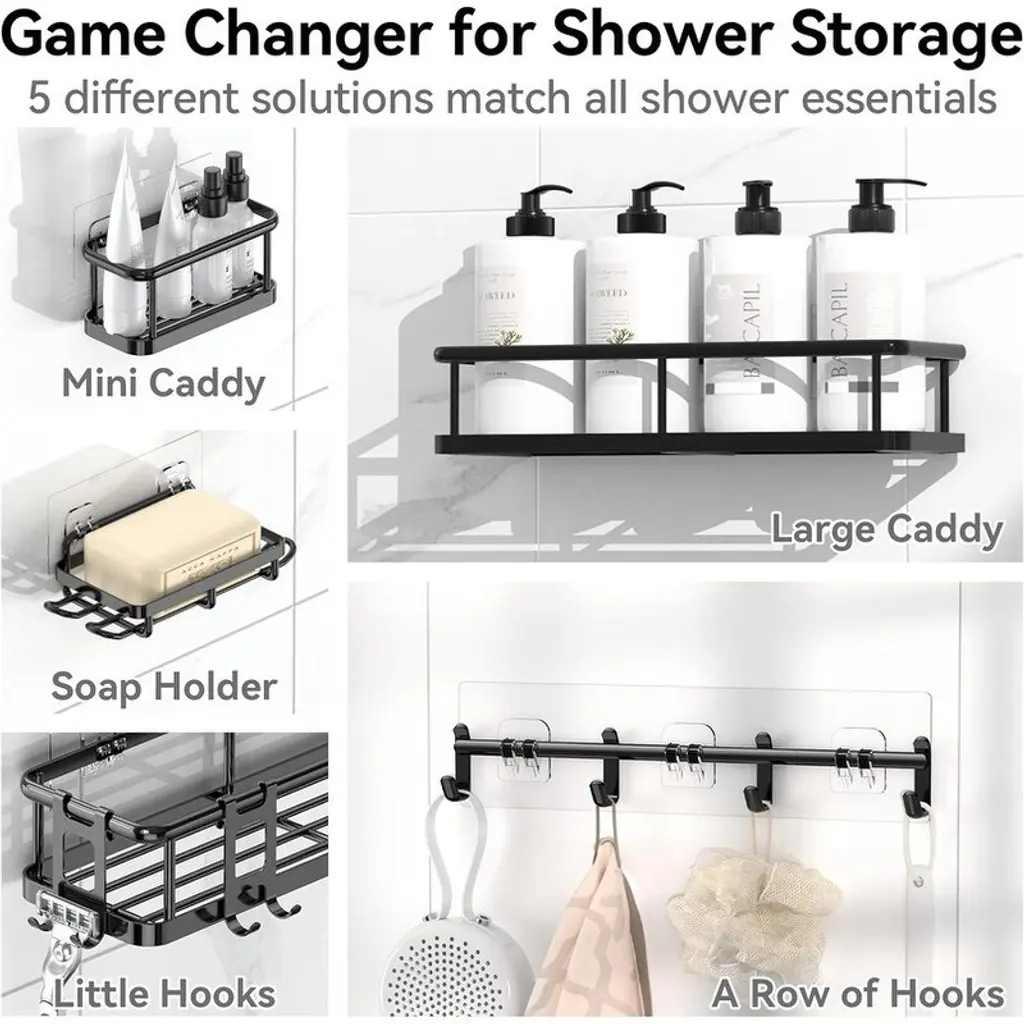 Complete 6-Piece Shower Organizer Set – Includes caddies, mini caddy, soap holder, adhesive tapes, and hooks for flexible storage combinations. Effortlessly organizes all shower essentials while maximizing limited bathroom space.Premium Waterproof & Rustproof Material – Made from high-grade, scratch-resistant material designed to last up to 8 years in humid conditions. Features drainage-friendly design for better ventilation and easy cleaning while maintaining elegant aesthetics.Heavy-Duty 40-Pound Capacity – Engineered with ultra-strong transparent adhesives that securely hold up to 40 lbs after proper installation, ensuring stability and safety for all your bathroom items.No-Drill, Damage-Free Installation – Strong adhesive allows quick mounting on tiles, marble, glass, or metal without drilling. Hassle-free setup with a secure hold for instant organization.Multi-Purpose & Space-Saving Design – Ideal for bathrooms, kitchens, or outdoor use. Features rounded edges for safety and a sleek look that blends seamlessly with any decor, combining functionality with modern style.