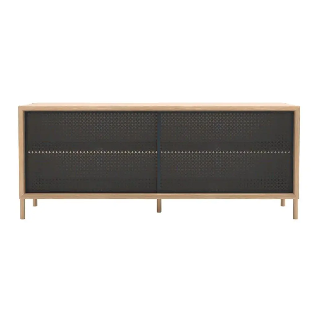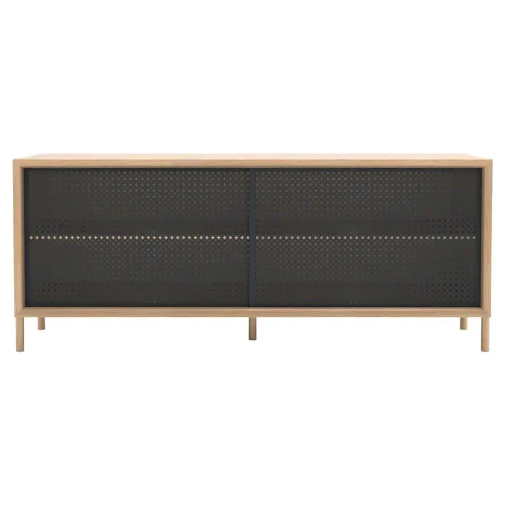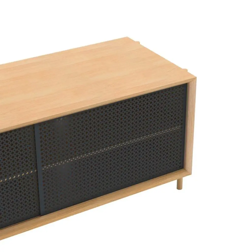 Slate grey metal gabin sideboard 122 cm natural oak by harto dimensions: w 122 x d 45 x h 49 cm. Materials: solid wood, wood veneered mdf, painted metal. Weight: 37.0 kg modest in size, the gabin 122cm sideboard is nonetheless essential! it can be used as a storage unit for dishes or as a tv stand thanks to its cable management on the back. Its shelves are also height-adjustable, to be even more practical. The gabin entrance bench is made in portugal, it is made of solid oak, oak veneered mdf and perforated and lacquered metal doors. The gabin collection is a creation of mathieu galard.