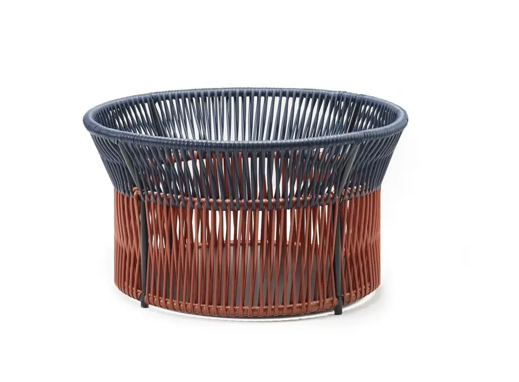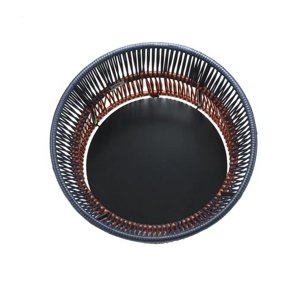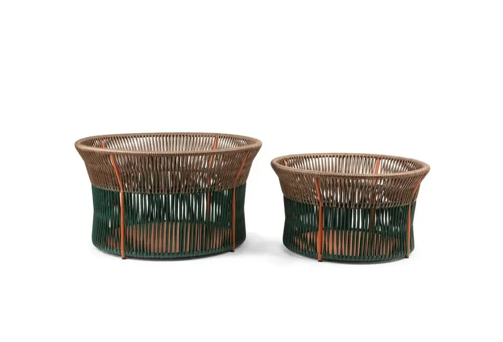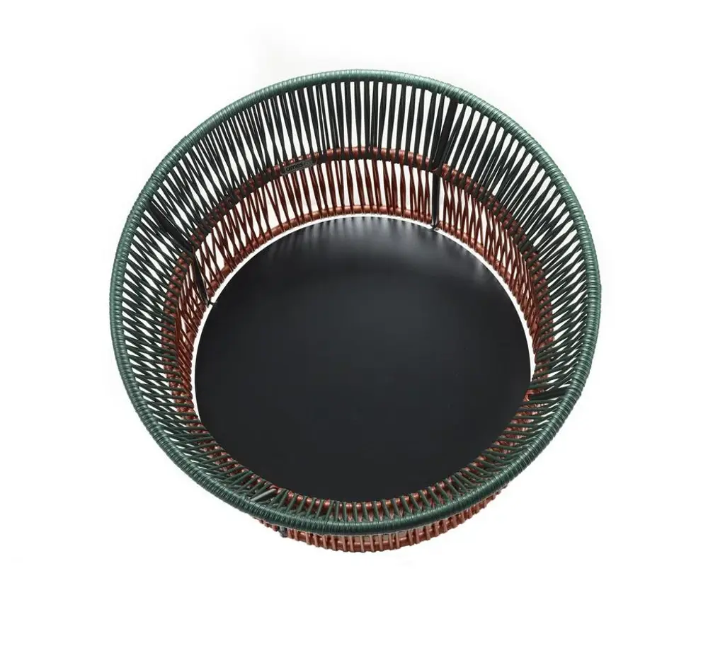 Small caribe chic basket 3 by sebastian herkner materials: galvanized and powder-coated tubular steel. Pvc strings are made from recycled plastic. Technique: made from recycled plastic and weaved by local craftspeople in colombia. Dimensions: w 55.9 x d 46 x h 29.6 cm available in colors: terra/ green/ black, green/ cobre/ black, blue/ cobre/ black, violet/ green/ black, cobre/ violet/ black, terra/ green/ cobre, violet/ green/ cobre, green/ blue/ cobre. Also available in size large and in more shapes. The caribe chic basket is an elegant design by sebastian herkner and can be used indoors and outdoors as a storage unit or planter. It’s part of our caribe chic collection, featuring an intricate hand-woven webbing in contrasting earthy, muted shades. The pieces and colors are inspired by the incredible nature of the colombian huila region where the serene tatacoa desert meets the powerful rio magdalena. The baskets are available in two sizes and three different shapes. Each basket is made in santa marta, a city on the caribbean coast of colombia, by local craftspeople. They weave the pvc strings, which are made from recycled plastic, around the powder-coated tubular steel frame. The weaving technique the artesanos and artesanas use are called momposino, a traditional method known for intricate patterns. Just the preparation of all the materials takes ten days, while the production of one basket takes three days.