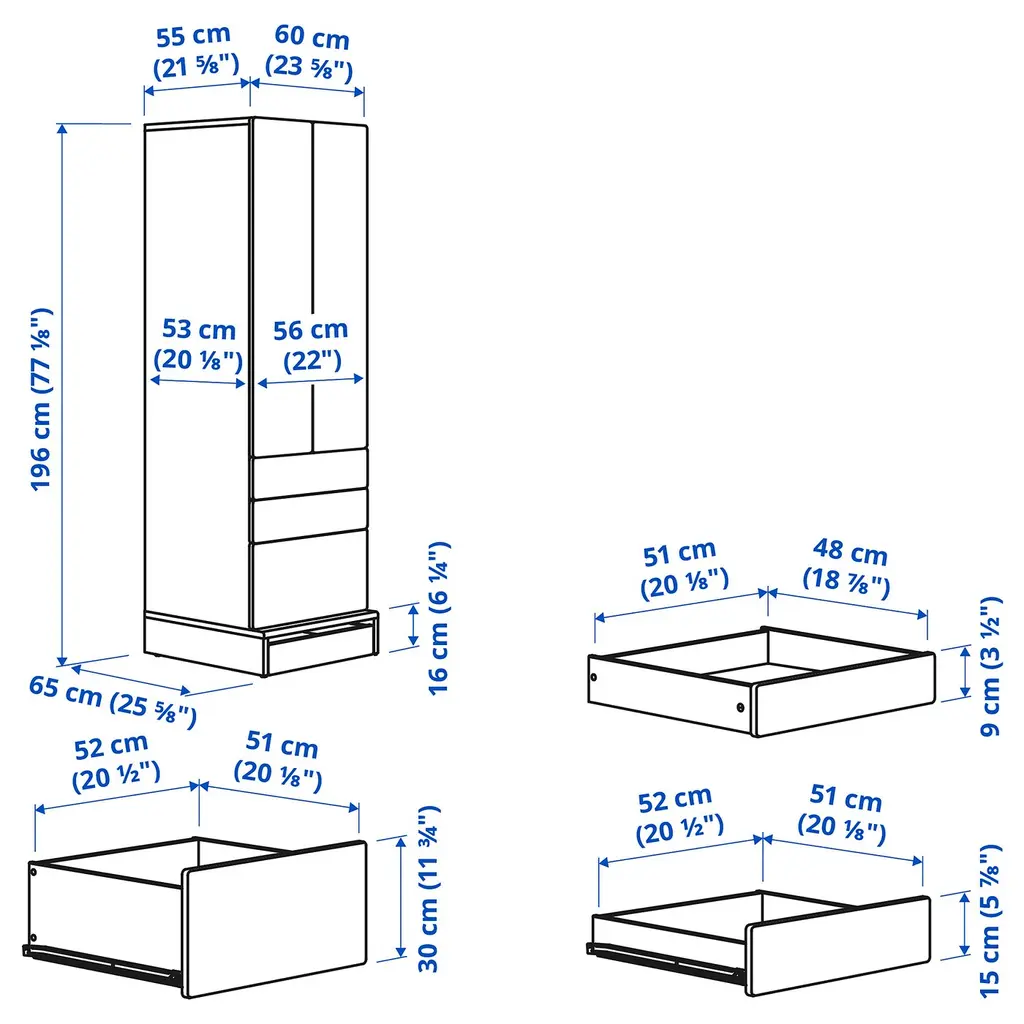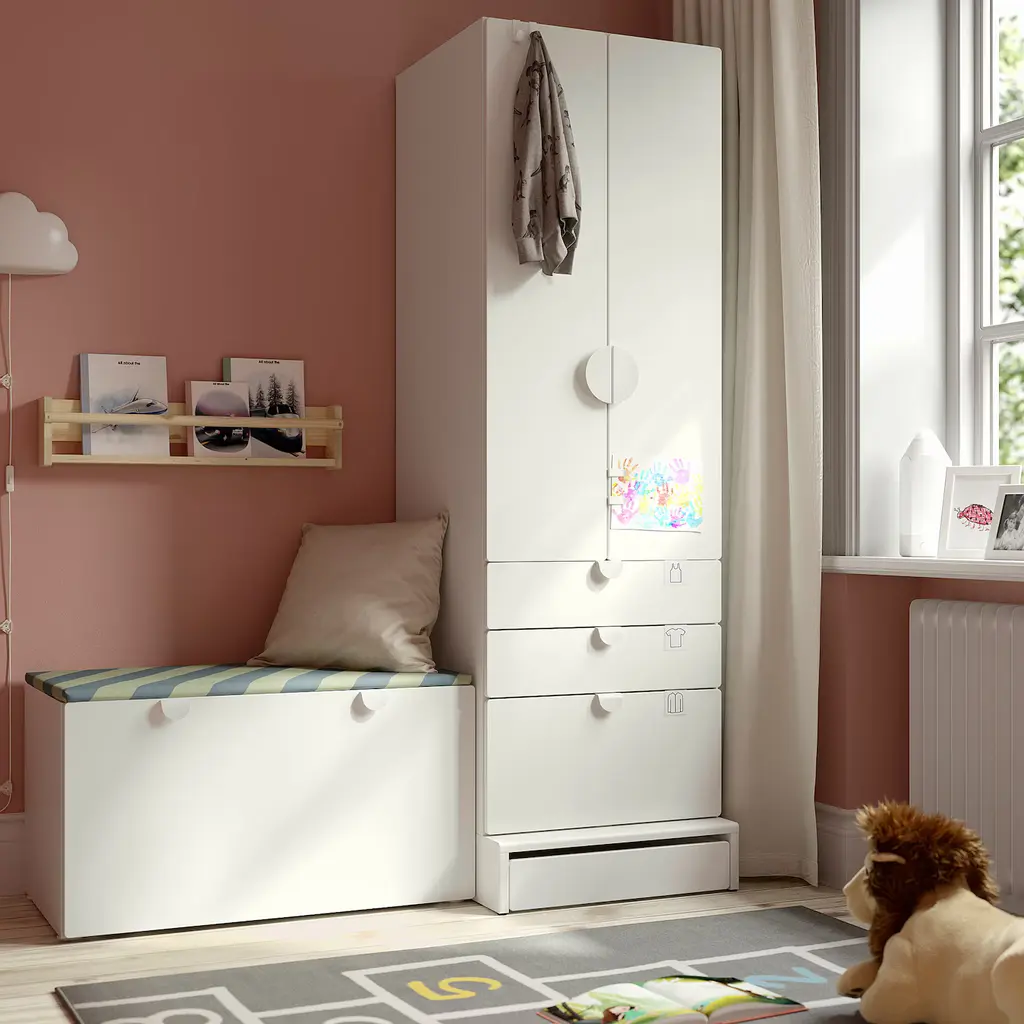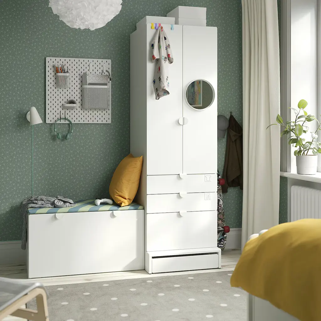 SMÅSTAD / UPPFÖRA Storage combination - white white/with bench 59x25 5/8x77 1/8 ". Your child can use this wardrobe for many years since it is deep enough to hold adult-sized hangers and has an interior which you can move as your child grows. Knobs and handles are sold separately.