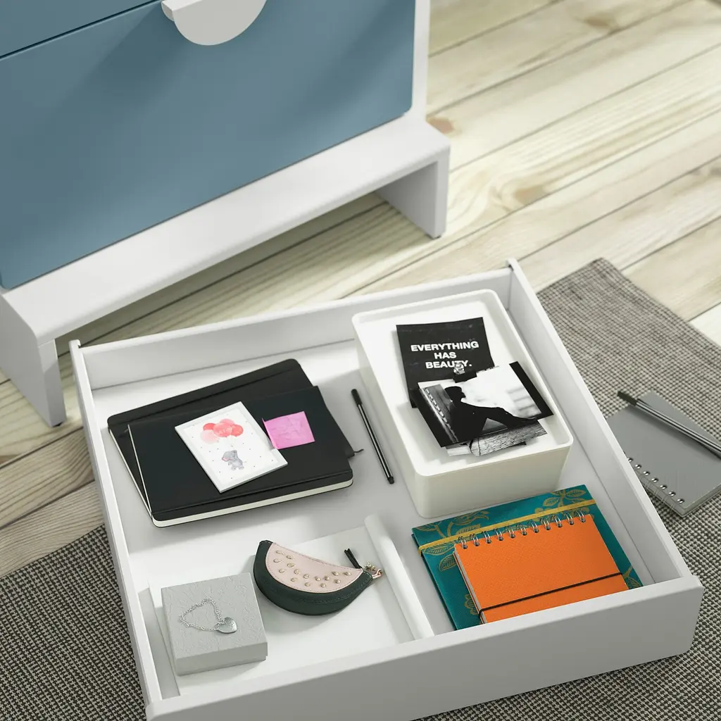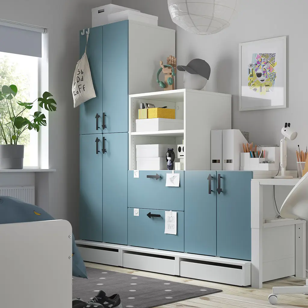 SMÅSTAD / UPPFÖRA Storage combination - white/blue 70 7/8x25 5/8x77 1/8 ". Fits perfectly under a sloping ceiling or a staircase. Your child can use this wardrobe for many years since it is deep enough to hold adult-sized hangers and has an interior which you can move as your child grows.