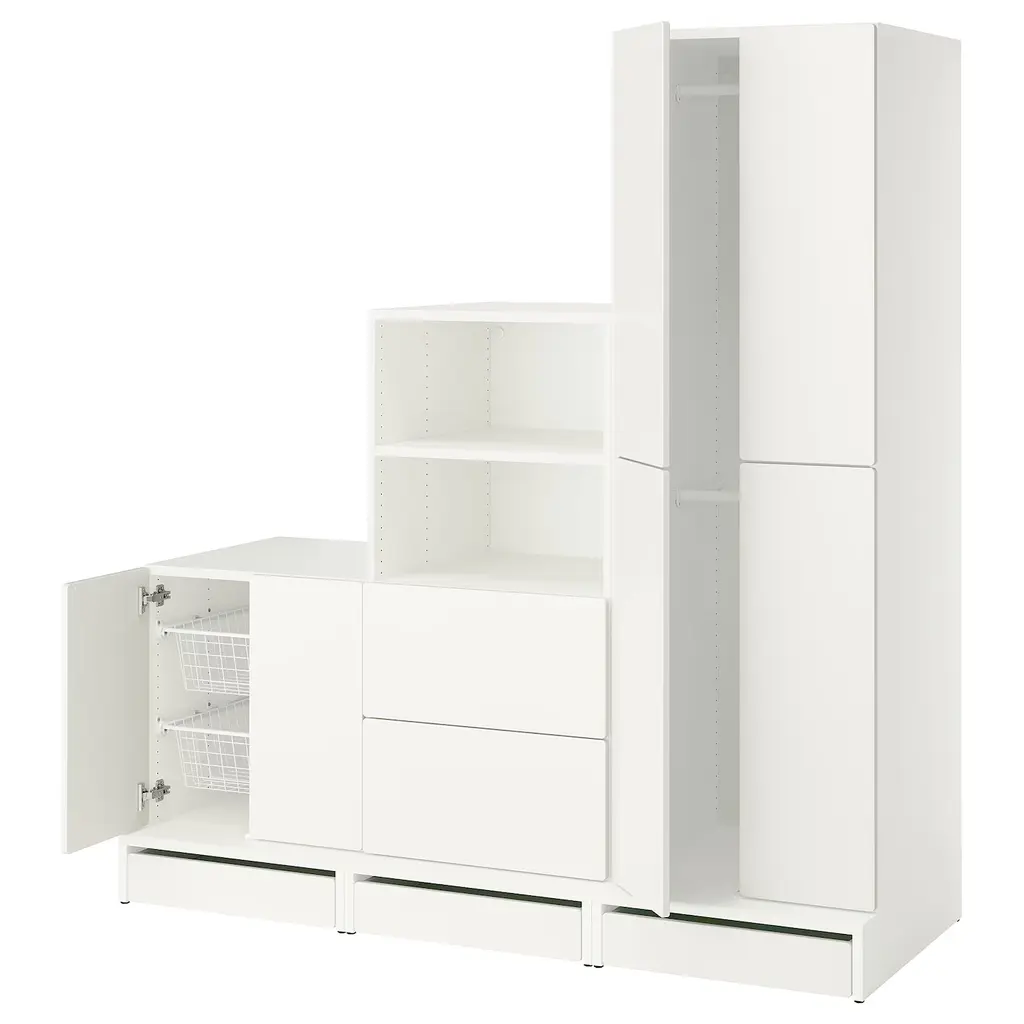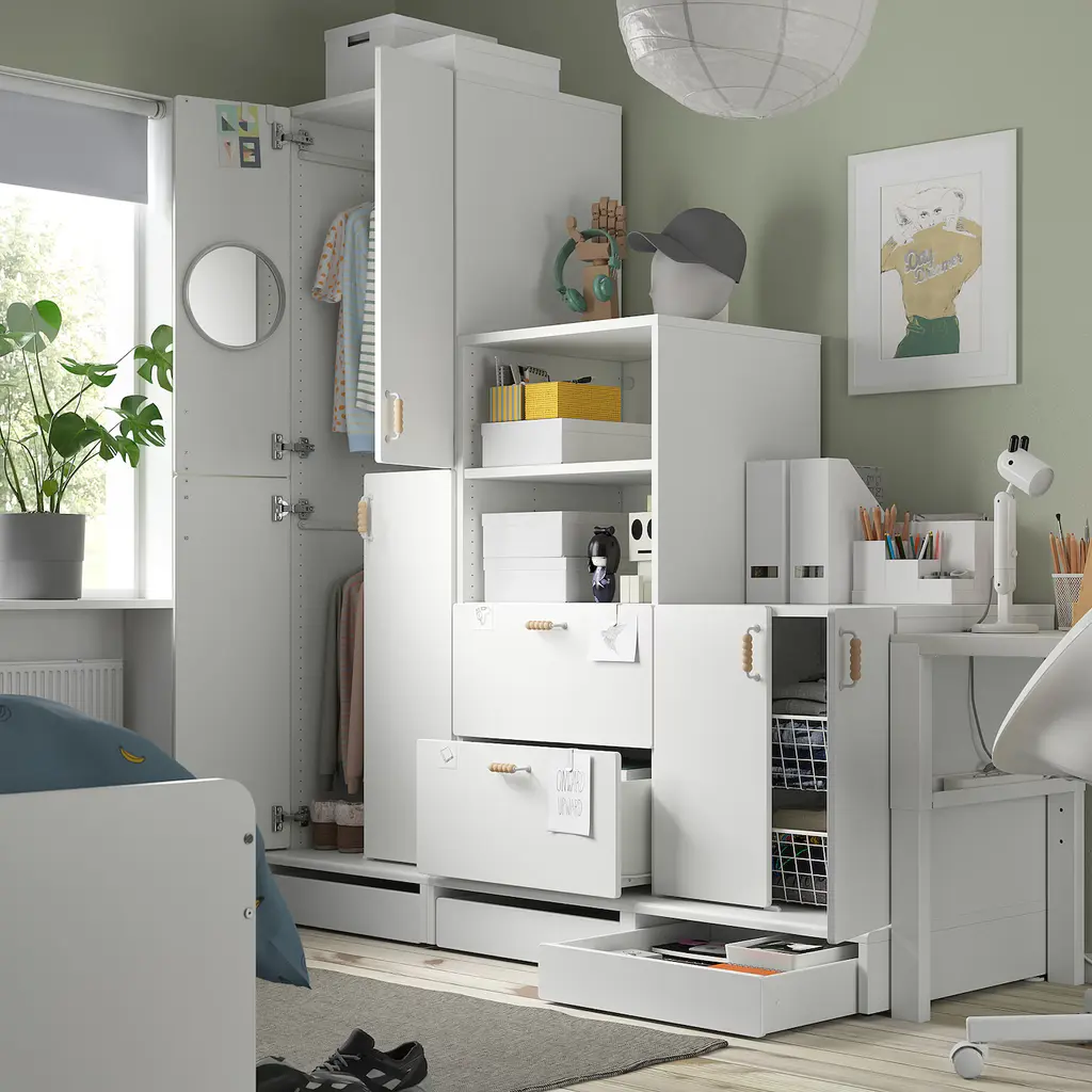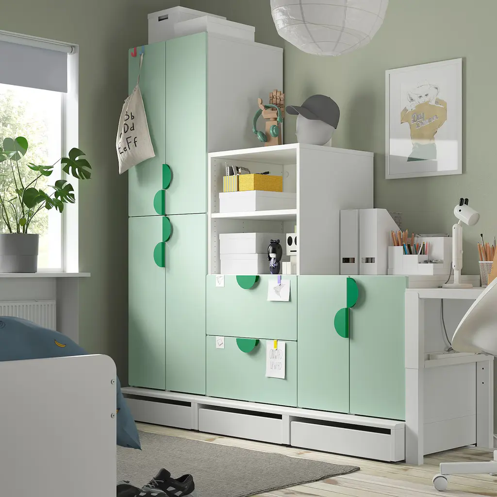 SMÅSTAD / UPPFÖRA Storage combination - white/light green 70 7/8x25 5/8x77 1/8 ". Fits perfectly under a sloping ceiling or a staircase. Your child can use this wardrobe for many years since it is deep enough to hold adult-sized hangers and has an interior which you can move as your child grows.