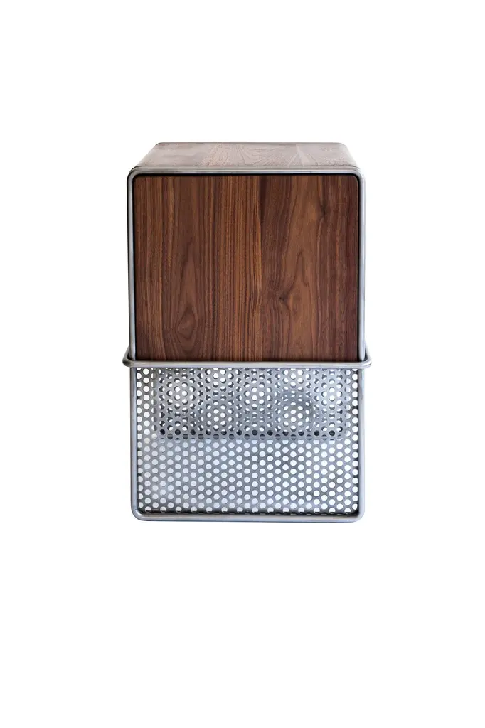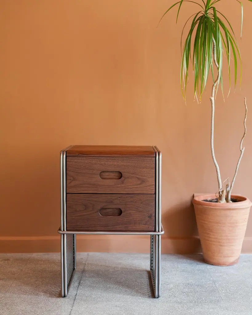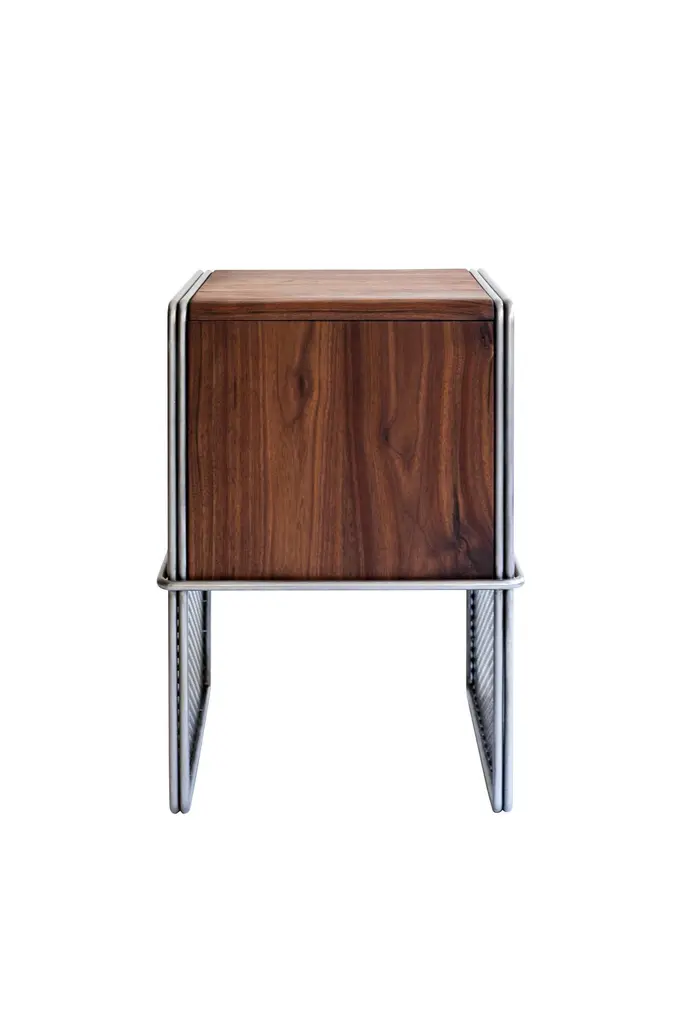 The Smith & Wesson double drawer is an Industrial Mid-Century Modern style bedside table or office storage unit. The wood is encased in a signature-style metal frame. Inspired by gun handles and hollowed features of bullet-ridden metal sheets. The Smith & Wesson is a timeless piece of strength and perseverance. This handcrafted piece is hand-oiled using house-blended oils and techniques and clear lacquered steel. It is offered in custom dimensions and number of drawers.