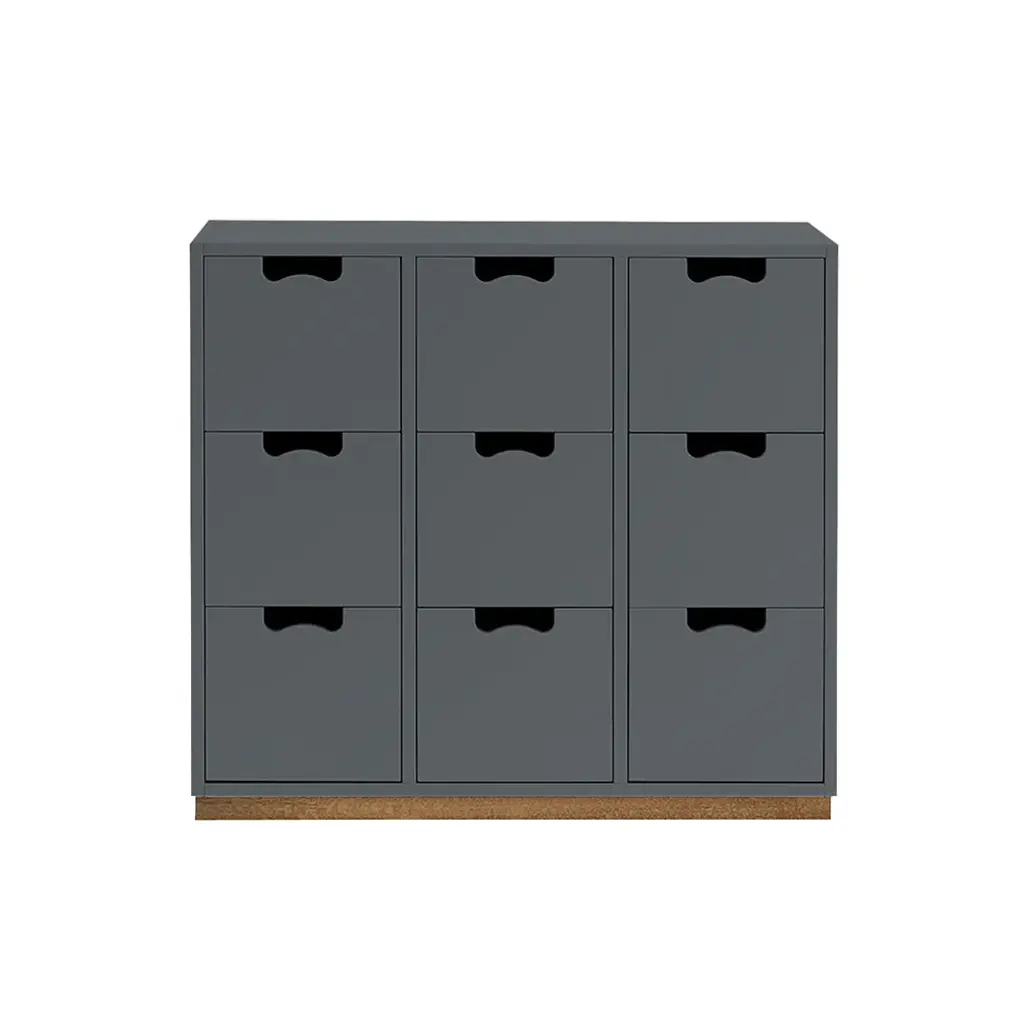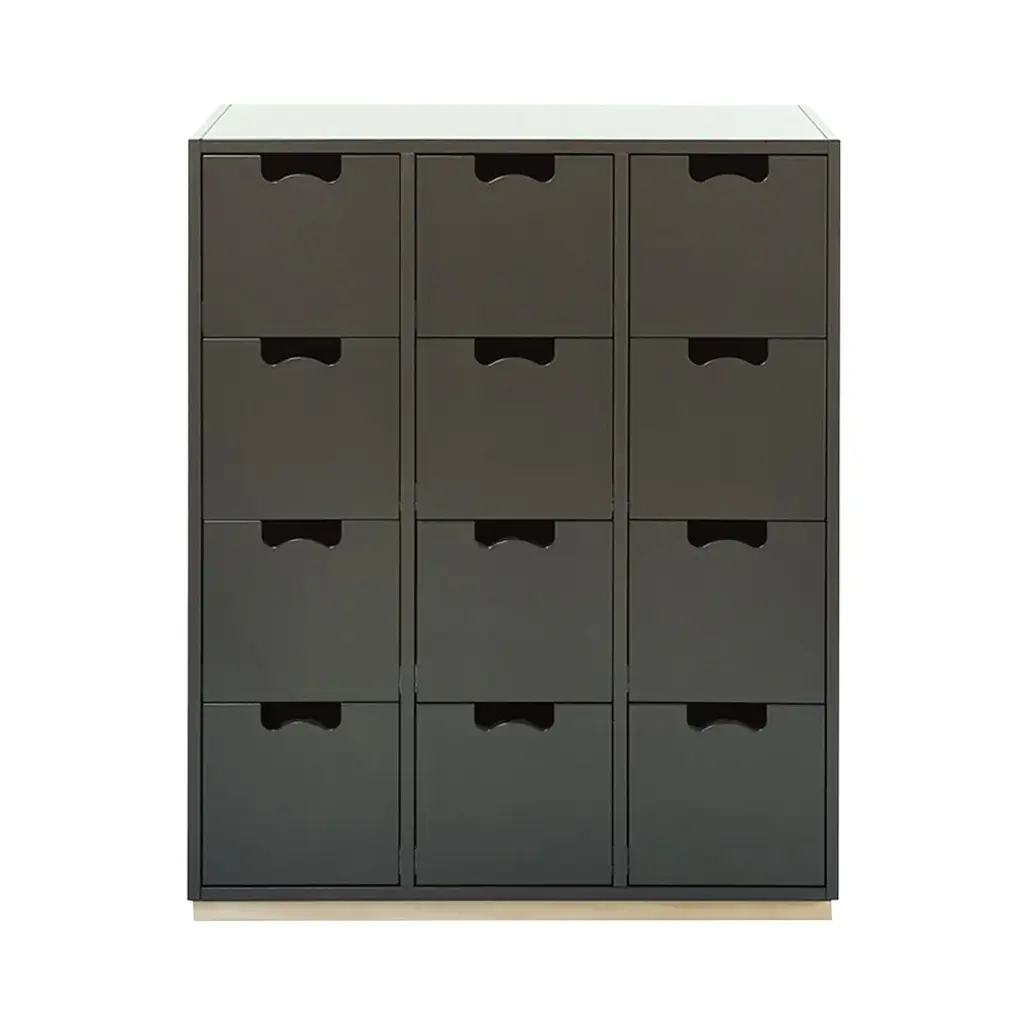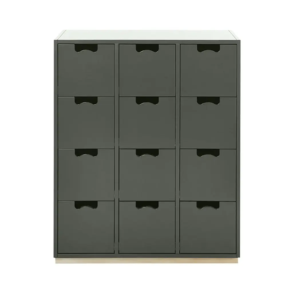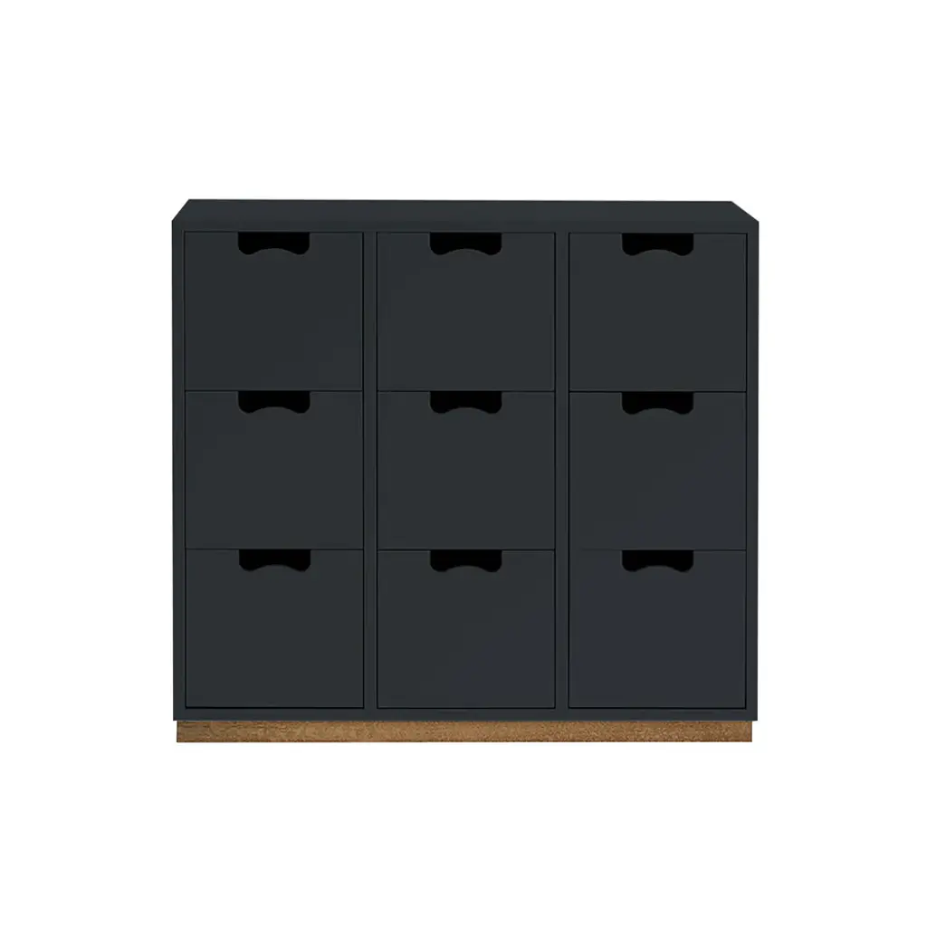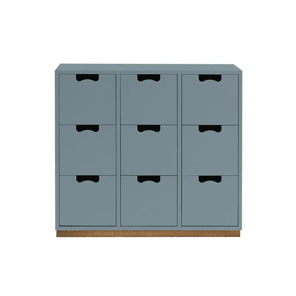 Cube-like drawers distinguish Snow B, from Asplund's storage collection hailed as a 20th century Swedish classic. Thomas Sandell and Jonas Bohlin's concept is purposely simple, with cutout handles as both a decorative element and offering a readily comfortable grip. Equipped with soft-closing drawers in a range of configurations, the lacquered MDF cabinet comes in a select range of Nordic hues, with a contrasting natural birch base. Snow is fundamentally handcrafted and made to order in the small town of Tibro in southern Sweden with its long furniture-making tradition. In combination or on its own, this a storage solution meant to last for generations; affixing the unit to the wall is recommended.