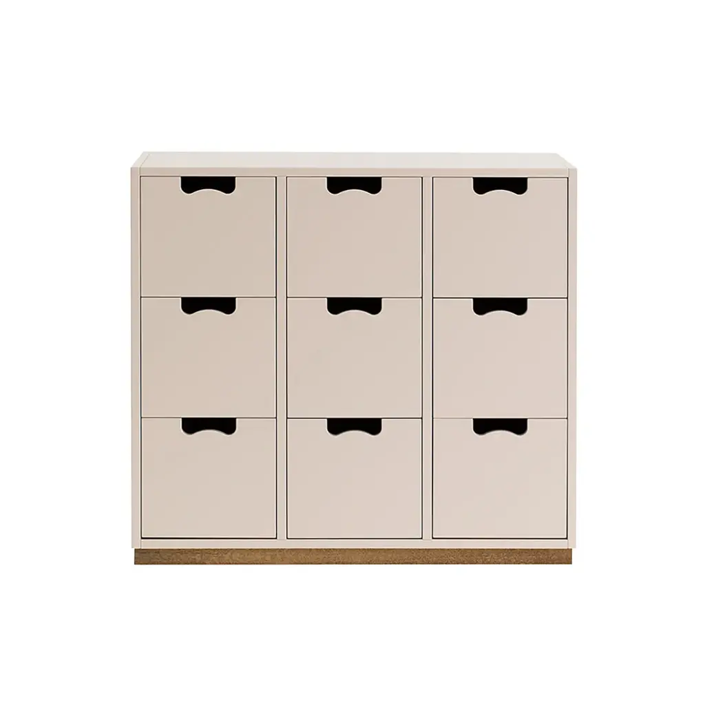 Cube-like drawers distinguish Snow B, from Asplund's storage collection hailed as a 20th century Swedish classic. Thomas Sandell and Jonas Bohlin's concept is purposely simple, with cutout handles as both a decorative element and offering a readily comfortable grip. Equipped with soft-closing drawers in a range of configurations, the lacquered MDF cabinet comes in a select range of Nordic hues, with a contrasting natural birch base. Snow is fundamentally handcrafted and made to order in the small town of Tibro in southern Sweden with its long furniture-making tradition. In combination or on its own, this a storage solution meant to last for generations; affixing the unit to the wall is recommended.