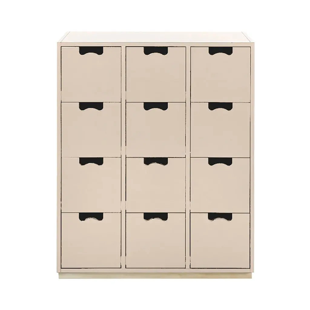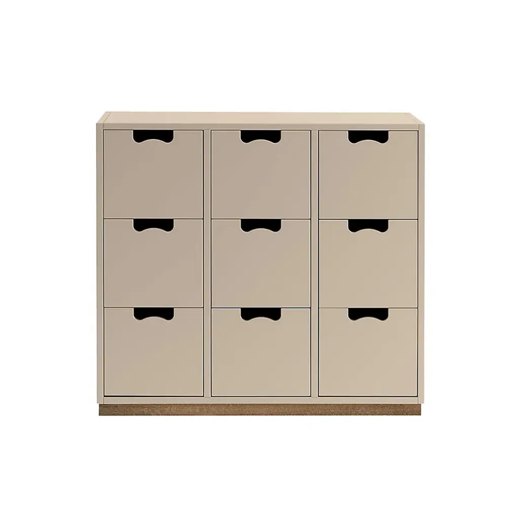 Cube-like drawers distinguish Snow B, from Asplund's storage collection hailed as a 20th century Swedish classic. Thomas Sandell and Jonas Bohlin's concept is purposely simple, with cutout handles as both a decorative element and offering a readily comfortable grip. Equipped with soft-closing drawers in a range of configurations, the lacquered MDF cabinet comes in a select range of Nordic hues, with a contrasting natural birch base. Snow is fundamentally handcrafted and made to order in the small town of Tibro in southern Sweden with its long furniture-making tradition. In combination or on its own, this a storage solution meant to last for generations; affixing the unit to the wall is recommended.