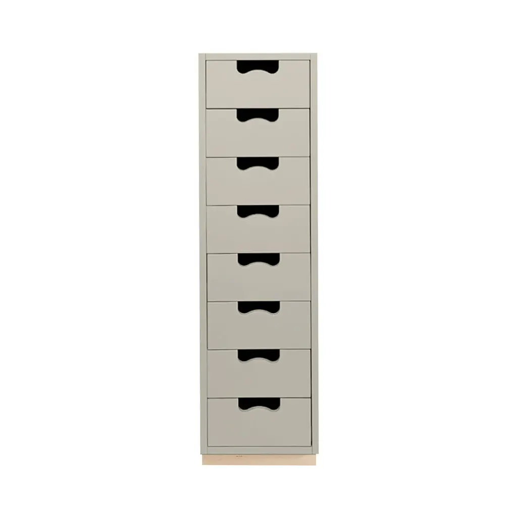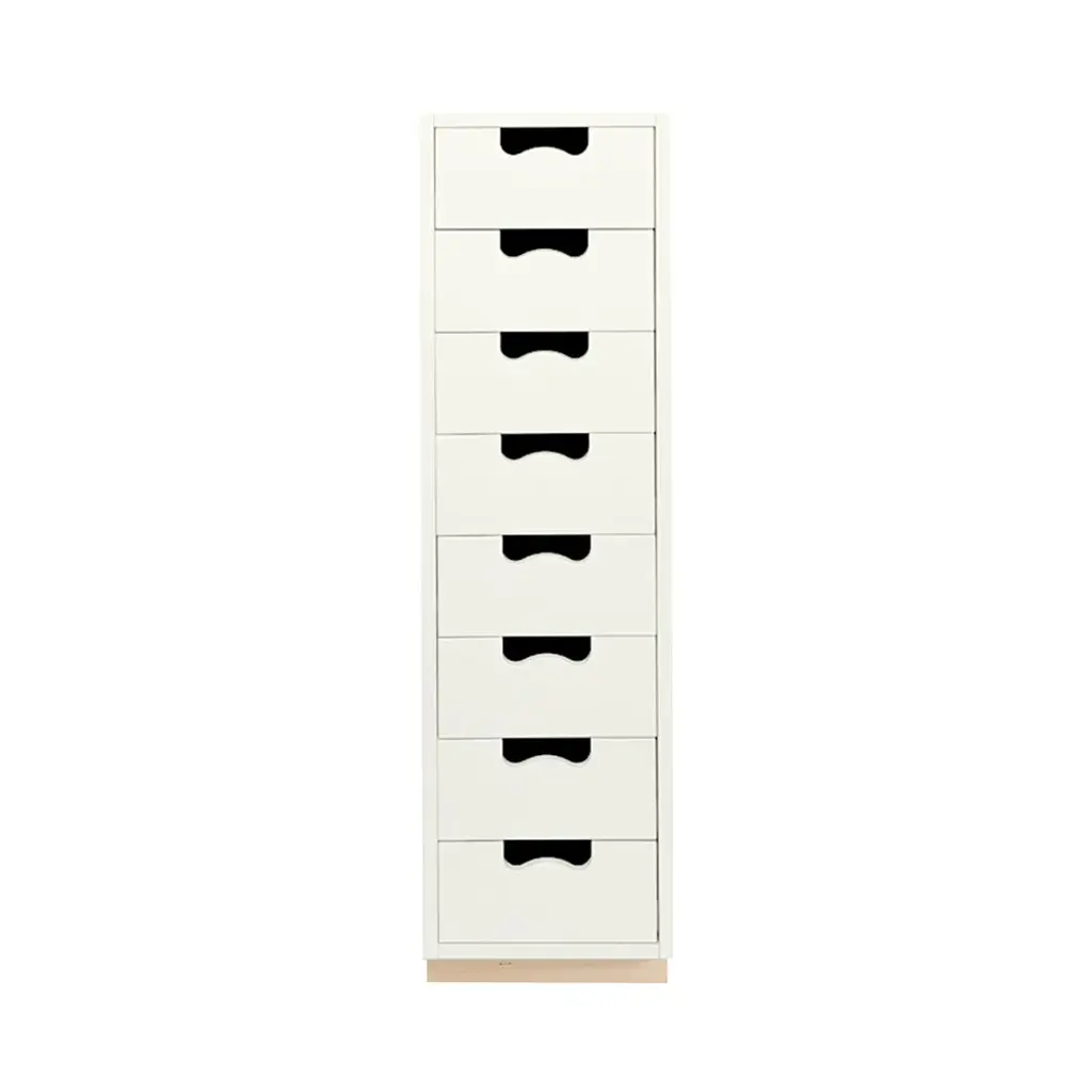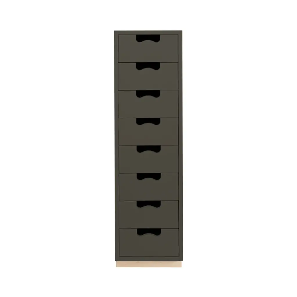 A tall unit with deep storage drawers, Snow J follows the template of Asplund's storage collection considered as a 20th century Swedish classic. Thomas Sandell and Jonas Bohlin's concept is strikingly simple, signified by the cutout handles used as both a decorative element and to give a comfortable grip. The lacquered MDF cabinet with soft-closing drawers comes in a select range of Nordic-influenced tones set on a contrasting natural birch base. Handcrafted and made to order in the small town of Tibro in southern Sweden, with its long furniture-making tradition, and meant to last for generations; affixing unit to the wall is recommended.