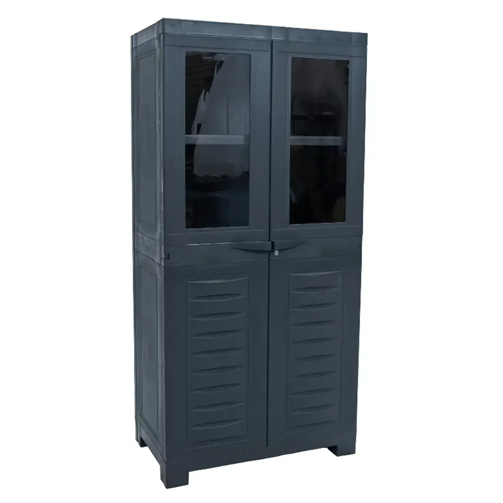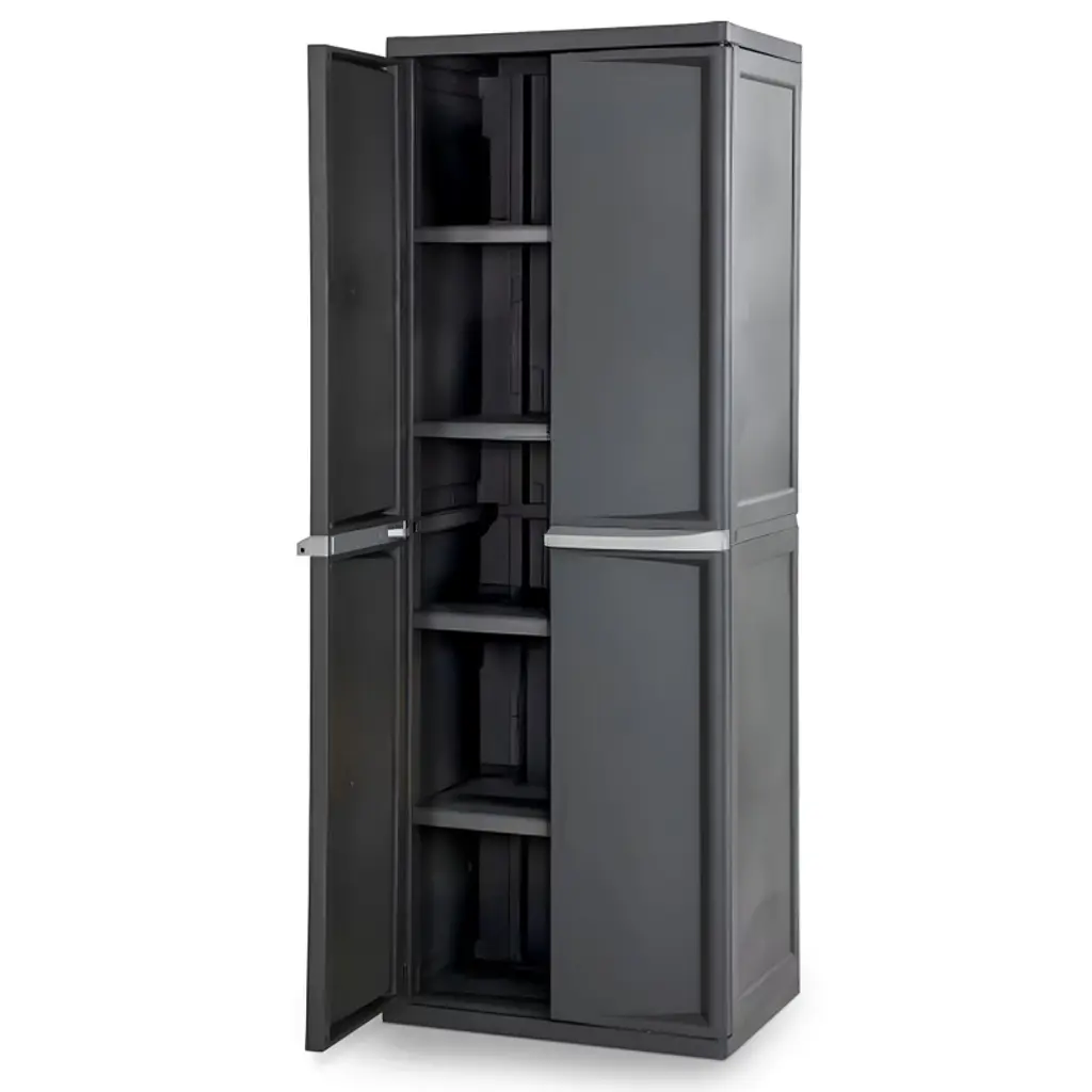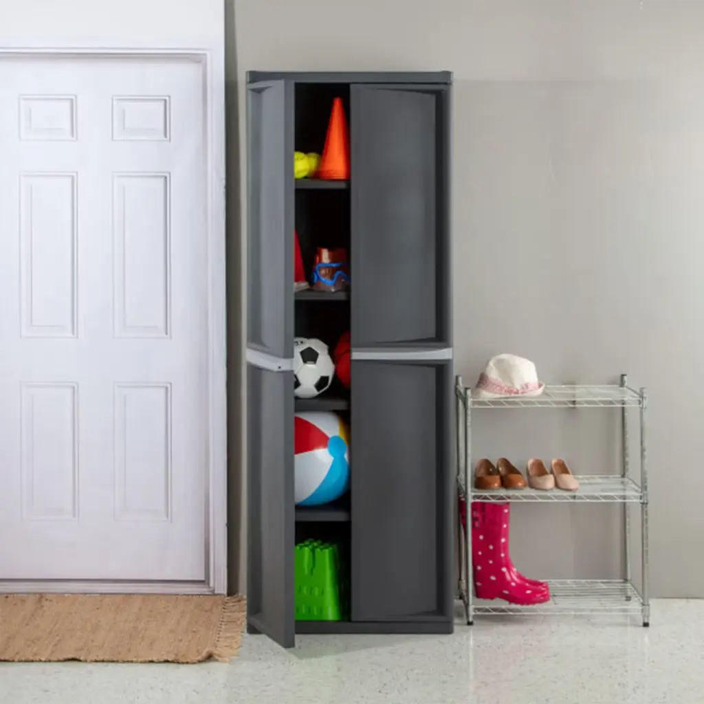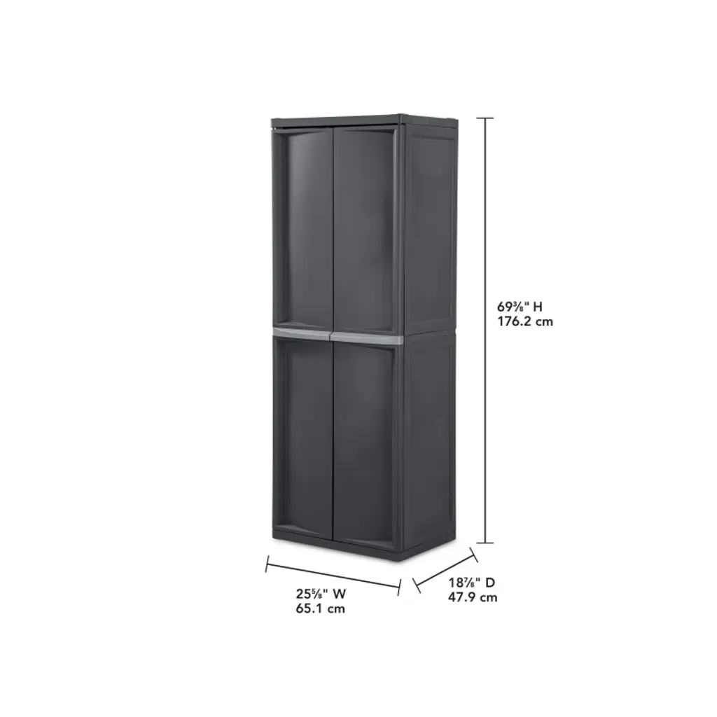 Keep your items organized and tucked away safely with these Sterilite 4-Shelf Cabinets. These freestanding cabinets offer generous 4 adjustable tiers, providing ample room to house a wide variety of items. Whether it's tools, household supplies, or seasonal gear, these cabinets can handle it all. Say goodbye to the endless search for misplaced items; everything you need is within arm's reach. The doors of these cabinets swing open and closed with ease, granting you instant access to your stored belongings. No more struggling with cumbersome cabinet doors. What's more, these doors close securely, preventing any unwanted spills or accidents. Your items will stay right where you put them. Crafted from heavy-duty materials, these office supply cabinets are designed to withstand the toughest of challenges. They can endure the wear and tear of daily life, ensuring they remain a reliable storage solution for years to come. Add some stackable containers inside for seasonal storage, small drawer organizers for office supplies, or bins for toy or clothing storage. Use them for kitchen pantry foods, patio tool storage, outdoor gardening essentials, or a closet in your dorm. The cabinets are even versatile enough to use as lockers. The versatility is endless! These free standing cabinets are compatible with standard-sized padlocks, giving you the peace of mind that your important items are protected. If you need more storage space in your garage, mud room, utility room, or basement, these Sterilite 4-Shelf Storage Cabinets are the solution for you.