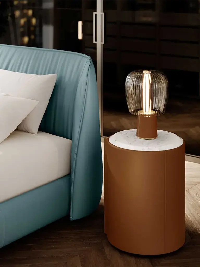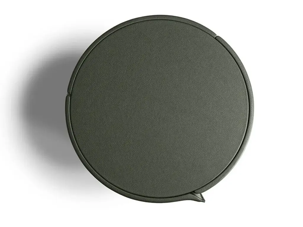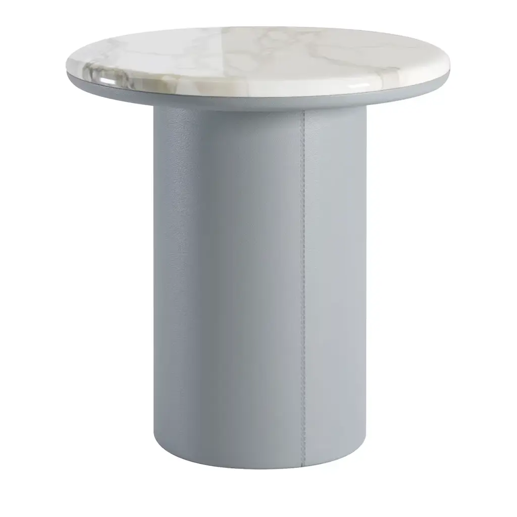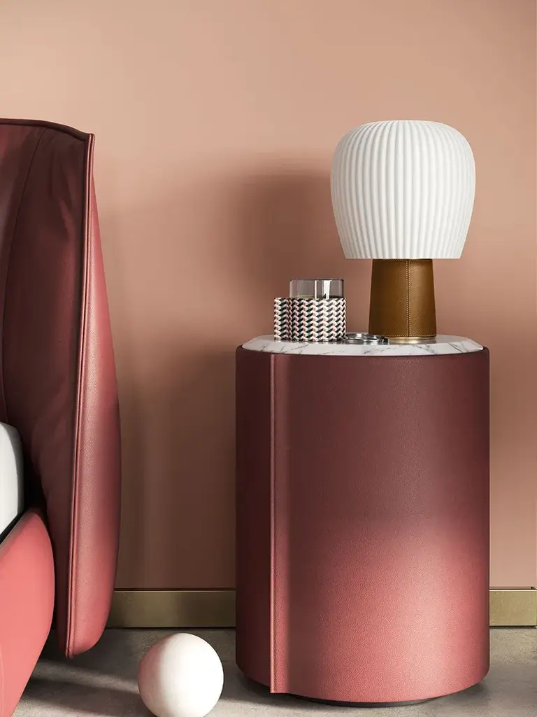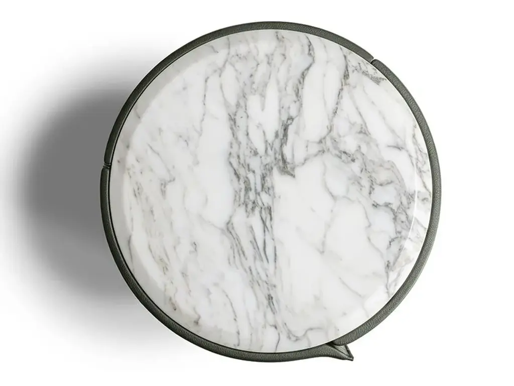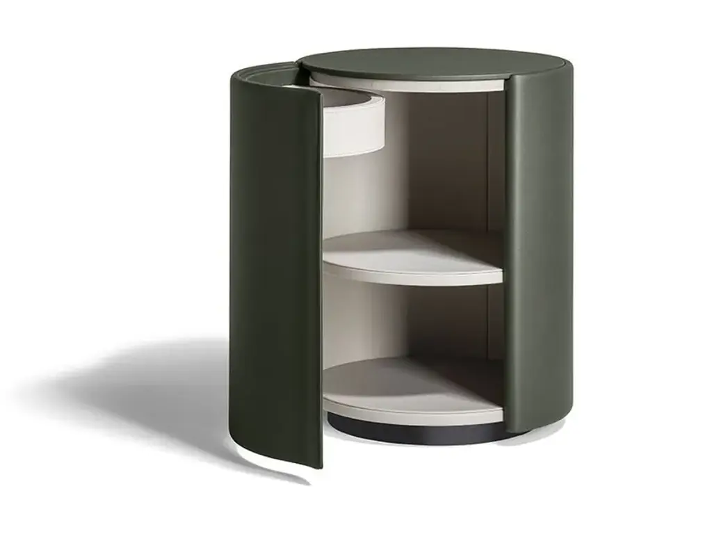 The supporting frame and door of the Stock’n Roll bedside table are made of curved beech plywood and solid beech wood. The upholstery is in Pelle Frau® leather, with tone-on-tone stitching. The storage unit is available with left or right opening. With a single gesture, the door featuring a small inner tray opens to reveal an equipped compartment complete with organizer shelf. The shelf and tray are made of birch plywood and finished to match the outer surface. The top can be upholstered in Pelle Frau® leather to match the inner and outer surface, or in precious semi-gloss marble. Designed by Sebastian Herkner, Stock’n Roll comprises a collection of storage units inspired by jewelry boxes, characterized by a sleek but exclusive design featuring intricate details and luxury materials. Stock’n Roll can be placed next to an armchair or used as a bedside table on either side of the bed. It is cylindrically shaped with the edge of the cover deviating slightly from the body, forming a handle inviting it to be opened.