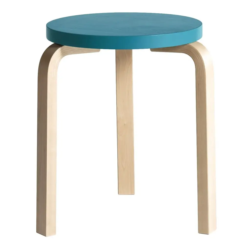 Alvar Aalto's iconic Stool 60 is the most elemental of furniture pieces, equally suitable as a seat, a table, storage unit, or display surface. The legs are mounted directly to the underside of the round seat without the need for complicated connecting elements. Thanks to its geometry, the stool can be stacked to save space in a spiralling tower sculpture. Manufactured in 42 production steps at the A-Factory in Turku, Finland, Stool 60 is available in a wide variety of colors and finishes. Several million units of Stool 60 and its four-legged cousin, Stool E60, have been sold, making it one of the most cherished products in the history of design.