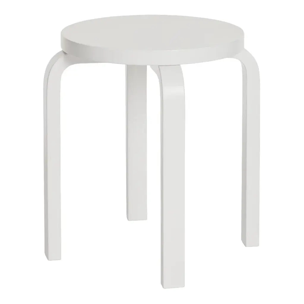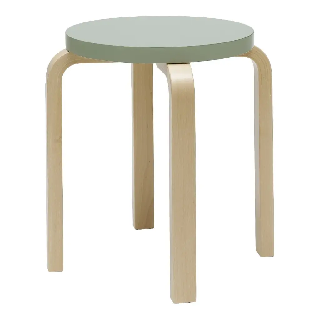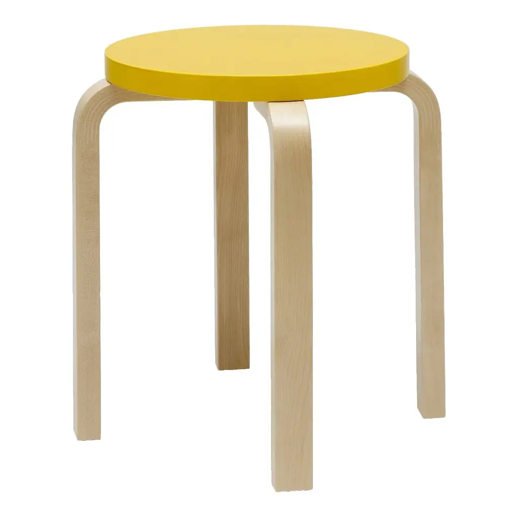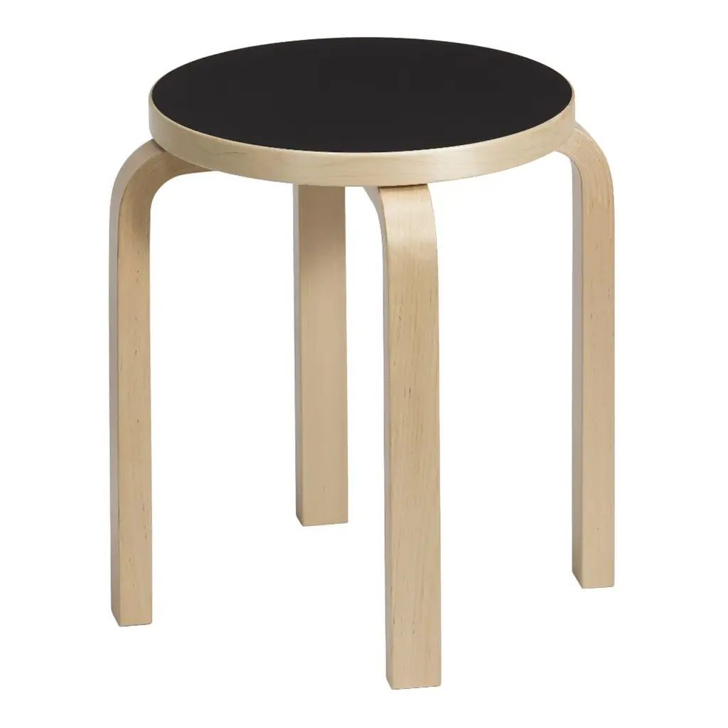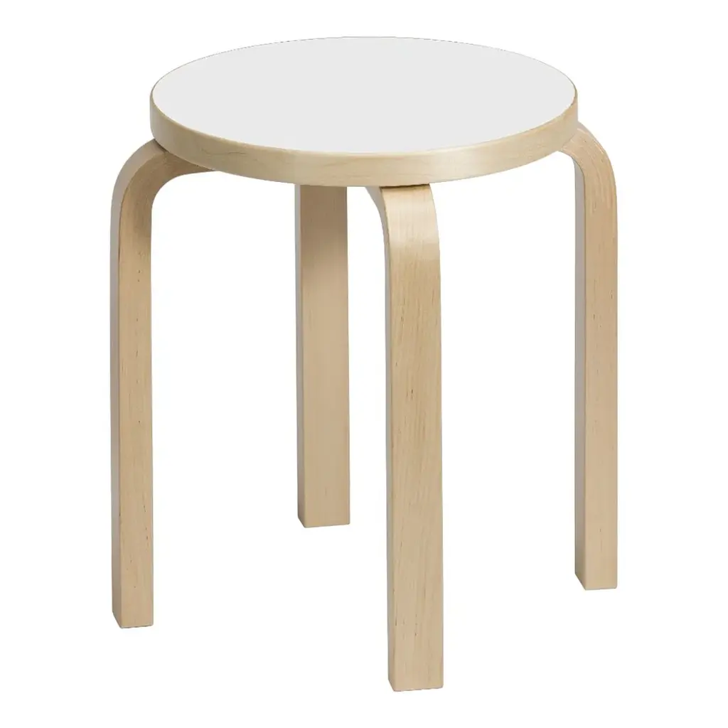 Alvar Aalto's four-legged Stool E60 is the most elemental of furniture pieces, equally suitable as a seat, table, storage unit, or display surface. Projecting a sense of relaxed familiarity, Stool E60 is equally suited to the home, public buildings, and educational facilities. The legs are mounted directly to the underside of the round seat without the need for complicated connecting elements. Thanks to its geometry, the stool can be stacked to save space in a spiralling tower sculpture.