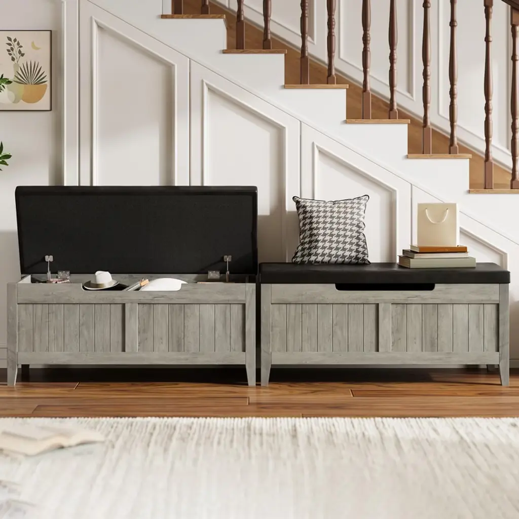Product DescriptionOrganize your space in style with this multi-functional storage chest, expertly crafted to serve as both a seating solution and concealed storage unit. Featuring safety-enhanced hinges, a plush cushion seat, and versatile design, this trunk brings timeless elegance to entryways, bedrooms, or living areas while securely housing seasonal items or daily essentials.Key Features1. Secure Slow-Close LidEquipped with two reinforced safety hinges that ensure smooth, controlled closing to prevent accidental finger pinching. The U-shaped handle openings allow easy lifting and repositioning of the trunk.2. Dual-Purpose FunctionalityGenerous interior capacity stores off-season clothing, bedding, or shoes. The cushioned top transforms into a practical bench for putting on footwear or casual seating in high-traffic areas.3. Premium Comfort & DurabilityHigh-density foam cushion upholstered in breathable linen fabric offers firm yet comfortable seating. Supports substantial weight while maintaining shape over time.4. Engineered Wood ConstructionSturdy engineered wood frame resists warping and features non-reactive rubber elements for easy cleaning. Matte finish protects against scratches and stains.5. Vintage-Inspired AestheticClassic retro design with clean lines complements farmhouse, coastal, or transitional decor. Neutral tones blend seamlessly into any room as a sophisticated accent piece.6. Effortless AssemblyPre-attached hinges and interlocking panels enable quick setup. Minimal tools required for final stabilization.Product SpecificationsMaterial: Engineered wood frame, linen-upholstered foam cushionFeatures: Safety hinges, U-shaped handles, slow-close lidDimensions: Standard storage trunk size (exact dimensions not specified)Use Case: Entryway bench, blanket storage, bedroom organizerIdeal for decluttering without compromising style, this trunk merges practical storage with enduring craftsmanship, offering a refined solution for modern homes seeking both function and aesthetic appeal.