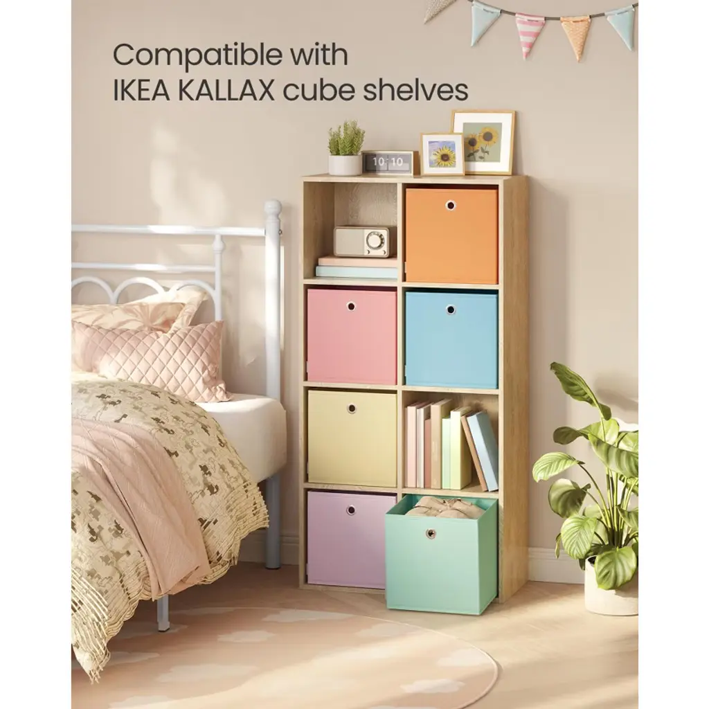 Introducing our exquisite set of fabric storage boxes, designed to bring both functionality and flair to your home. These vibrant organisers are crafted with an artistic touch, offering a splash of colour that enlivens any space. Made from durable, 2 mm thick, moisture-resistant, and odourless PP sheets, these boxes promise stability and longevity. Measuring 11.8"L x 11.8"W x 11.8"H, they are perfectly sized to fit into IKEA cube storage units and other cube shelves over 12 inches. Each box is equipped with a convenient grommet handle, ensuring easy access to your belongings. Versatile in use, these storage cubes are ideal for tidying up books in your study, organising art supplies and CDs in the living room, or keeping clothes and accessories neatly arranged in the bedroom. When not in use, simply fold them flat to save space, making them a perfect solution for dynamic living environments. With their blend of practicality and aesthetic appeal, these fabric storage boxes effortlessly enhance any room, providing a stylish way to keep your home organised and clutter-free. Transform your living space with these charming and functional storage solutions. Notes: - Insert the bottom panel before use. - For daily cleaning, wipe the surface with a slightly damp cloth and let the fabric boxes air dry; do NOT wash with water. Parameters: - Size of Each Box: 11.8"L x 11.8"W x 11.8"H (30 x 30 x 30 cm) - Total Weight: 4 lb (1.8 kg) - Max. Static Load Capacity per Box: 11 lb (5 kg) - Material: Non-Woven Fabric, PP Plastic (Polypropylene) - Color: Lavender Purple, Cool Blue, Moonlight Green, Terracotta Pink, Apricot Orange, Pale Gold Package Lists: - 6 x Storage Box