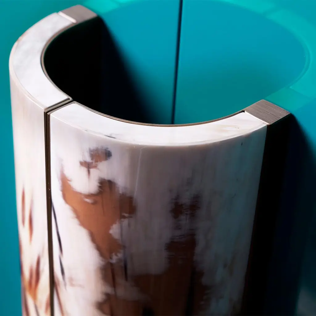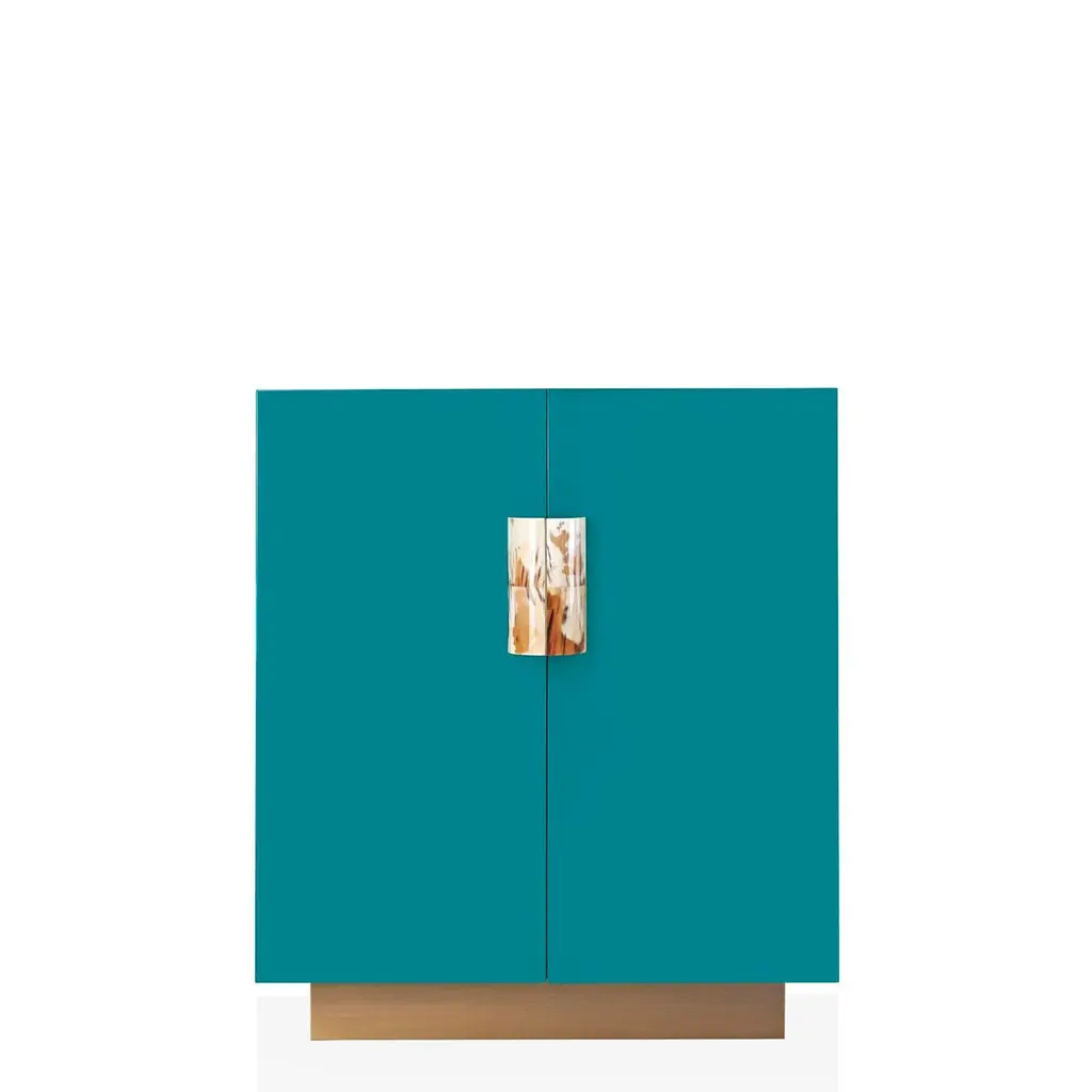 Sporting a timeless design, Stresa is a storage unit defined by essential lines and considered details. The structure in lacquered wood is proposed in a brand new water blue finish and rests on a burnished brass base. Two doors open to reveal the inside of the cabinet which is characterized by a mirrored background and by an elegant shelf in Tosca leather (cat. Super), Avio colour with ivory saddle stitching. The leather details are also repeated in the flaps used to cover the hinges. Stresa is distinguished by its peculiar handles in curved Corno Italiano and burnished brass, which are the symbol of the craftsmanship and attention to detail that have always distinguished our company.Notes:- Colors and shades of Corno Italiano processed by our Company are unique and due to the natural origin of raw material. For this reason Corno Italiano tones that can be seen in pictures are indicative and cannot be reproduced in finished products.