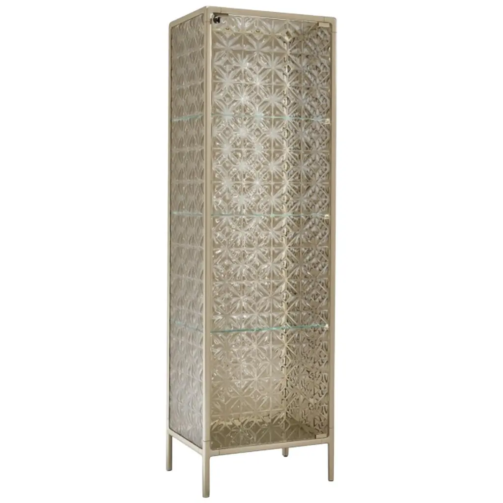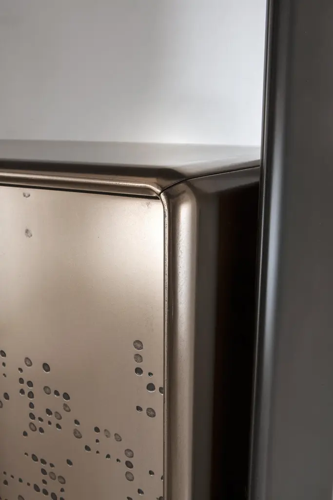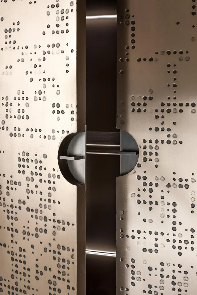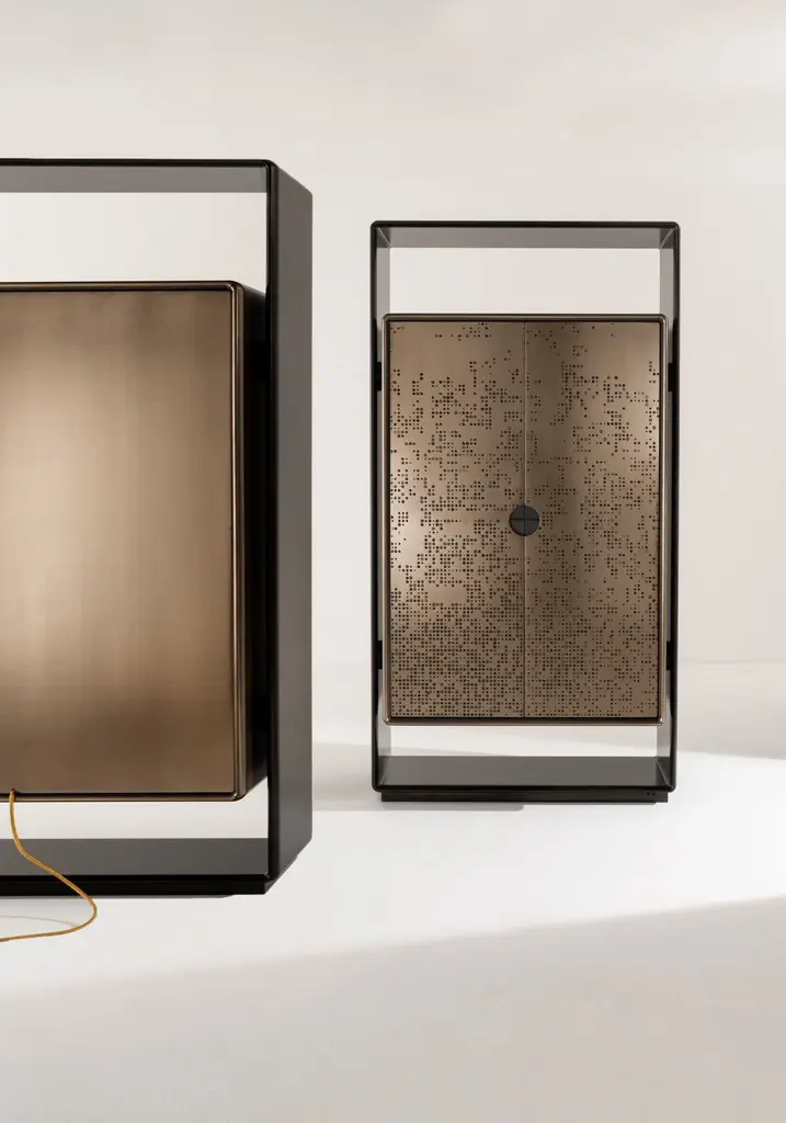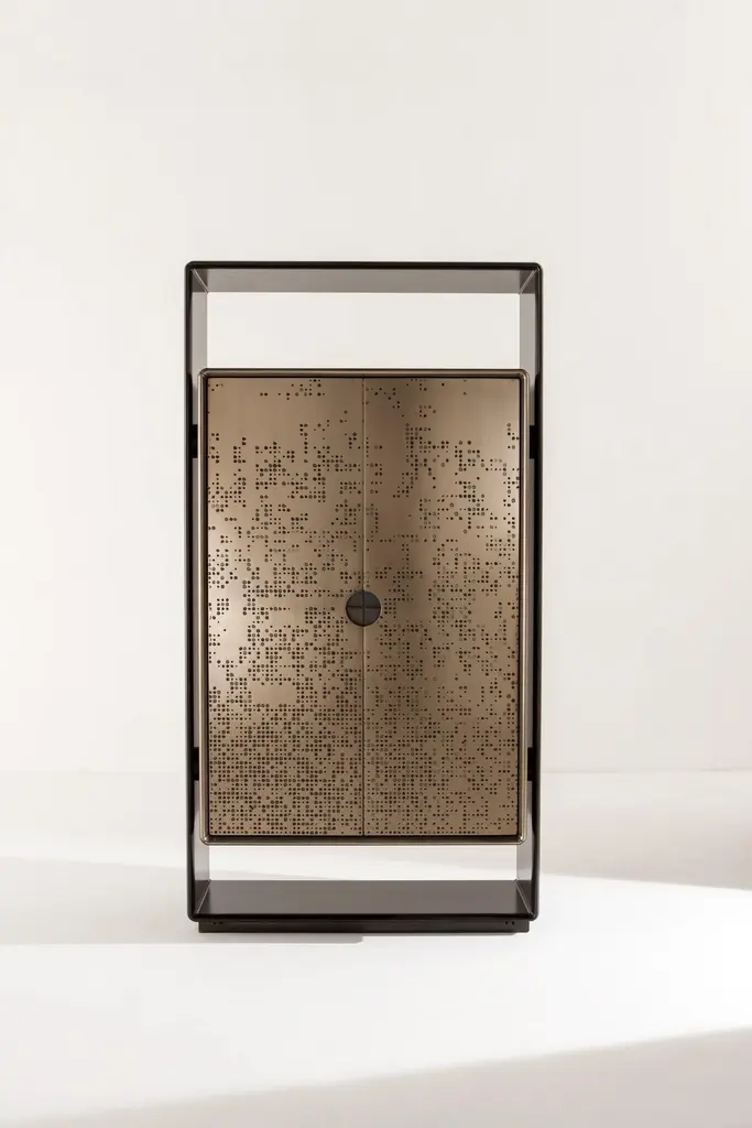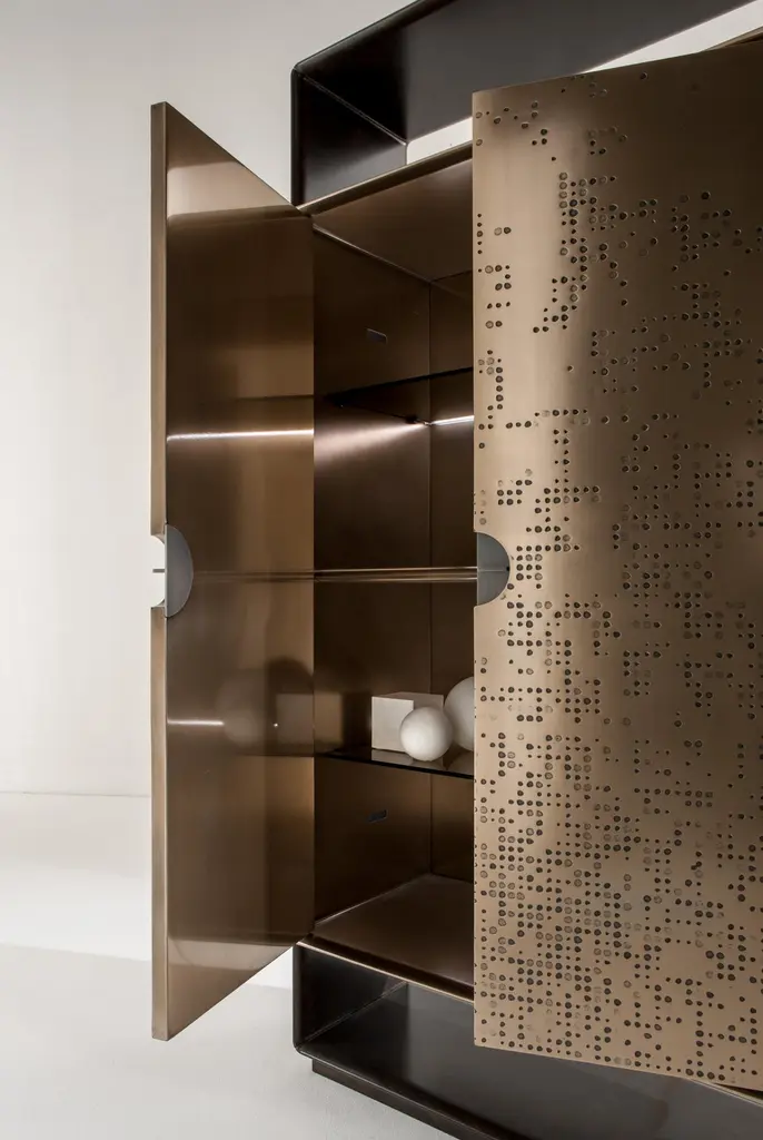 Talento Unlimited TAL 01 MM Sideboard by LaurameroniDimensions: W 106 x D 52 x H 200 cmMaterials: Structure: "Patina Bronzata Antica"Doors: "Unlimited" carved with Bronze "Liquid Metal" finishContainer: Bronze "Liquid Metal"Interior: Delabré metallic paint. Tall storage unit with 2 hinged doors. Internally equipped with 2 glass shelves with LED lighting and 1 wooden shelf. Structure in wood with Patina Bronzata Antica finish, doors in liquid metal bronze with "Unlimited" texture. Handle in burnished brass. Container and interiors in liquid metal bronze.Laurameroni:The ability of craftsmen from the Brianza area has fascinated them from a young age. Over time, this craftsmanship has evolved and developed into industrial production. They wanted to invite architects to rediscover and exploit the unique skills of master craftsmen. Their aim was to create products using the most sophisticated equipment and the finest materials, designed for ambitious and refined individuals seeking items where differentiation and uniqueness prevail.