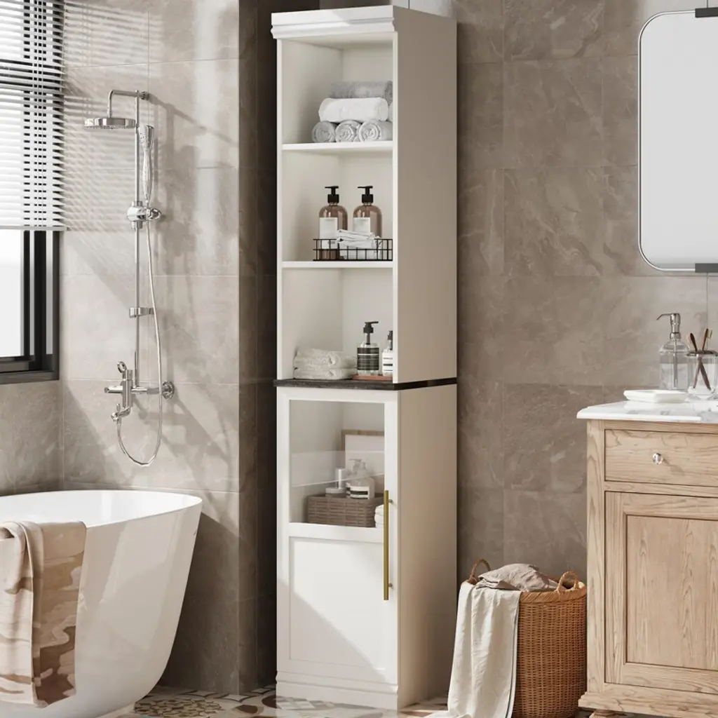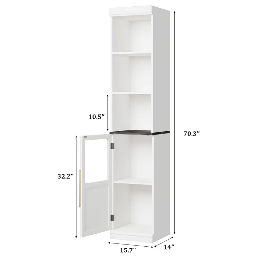 Tall Storage Cabinet with Glass Door, 70" Bathroom Storage Cabinet with Adjustable Shelves for Small SpacesProduct Details:1. Space-Saving Vertical DesignMaximize your storage potential in tight areas with this slim, vertical cabinet. Measuring just 15.7 inches wide and 14 inches deep, its tall 70.3-inch frame is engineered to fit perfectly in narrow spaces. This design provides substantial storage capacity without consuming valuable floor space, making it ideal for small bathrooms, compact kitchens, or cozy study nooks.2. Adjustable & Versatile InteriorCustomize your storage with three adjustable interior shelves that can be repositioned to accommodate items of various heights. Whether storing tall bottles, small appliances, or a mix of differently sized items, you can easily configure the layout to meet your specific organizational needs and make the most of the vertical space.3. Stylish Glass Door DesignThis cabinet combines functionality with aesthetic appeal through its elegant glass door. The design allows for easy visibility of your stored items while protecting them from dust. The classic white finish and clean lines complement farmhouse, modern, and traditional decor styles, helping to enhance the overall cleanliness and orderliness of your space.4. Durable & Secure ConstructionBuilt from premium engineered wood, this cabinet is designed for long-lasting durability, even in humid environments like bathrooms. For added safety and stability, the cabinet includes an anti-tipping device, allowing it to be securely anchored to the wall, making it a reliable and family-friendly storage solution.5. Multi-Functional for Every RoomThis versatile storage unit adapts to various needs throughout your home. Use it as a kitchen cabinet for dishes and small appliances, a living room display for books and decor, or a bathroom organizer for towels and toiletries. Its adaptable design makes it a practical and stylish addition to any room in your house.Specifications:? Material: Engineered Wood? Color: White? Style: Farmhouse? Number of Doors: 1 (Glass)? Shelving: 3 Adjustable Shelves? Special Feature: Anti-Tip Device? Recommended Uses: Bathroom Storage, Kitchen Pantry, Living Room Organizer? Overall Dimensions: 15.7"W x 14"D x 70.3"H