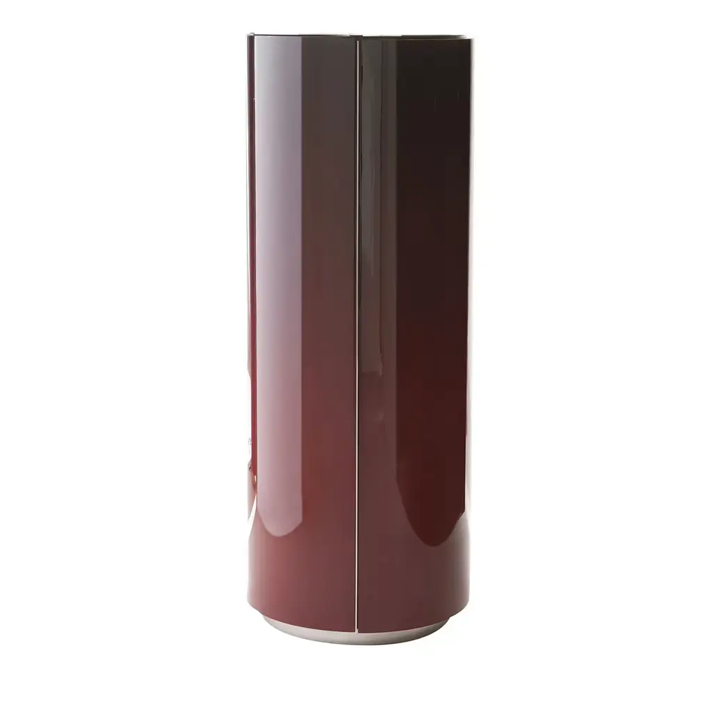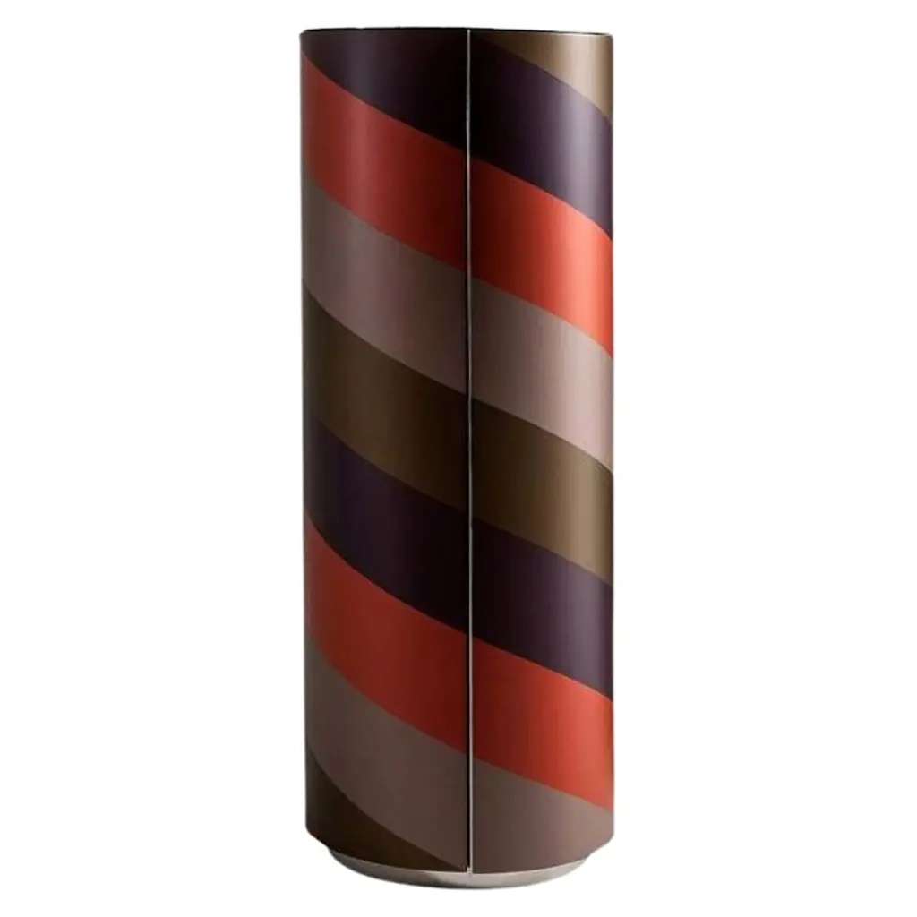 Storing away items becomes creative as well as beautiful with this creative cylindrical, wooden storage unit that opens up in the front. This piece, which is available in three different heights, contains circular glass shelves, rotating stainless steel shelves, and is illuminated inside. The outside of this unique piece has a multicolored lacquered finish.