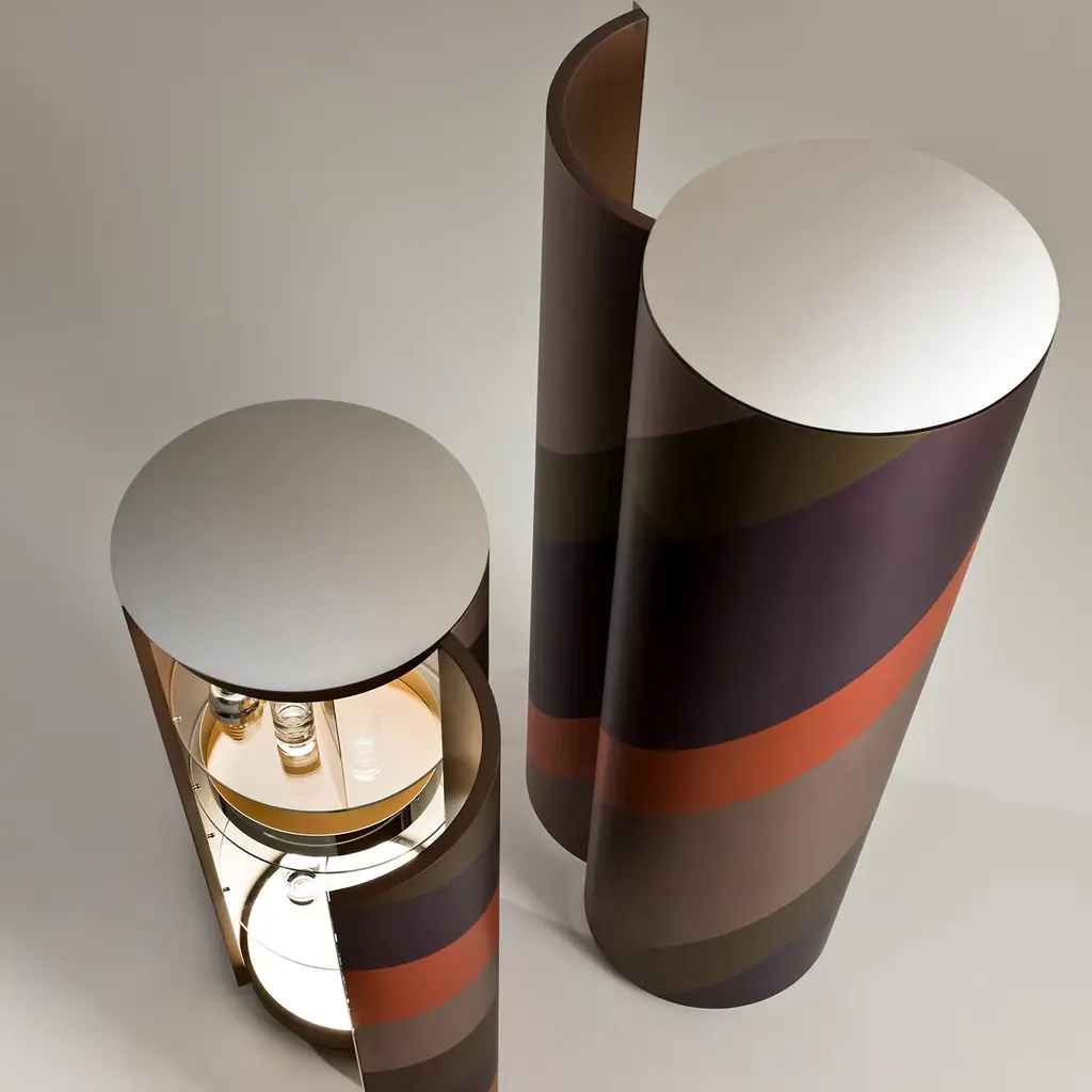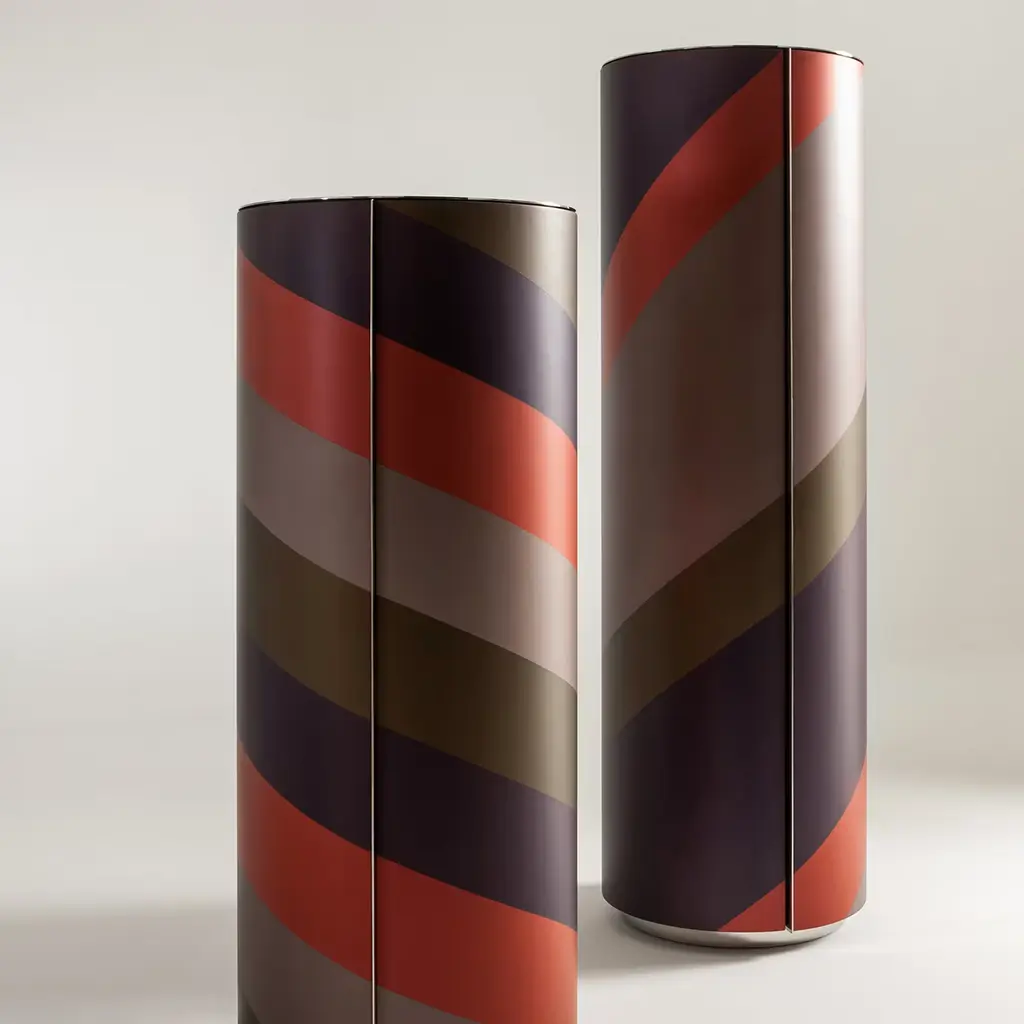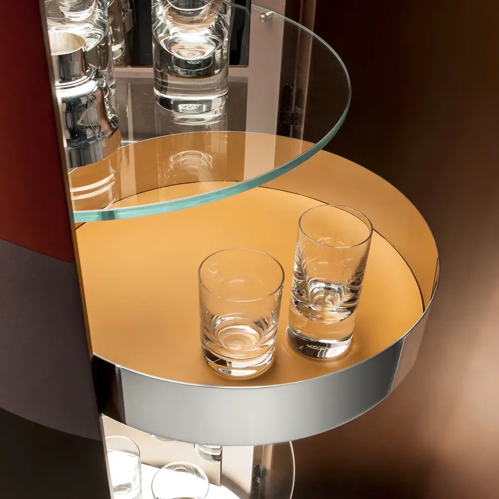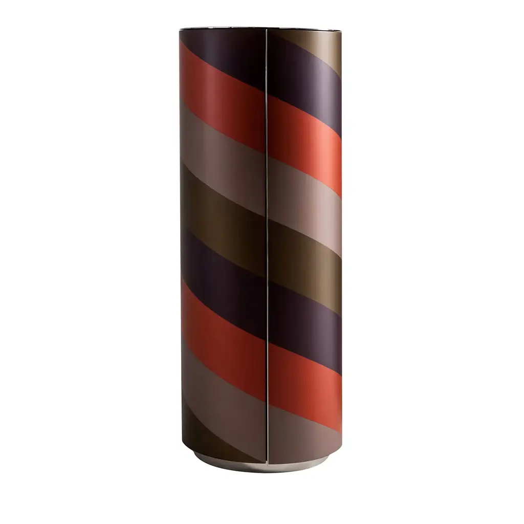 Storing away items becomes creative as well as beautiful with this creative cylindrical, wooden storage unit that opens up in the front. This piece, which is available in three different heights, contains circular glass shelves, rotating stainless steel shelves, and is illuminated inside. The outside of this unique piece has a multicolored lacquered finish.