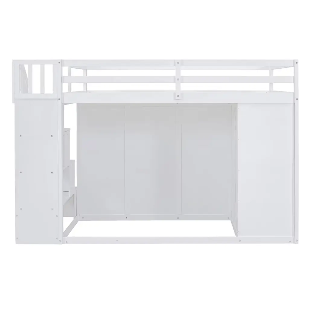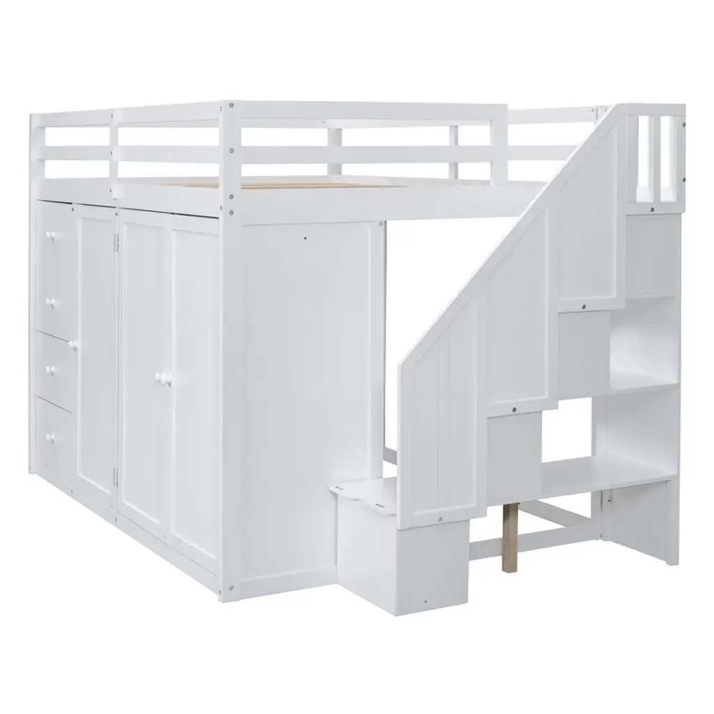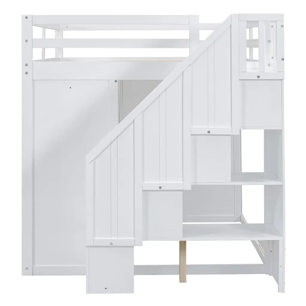 Elevate your living space with the Loft Bed, a stylish and functional addition to any bedroom. Crafted from high-quality wood, this bed is built to last. The sturdy construction ensures stability and safety, while the sleek design adds a touch of modern elegance to any room. This multifunctional bed is perfect for maximizing space in any bedroom. The loft design allows for ample storage underneath, while the built-in staircase provides easy access to the bed and doubles as a storage unit. The open wardrobe and staircase can be easily interchanged, allowing you to customize the layout to suit your space and preferences. This flexibility ensures that the bed fits seamlessly into any room.Product Detail:- Product Type:Loft Bed- Size:Full- Overall Product Dimension:93.3"L x 57.6"W x 61.4"H- Overall Product Weight:330.33 LBS- Detail Dimension: Please refer to the Size picture- Weight Capacity: 600 LBS- Material: Pinewood+MDF- Recommended Mattress Thickness: 6"-8" (The mattress is not included)- Number of Packages: 3 (Packages shipped separately may not arrive at the same time, please be patient.)- Assembly Required:YesWhat's in the box:- Bed * 1- Tools included- Instruction manual
