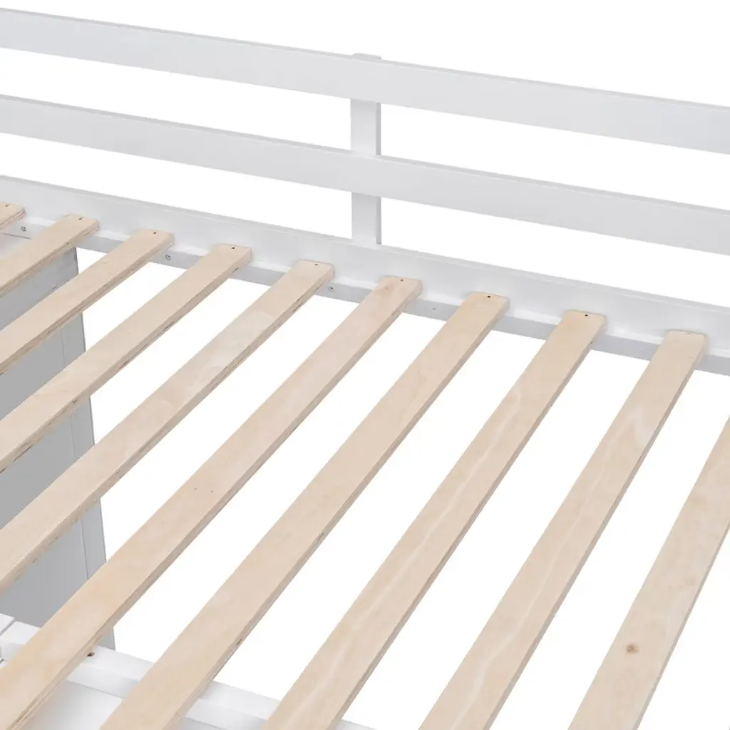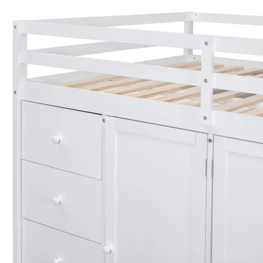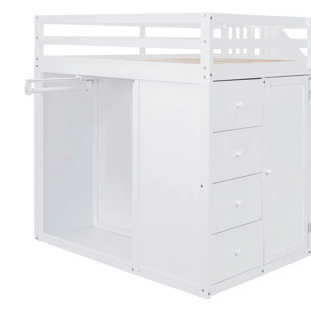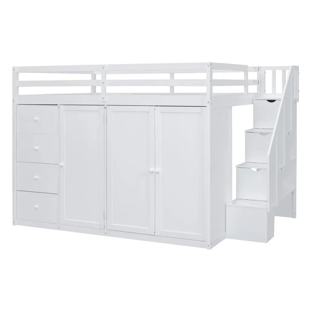 Elevate your living space with the Loft Bed, a stylish and functional addition to any bedroom. Crafted from high-quality wood, this bed is built to last. The sturdy construction ensures stability and safety, while the sleek design adds a touch of modern elegance to any room. This multifunctional bed is perfect for maximizing space in any bedroom. The loft design allows for ample storage underneath, while the built-in staircase provides easy access to the bed and doubles as a storage unit. The open wardrobe and staircase can be easily interchanged, allowing you to customize the layout to suit your space and preferences. This flexibility ensures that the bed fits seamlessly into any room.Product Detail:- Product Type:Loft Bed- Size:Full- Overall Product Dimension:93.3"L x 57.6"W x 61.4"H- Overall Product Weight:330.33 LBS- Detail Dimension: Please refer to the Size picture- Weight Capacity: 600 LBS- Material: Pinewood+MDF- Recommended Mattress Thickness: 6"-8" (The mattress is not included)- Number of Packages: 3 (Packages shipped separately may not arrive at the same time, please be patient.)- Assembly Required:YesWhat's in the box:- Bed * 1- Tools included- Instruction manual