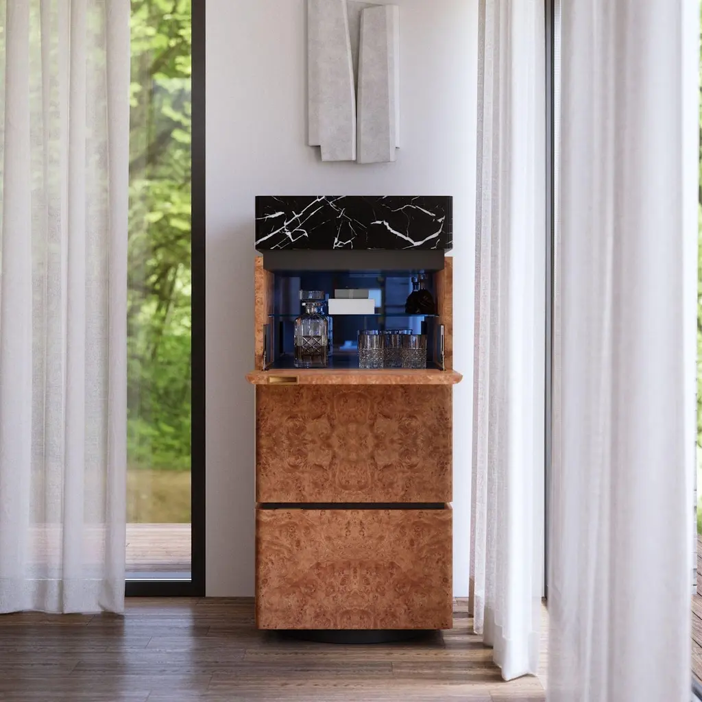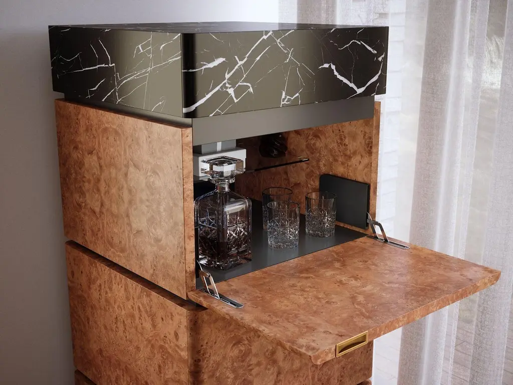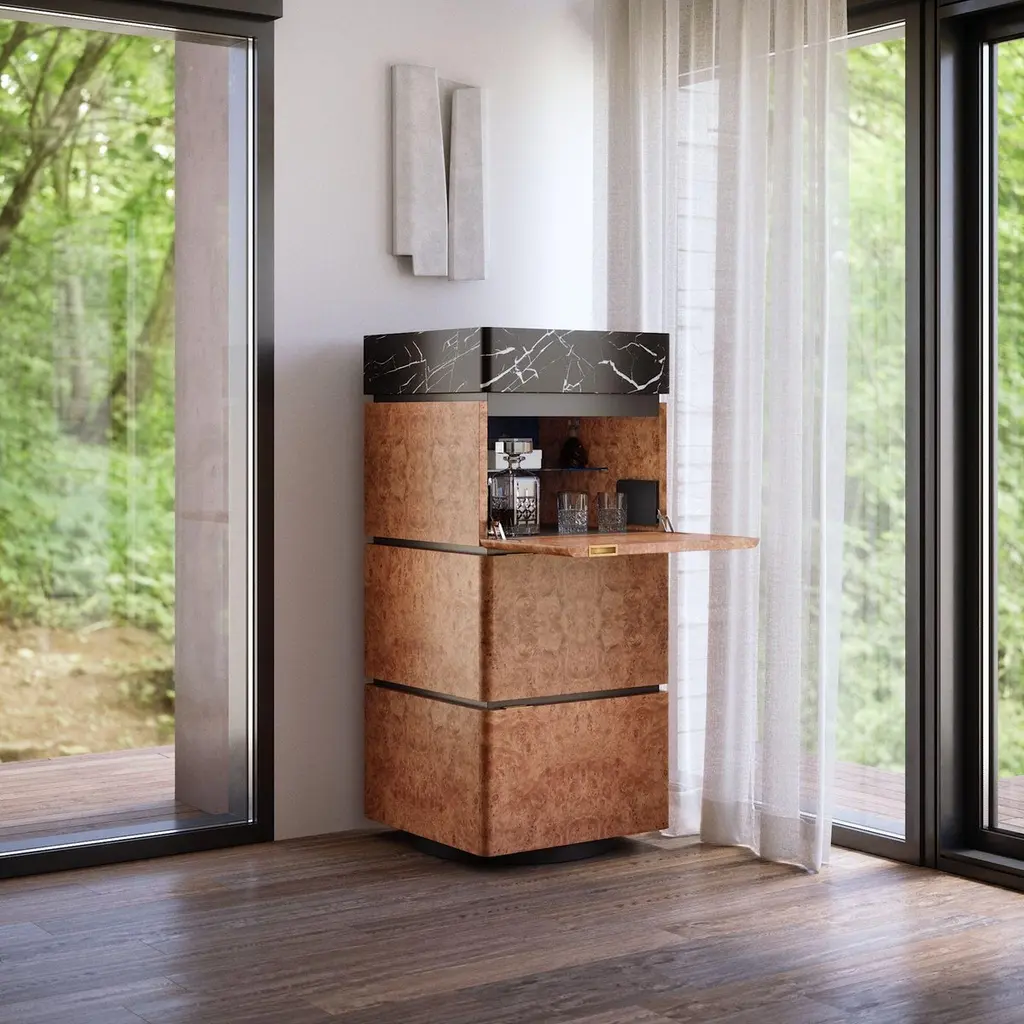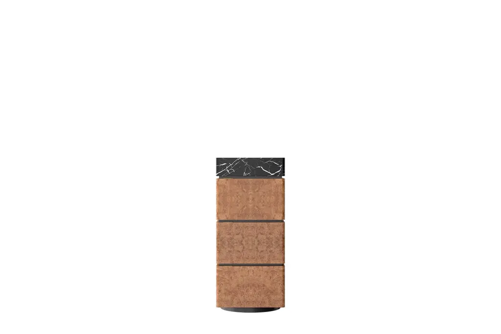 Chestnut Burl and Marble Charlie RC Cabinet by UltramobiliDimensions: W 60 x D 60 x H 136 cmMaterials: Chestnut Burl, Marble. Column storage unit in Chestnut Burl (Radica di Castagno) with marble segment with drawer, two doors and BAR segment with flap door, back mirror and glass shelfUltramobili:Tactile materials and exclusive finishes, advanced functionality and uncompromising quality define the character and soul of each creation, the best business card with which ULTRAMOBILI furnishings present themselves to the world. ULTRAMOBILI collaborates with a group of highly selected craftsmen, closely connected to their home territory, Pesaro. It is from their manufacturing skills that all the brand's furnishings take shape, in a continuous exchange of skills that focuses on design ability and the intelligence of the hands. ULTRAMOBILI employs an international team of designers who every day imagine, design and create - with talent and passion, dedication and visionary spirit - all the brand's furniture: architectural sculptures that become iconic objects and furnishings for living. ULTRAMOBILI's credo is quality without compromise. An uncompromising vision that expresses itself every day in the choice of excellent materials and finishes, in the obsessive care for every single detail, in the constant search for advanced functionality and in the incessant striving for cutting-edge, unique and unmistakable design. ULTRAMOBILI also produces tailor-made projects, ad hoc creations capable of meeting the most intimate and profound needs of those who enter the brand's universe. Bespoke furnishings that are born in close connection with the architectural envelope that houses them, and that dialogue with the surrounding environment in the volumetric relationships of their components, in the materiality and colour nuances of the materials, in the chiaroscuro effects of the volumes and in the visual communicativeness that distinguishes them.