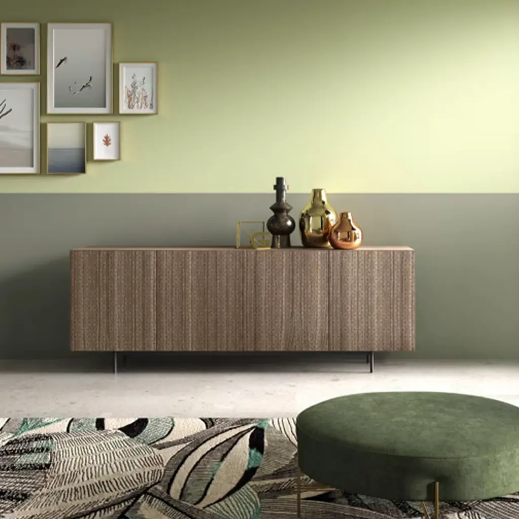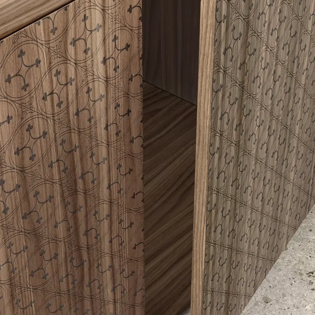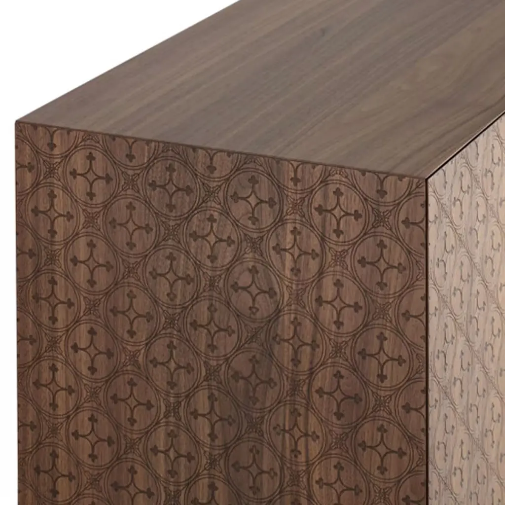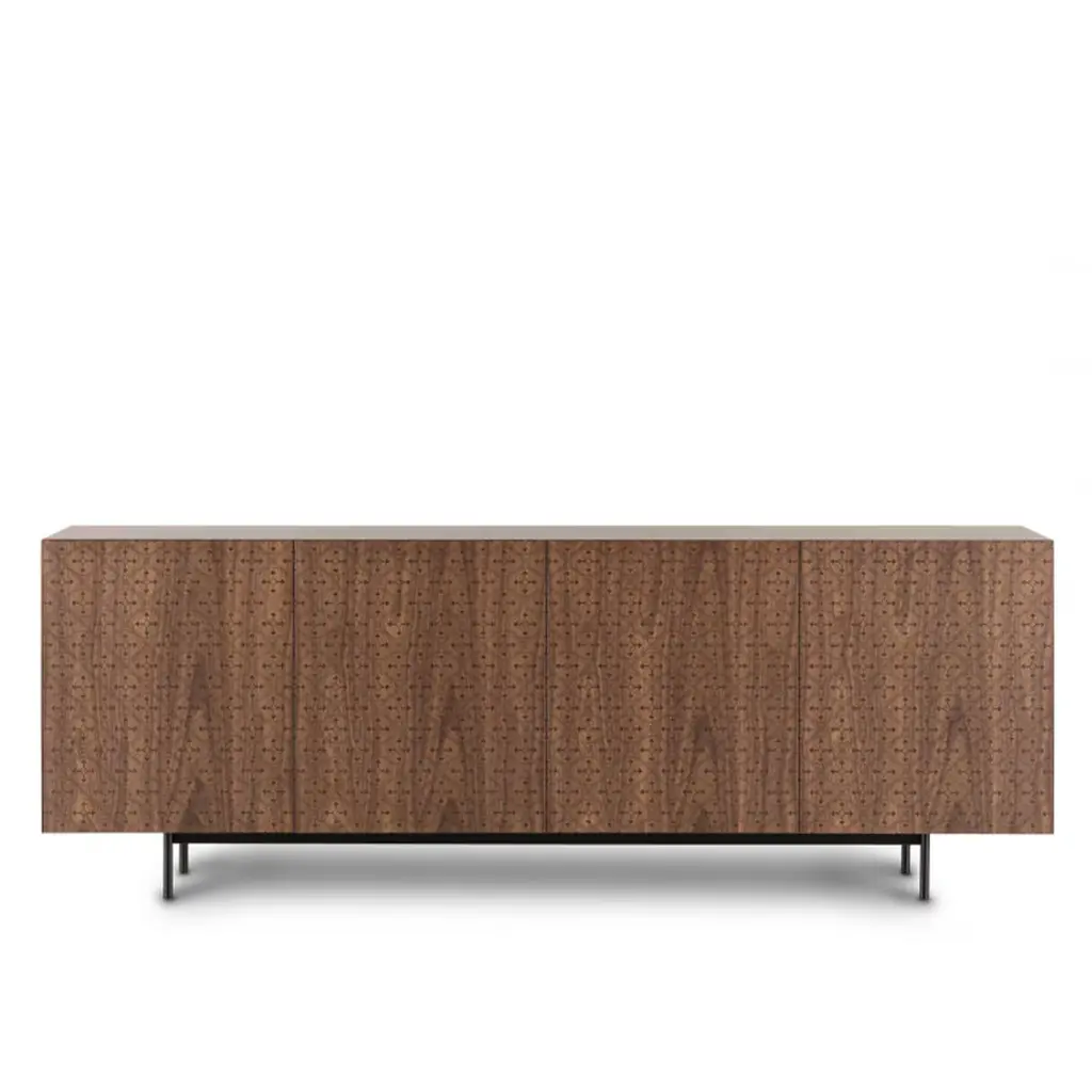 Redefining classic silhouettes, this multi-purpose sideboard is a marvel for a living room, entryway, or bedroom decor. Entirely made of Canaletto walnut wood with the collection's trademark geometric motif, the piece has four distinct storage units providing ample storage. Responding to sophisticated modern aesthetics, it's an elegant solution for those who cherish their living spaces. Measures L 216 x H 78 x P 45 cm. Please contact the Concierge for further details.
