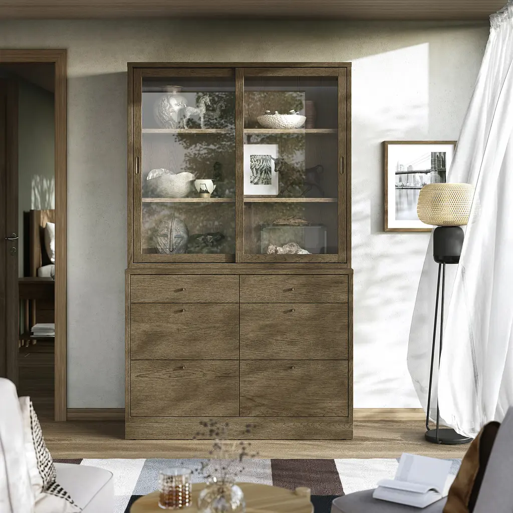 TONSTAD Storage combination with drawers - brown stained oak veneer/glass 47 1/2x18 1/2x82 5/8 ". This combination has both hidden and open storage, so you can choose what to display. The wide chest of drawers has 2 smaller and 4 larger drawers where you can neatly organize your things.
