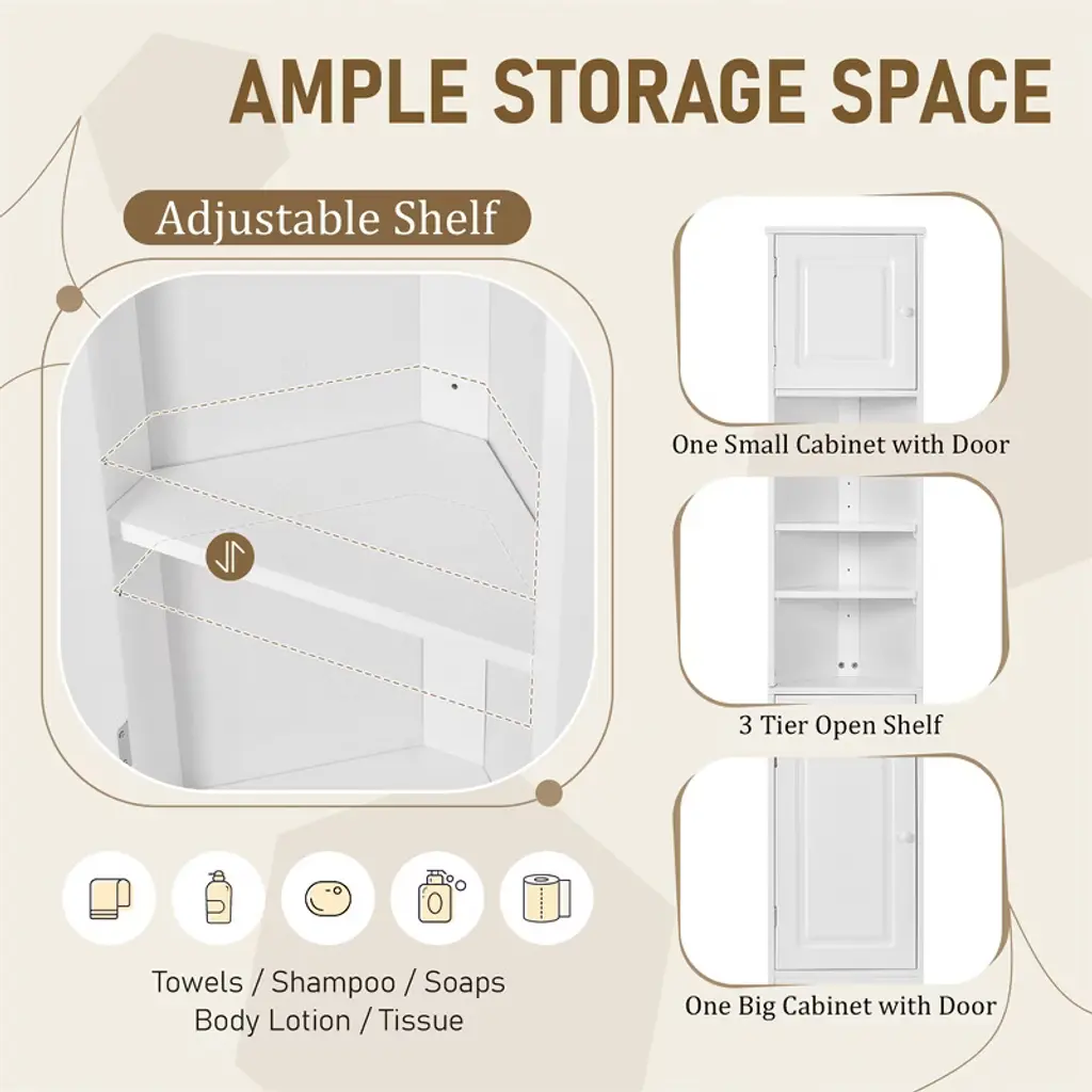 Crafted from durable MDF with a waterproof white finish, this triangular cabinet maximizes unused corner space while resisting moisture damage. The elegant design features grooved door patterns and curved base detailing, complemented by wooden knobs and magnetic closures for smooth operation. Its sturdy construction ensures years of reliable bathroom organization.