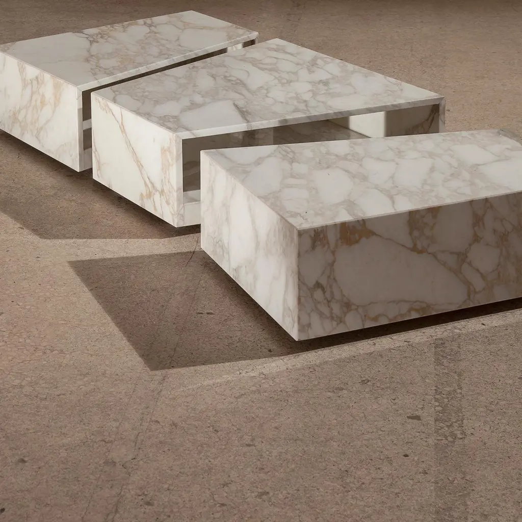 This majestic coffee table is not only a striking object of functional decor but doubles as a storage unit. The bold profile is composed of three pieces equipped with rollable wheels, made of white Calacatta marble, showcasing its singular thick gray veining. The tables can also be made in white Carrara marble, Bardiglio Imperiale stone, and lava stone.
