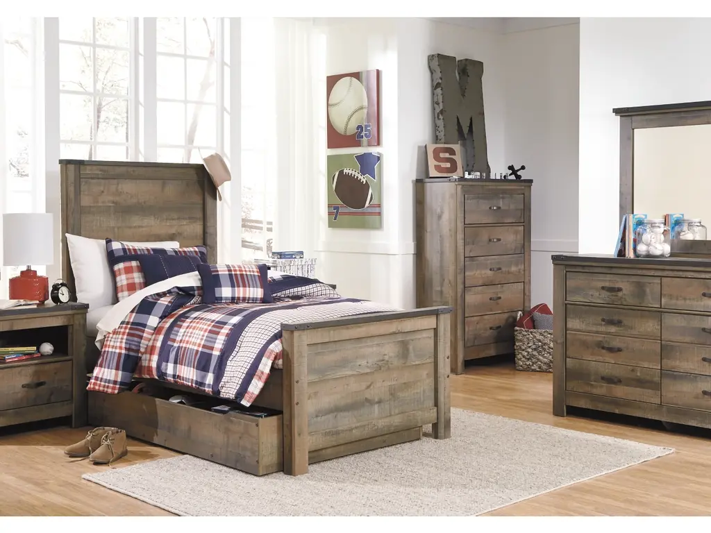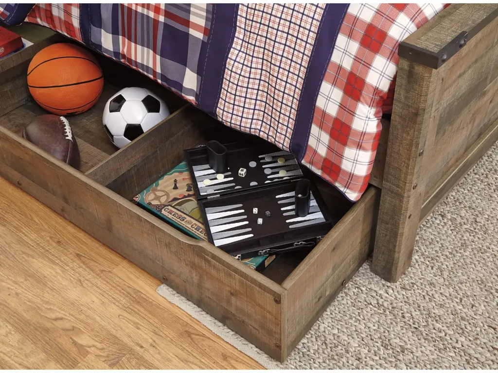 If you love country living, the Trinell twin panel bed with storage matches your authenticity. Its rustic finish, plank-style details and nailhead trim pay homage to reclaimed barn wood, making for a chic look loaded with charm. The under bed storage unit includes two dividers to accommodate everything from toys and games to books and bedding.