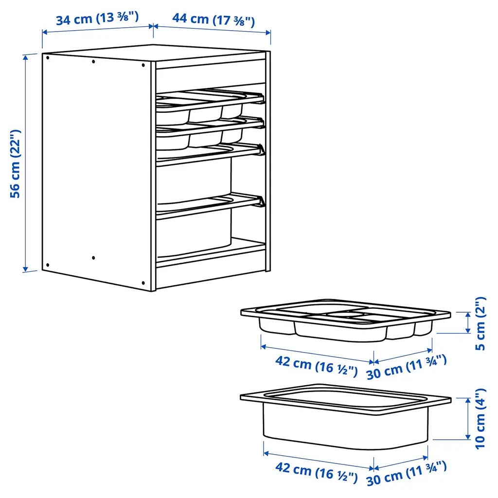 TROFAST Storage combination w boxes/trays - gray/white 13 3/8x17 3/8x22 ". This sturdy and spacious storage solution makes it easier for your child to organize and keep everything in order. Low storage makes it easier for children to reach and organize their things. Guide rails included.