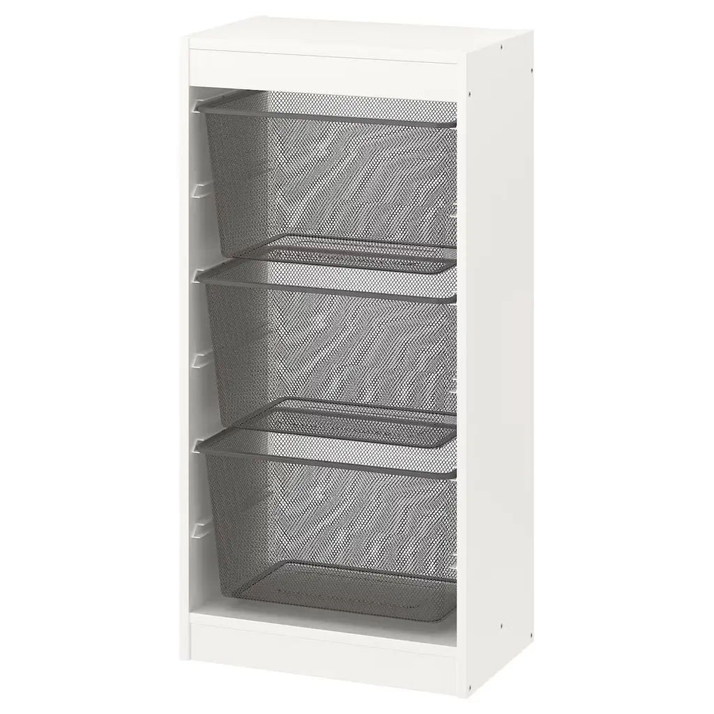TROFAST Storage combination with boxes - light white stained pine green-gray/gray-blue 17 3/8x11 3/4x35 7/8 ". With the frames and mesh storage boxes in the TROFAST series, you can customize a storage solution that takes care of big and small things, even in other parts of the home.