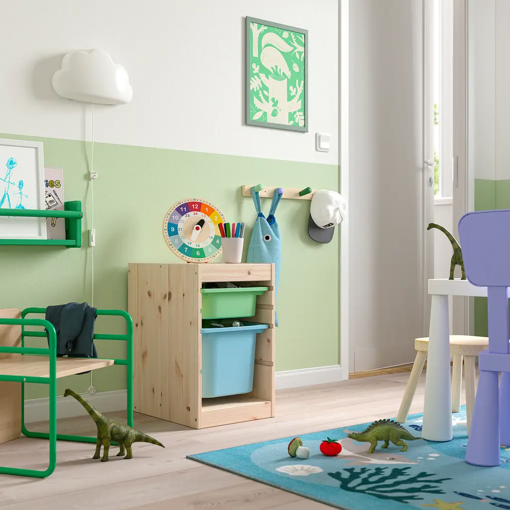 TROFAST Storage combination with boxes - light white stained pine light green/light blue 12 5/8x17 3/8x20 1/2 ". A playful and sturdy storage series for storing and organizing toys. The frame has several grooves, so you can place boxes and shelves where you want them, and change them any time.