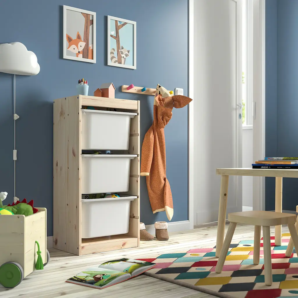 TROFAST Storage combination with boxes - light white stained pine/white 17 3/8x11 3/4x35 7/8 ". A playful and sturdy storage series for storing and organizing toys. The frame has several grooves, so you can place boxes and shelves where you want them, and change them any time.