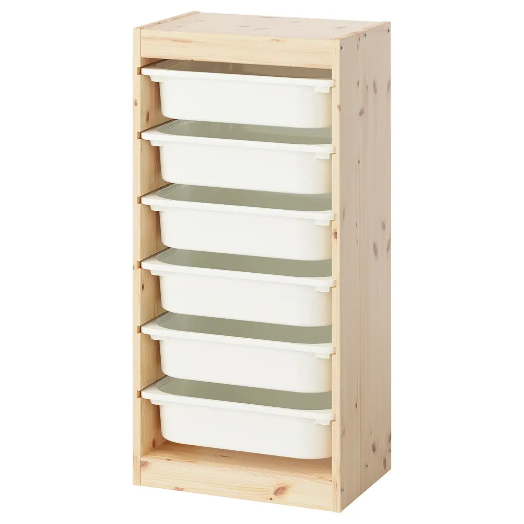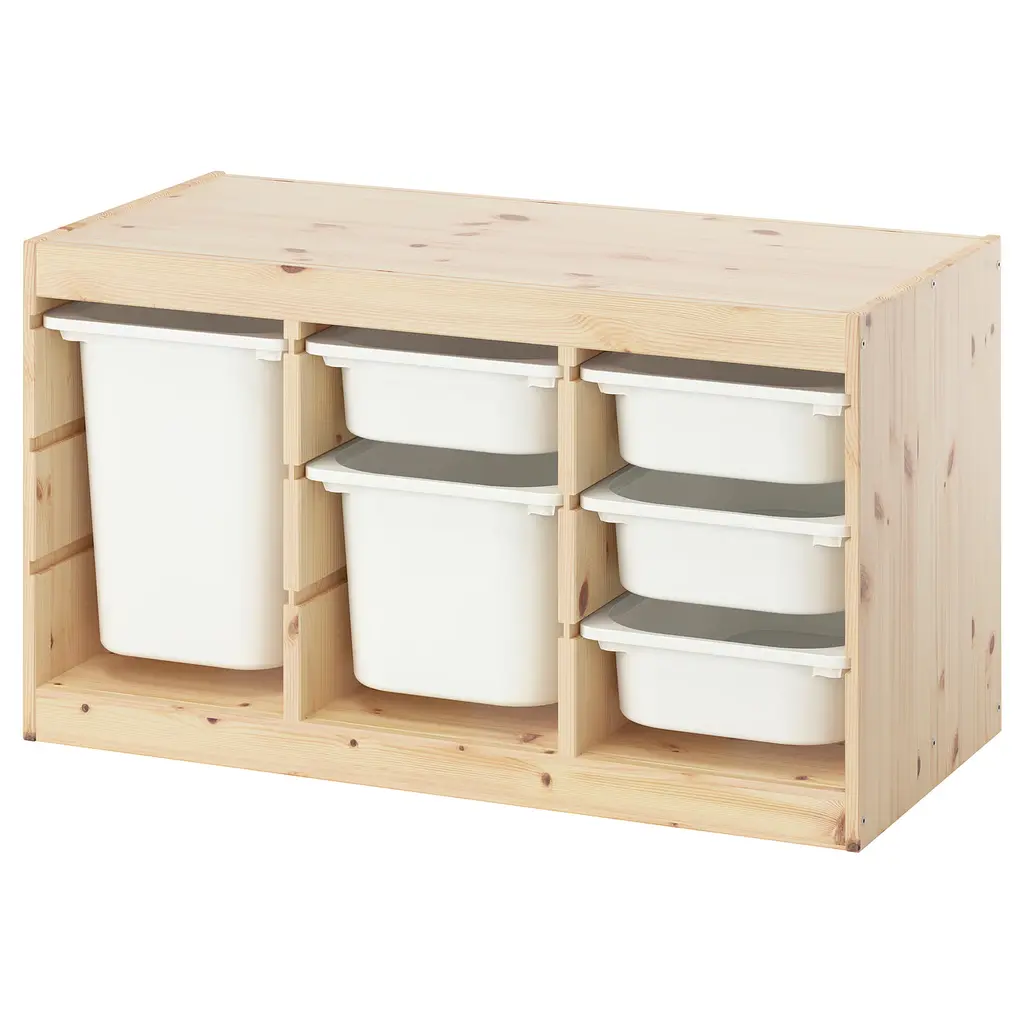 TROFAST Storage combination with boxes - light white stained pine/white 36 5/8x17 3/8x20 1/2 ". A playful and sturdy storage series for storing and organizing toys, sitting, playing, and relaxing. Low storage makes it easier for children to reach and organize their things.