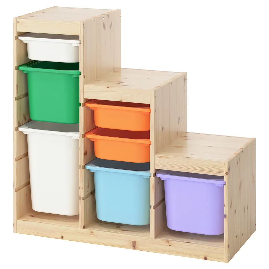 TROFAST Storage combination with boxes - white white/multicolor 39x17 3/8x37 ". A playful and sturdy storage series for storing and organizing toys. The frame comes with guide rails, so you can place boxes and shelves where you want them, and change them any time. Guide rails included.