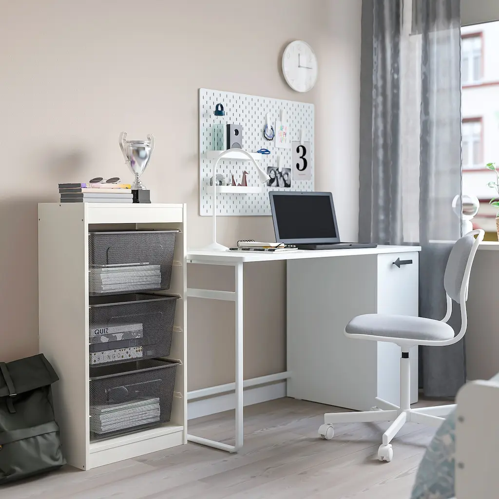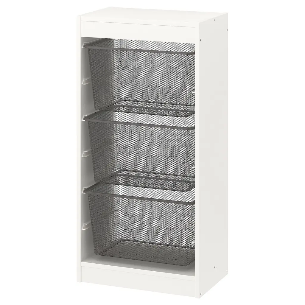 TROFAST Storage combination with boxes - white/dark gray 18 1/8x11 3/4x37 ". This sturdy and spacious storage solution makes it easier for your child to organize and keep everything in order. The mesh storage boxes give the storage combination a cool look that goes well in a teenager’s bedroom.