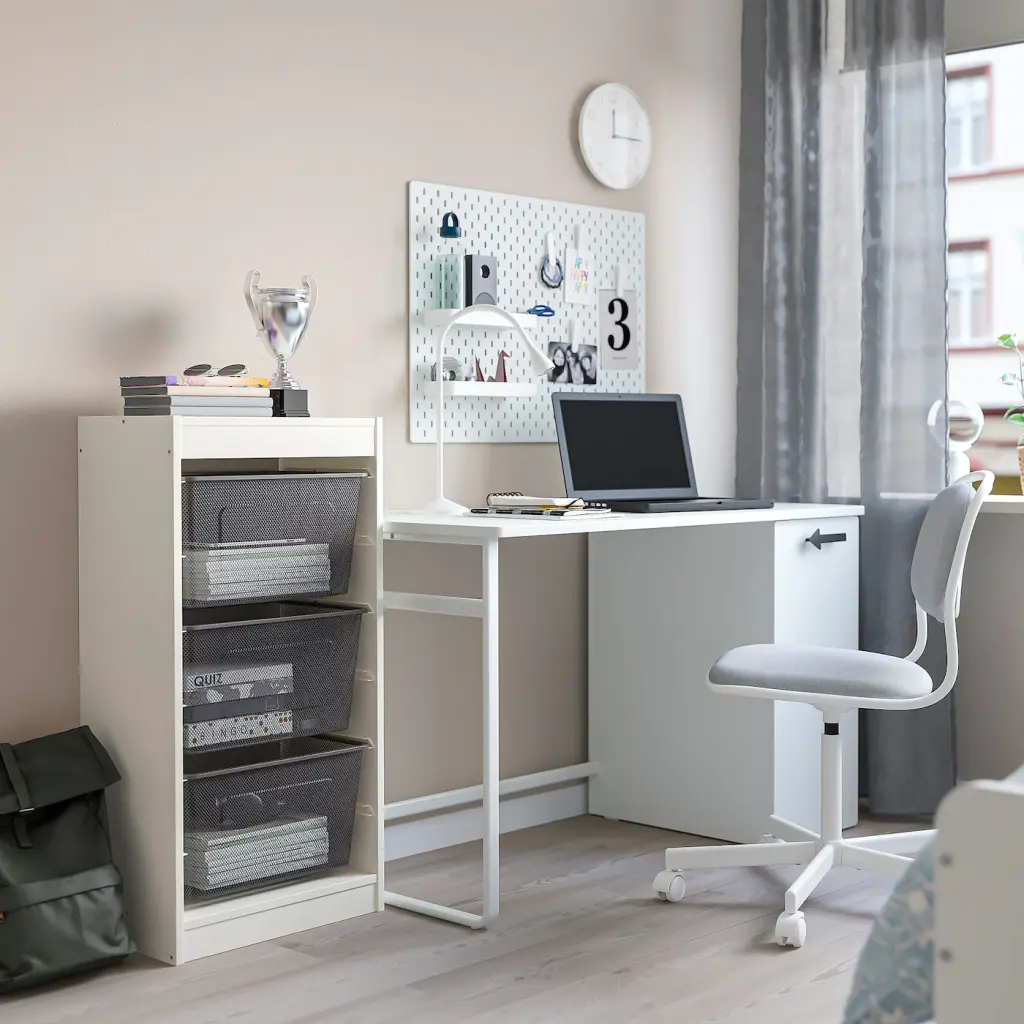 TROFAST Storage combination with boxes - white/dark gray 18 1/8x11 3/4x37 ". WARNING! Prevent tip-over injury or death. Furniture with included restraints must be secured to the wall according to the product’s assembly instructions. Recommended for indoor use only. Not approved for food contact.