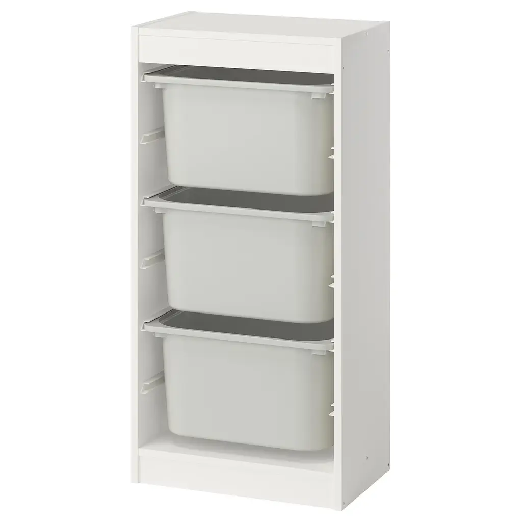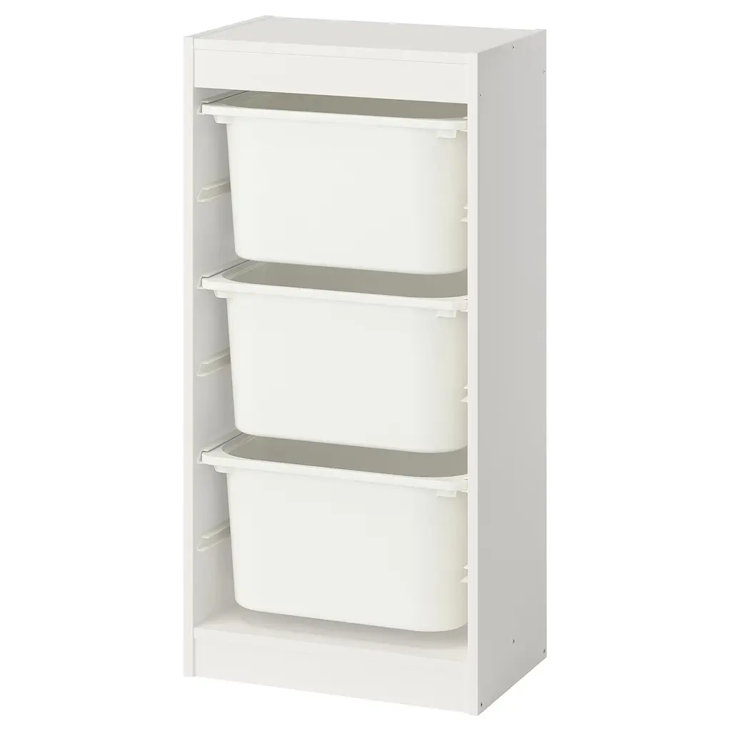 TROFAST Storage combination with boxes - white/white 18 1/8x11 3/4x37 ". A playful and sturdy storage series for storing and organizing toys. The frame comes with guide rails, so you can place boxes and shelves where you want them, and change them any time. Guide rails included.