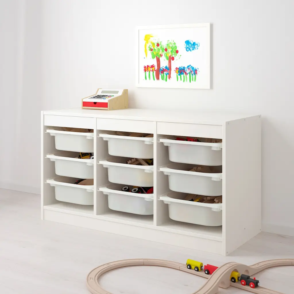 TROFAST Storage combination with boxes - white/white 39x17 3/8x22 ". A playful and sturdy storage series for storing and organizing toys, sitting, playing, and relaxing. The frame has several grooves, so you can place boxes and shelves where you want them, and change them any time.