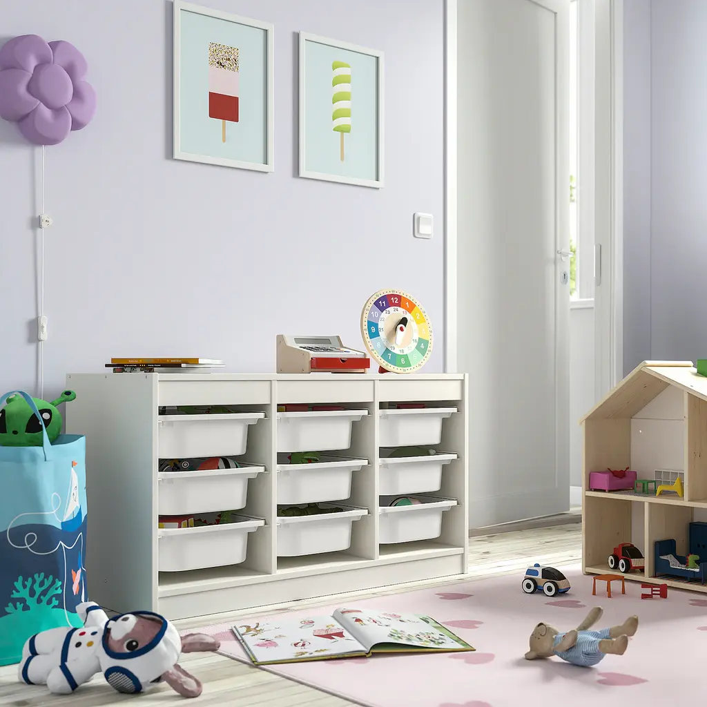 TROFAST Storage combination with boxes - white/white 39x17 3/8x22 ". A playful and sturdy storage series for storing and organizing toys, sitting, playing, and relaxing. The frame has several grooves, so you can place boxes and shelves where you want them, and change them any time.